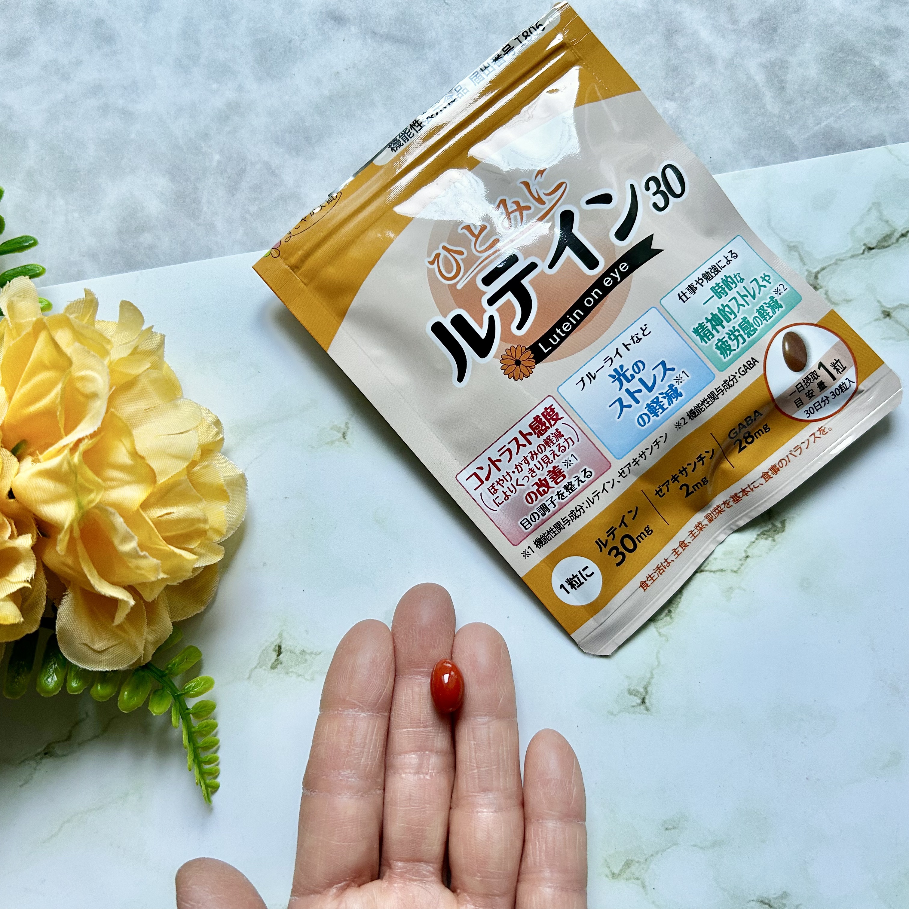 機能関与成分のルテイン、ゼアキサンチン配合 ブルーライトなどの光のストレスの軽減して、コントラスト感度をサポートしてくれるサプリメント つるんと丸みのある形状なので飲みやすく、飲む了解も一日一粒で良いので楽 GABAも入っているので、勉強や仕事による一時的な精神的ストレスを軽減してくれるのも◎