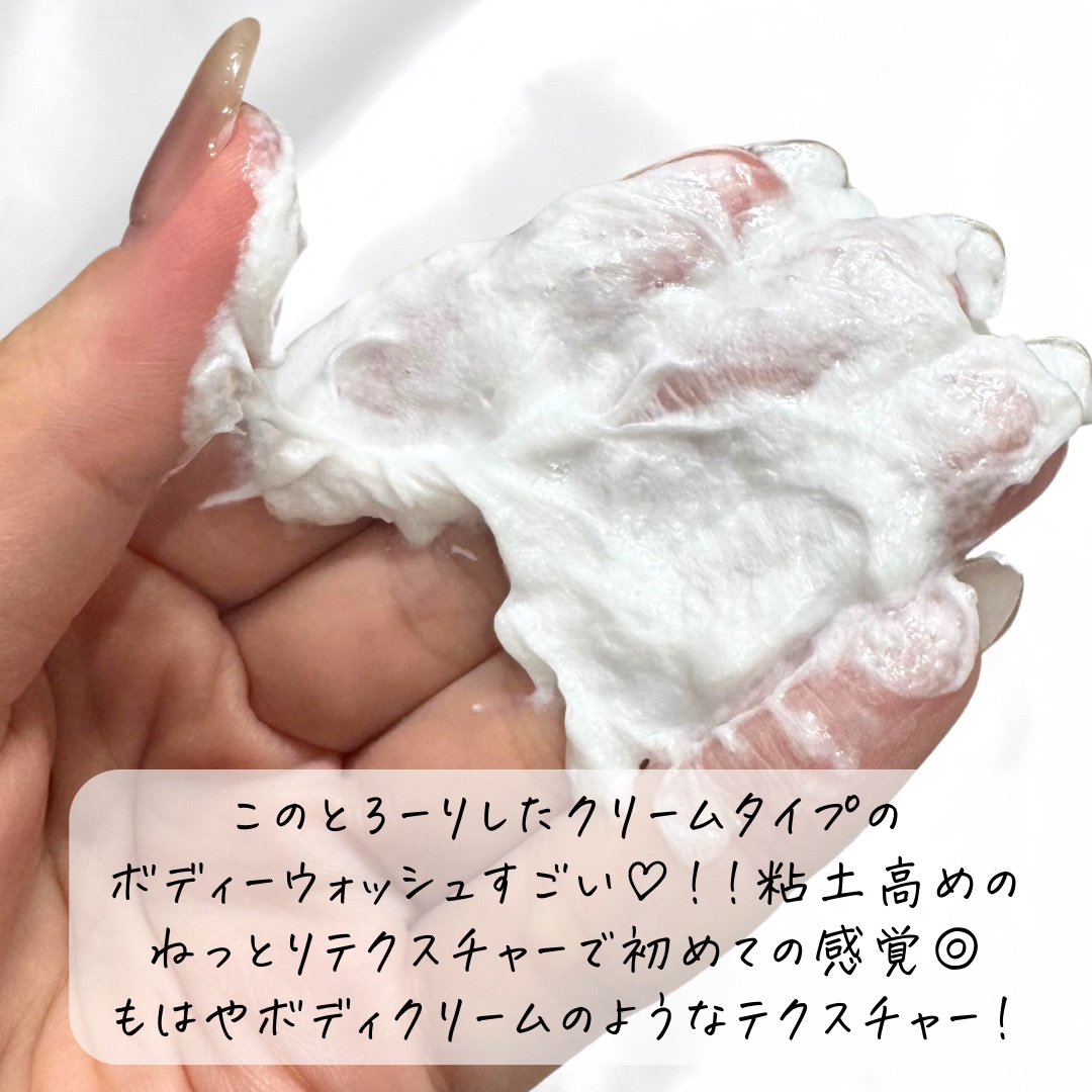 クリームタイプのボディウォッシュ😳! ピンポン玉大を手に取ってそのまま肌に伸ばして洗います👏 ボディクリームがいらないくらいもっちり潤いの洗い上がり🥰! スクラブと混ぜて使ったり泡立てて使うのもおすすめ🙌