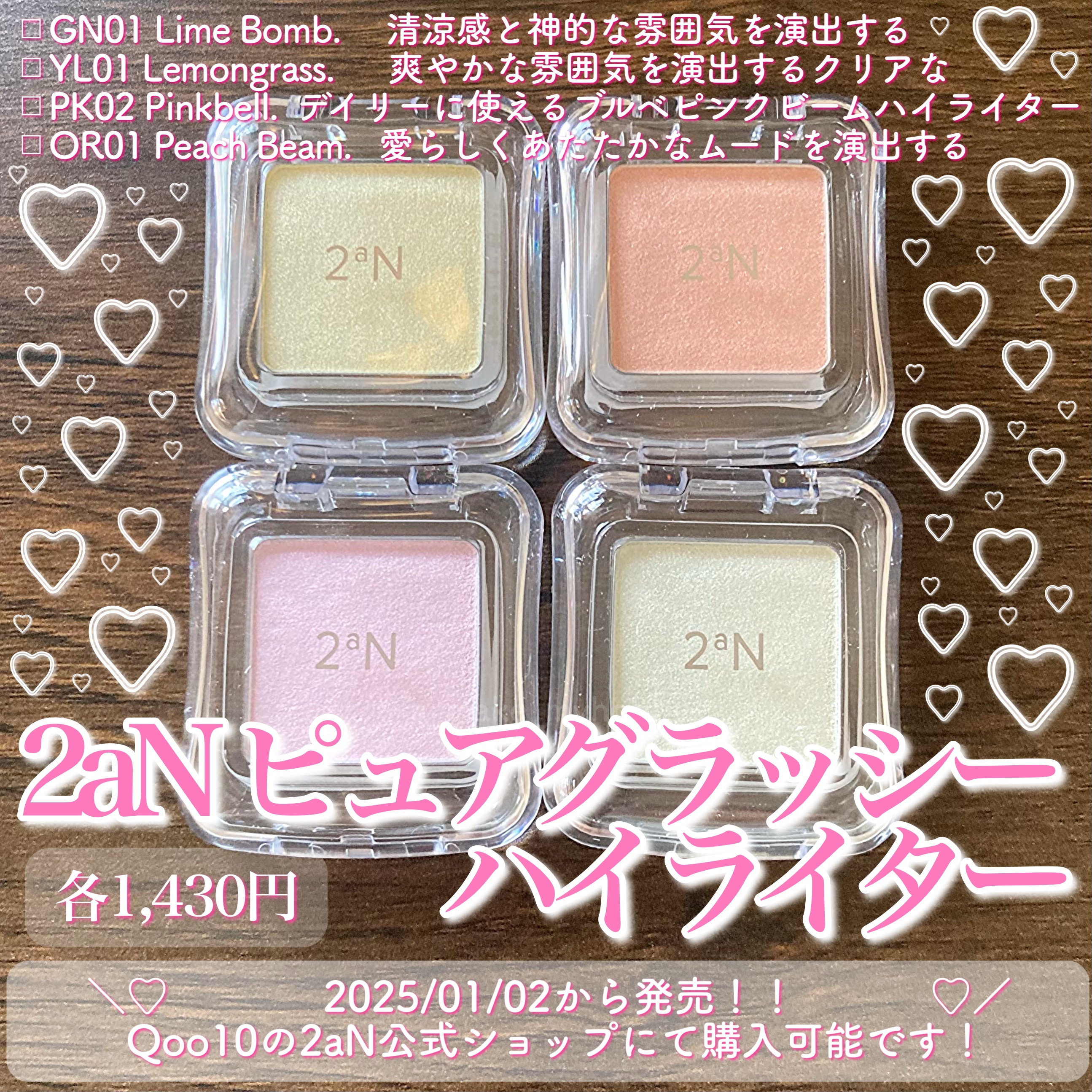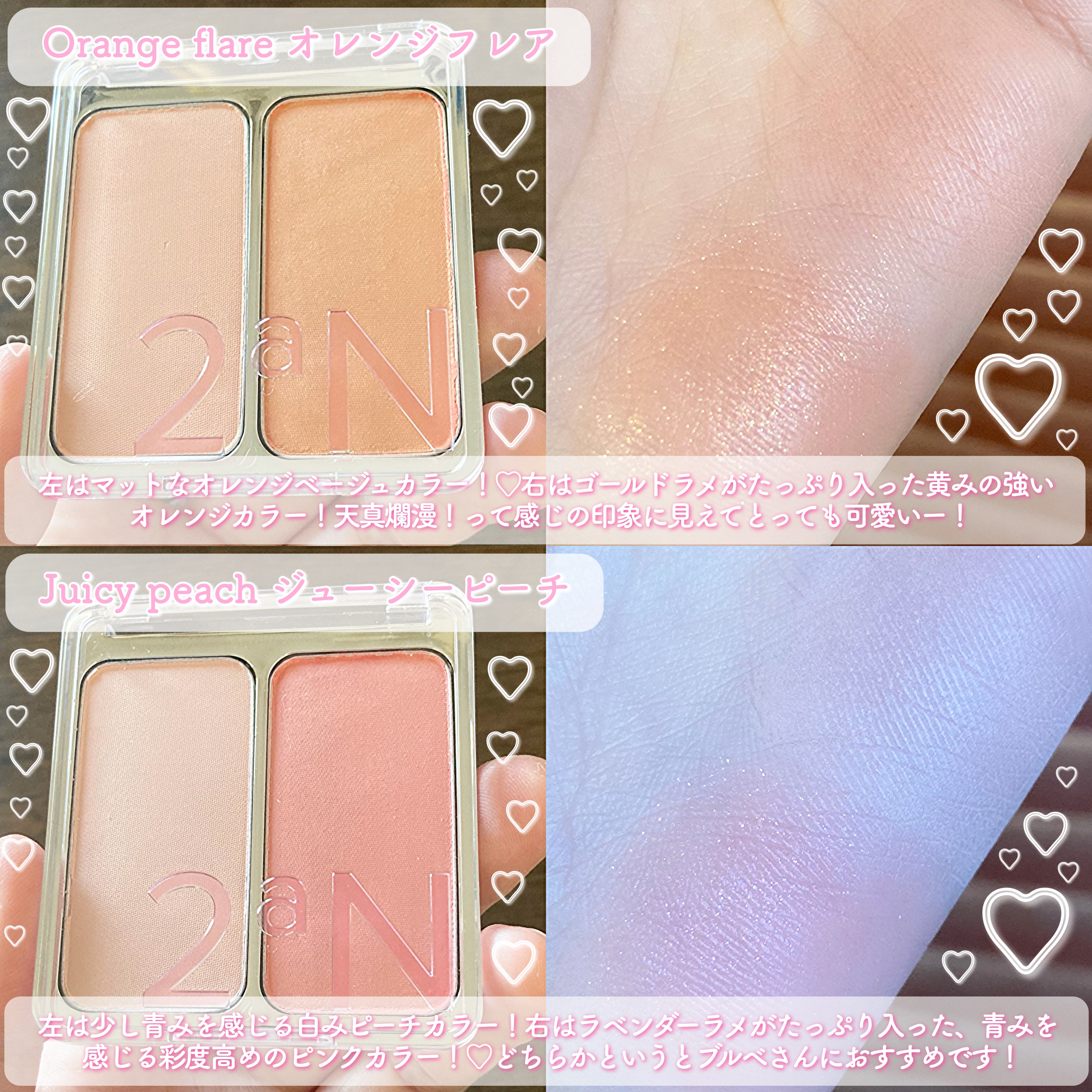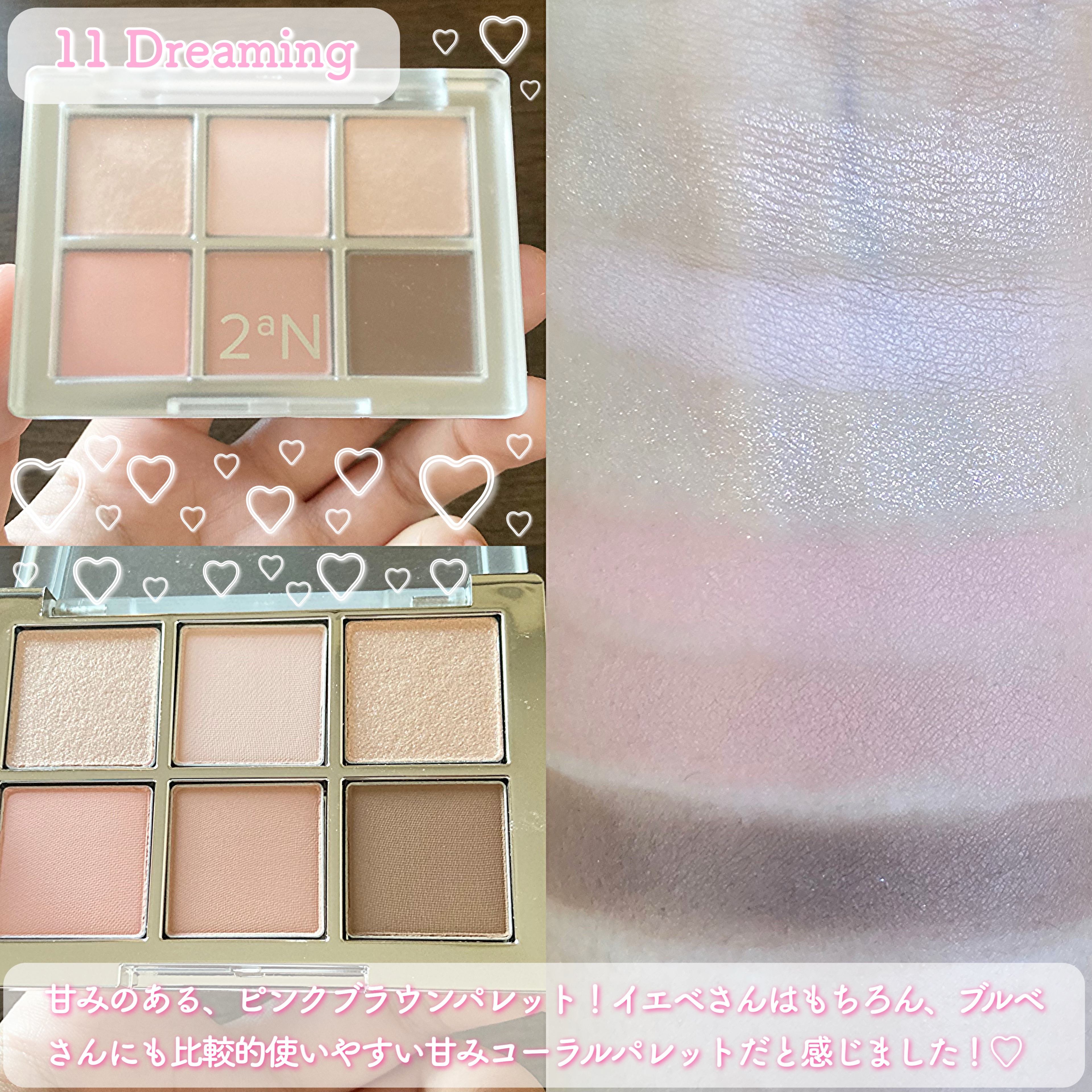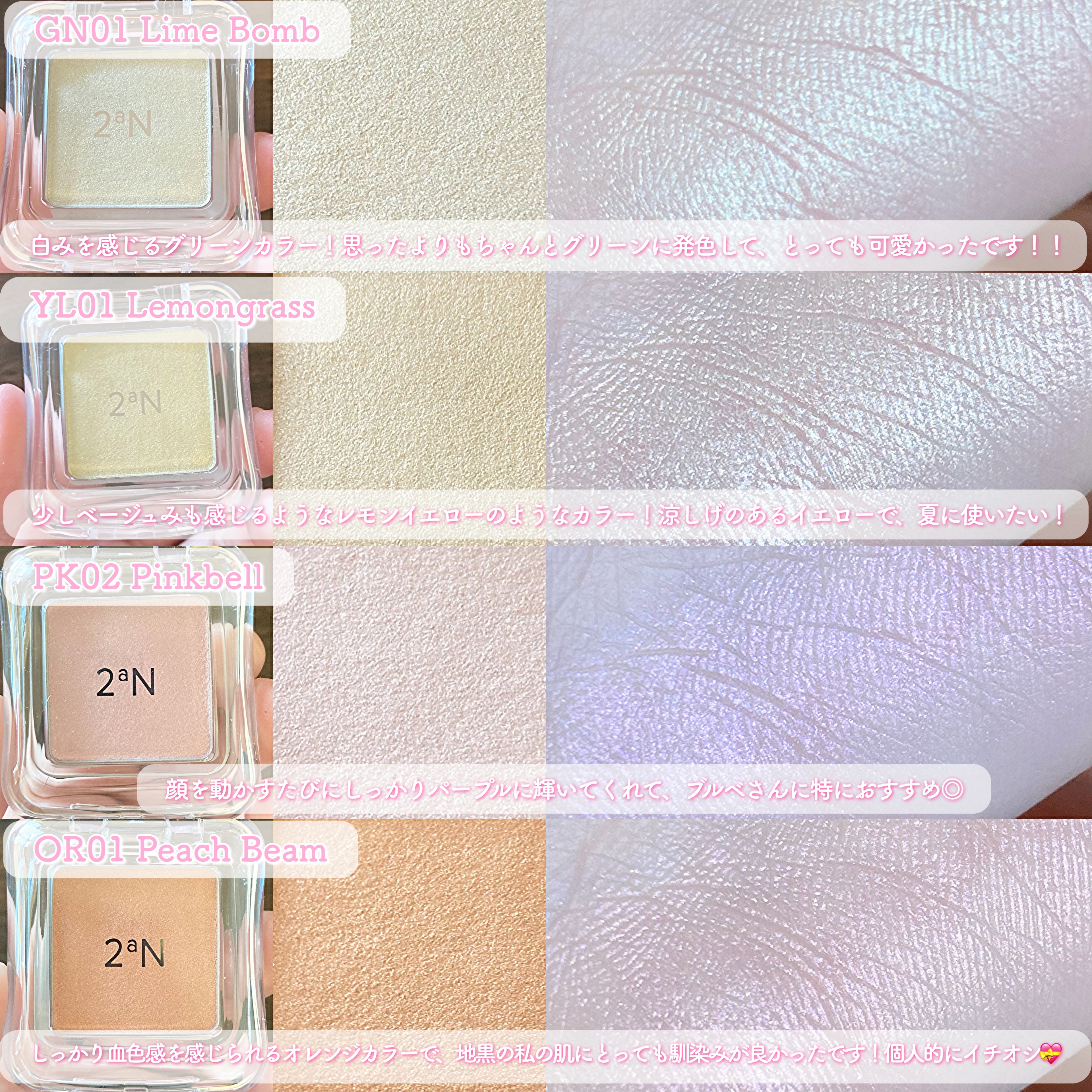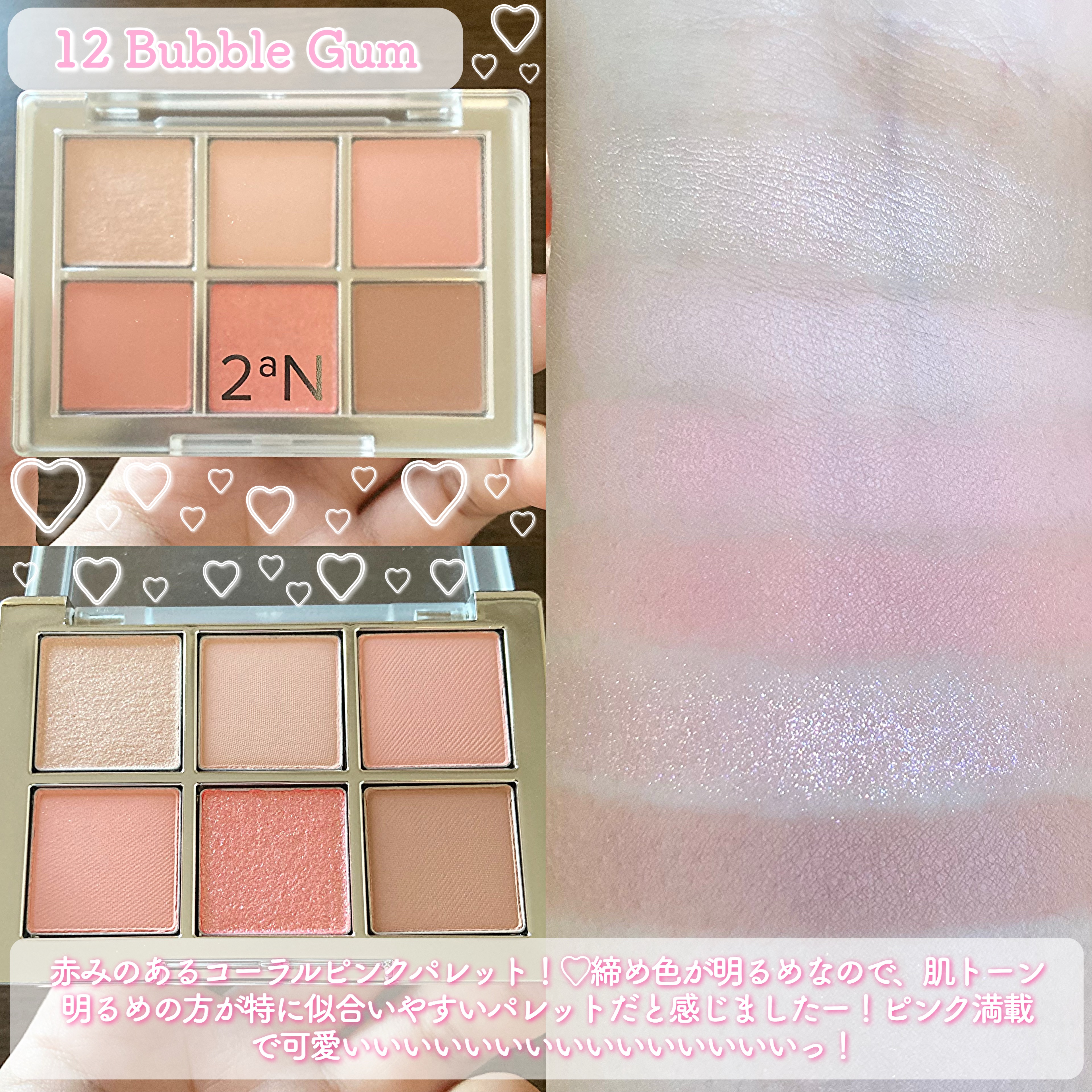春の訪れを感じる新作が登場🌸 全色スウォッチしました✨️ どのパレットも使いやすい配色🥺 締め色が欲しい人は10.11、淡いカラーだけのパレットが好きな人は12がおすすめかな🙆♀️ 春らしい華やかなカラー展開✨️ GN01を目頭にのせたら可愛かった🥺
