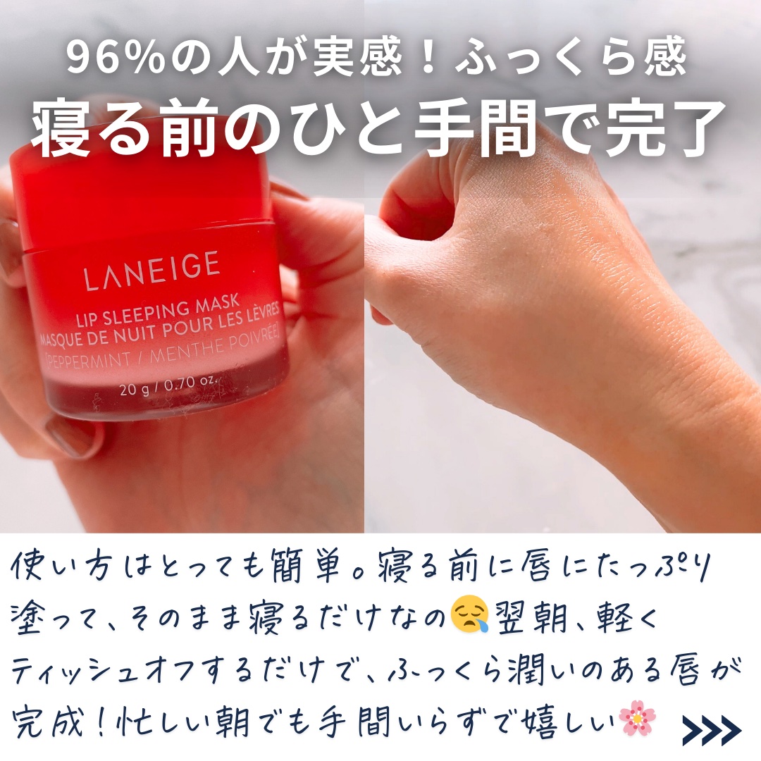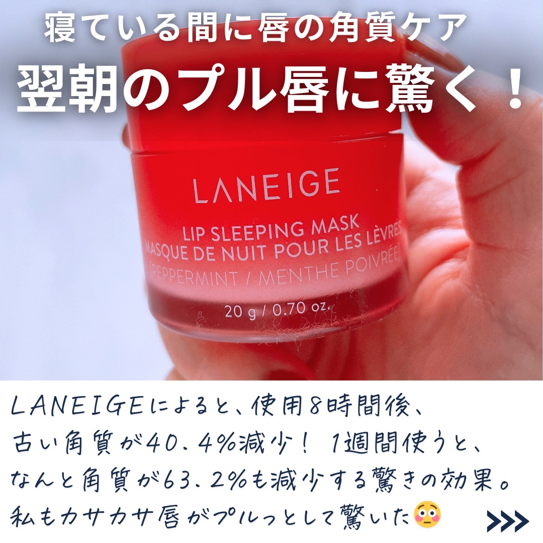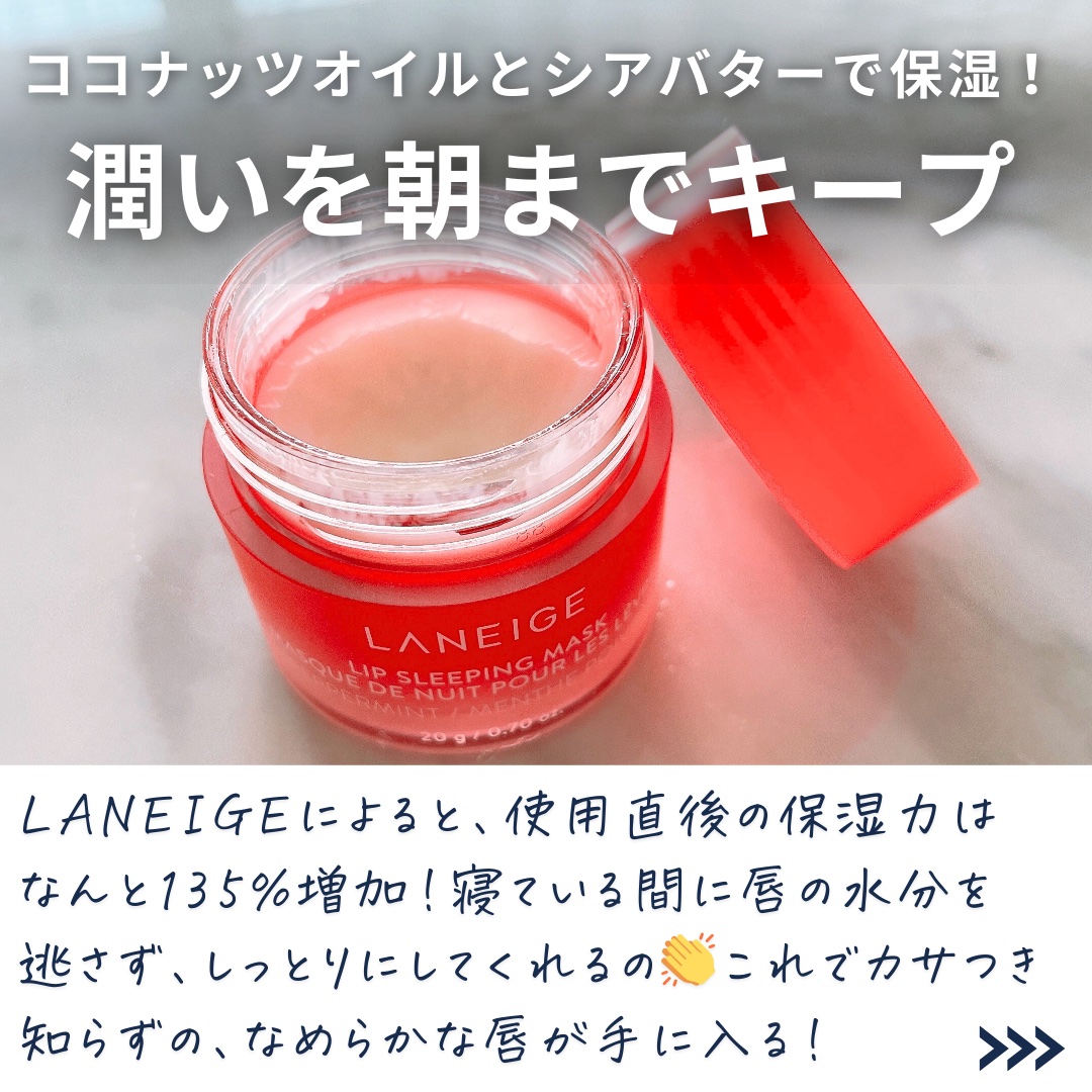 - 寝ている間にケアしてふっくらぷるぷるにうるおった唇へ。 2015年の初代発売以降、世界で2秒に1個売れている*¹LANEIGE大ヒットシリーズ *¹ 2024年グローバル販売実績 1.角質にアプローチするBerryFruitComplex (ベリーフルーツコンプレックス)*²が、 寝ている間に気になる乾燥や角質にうるおいを与え、つやのあるふっくらとうるおった唇に仕上げます。 *²ザクロ果実エキス、ブドウ果実エキス、ラズベリー果実エキス 2.ココナッツオイル(ヤシ油)を配合で、うるおいをあたえ睡眠中の乾燥を防ぎます。 3.今夜はどんな気分?5つのフレーバーから選べるワクワク感。 ■テクスチャー:やさしく馴染むなめらかなバームタイプ ■アレルギーテスト済み*³ *³全ての方にアレルギーが起こらないということではありません。 ■使用方法 寝る前に唇にたっぷり塗り、そのままお休みください。 翌朝、軽くティッシュオフします。付属のスパチュラで塗ることで、より唇の角質に馴染みやすくなります。 日中のリップトリートメントにも使用できます。