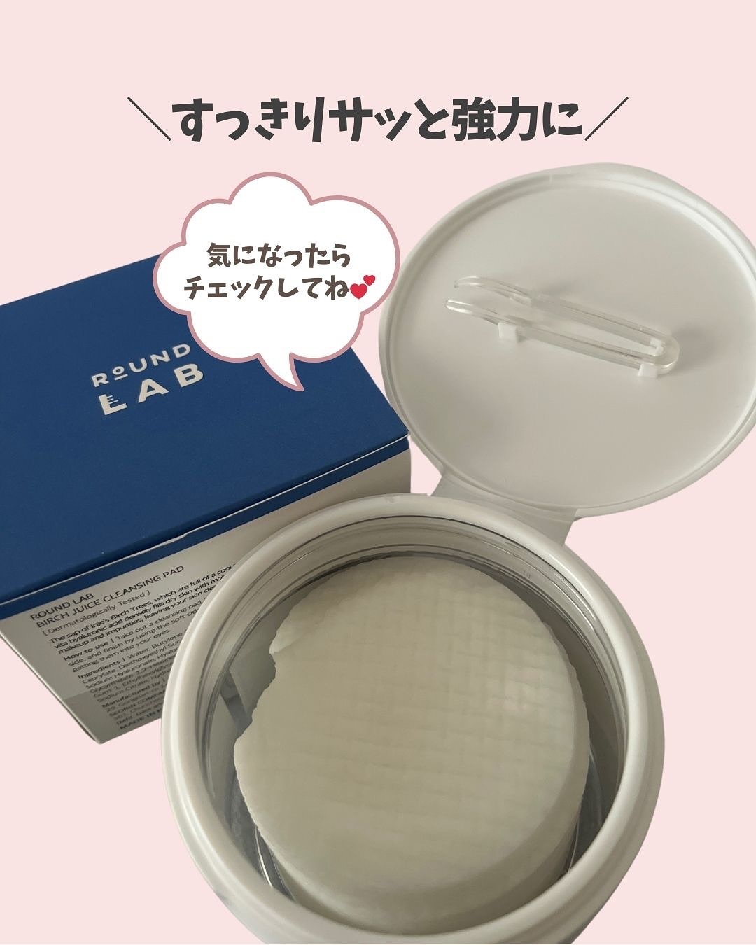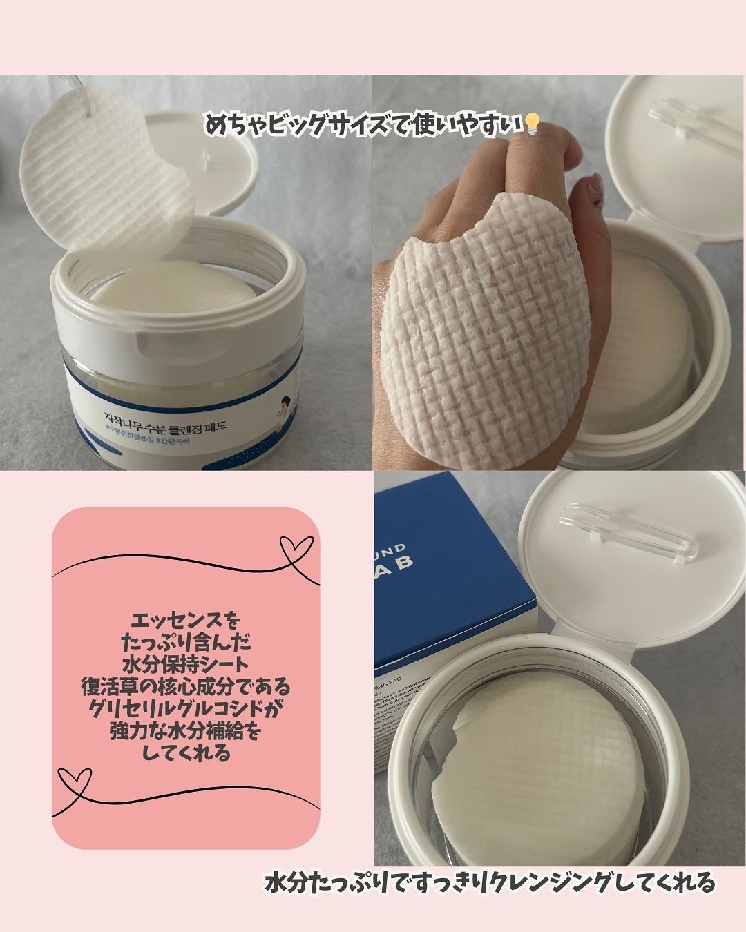弱酸性クレンジングのビッグサイズのパッド✨ 60枚入りと大容量で1枚で顔全体のメイクを拭き取ることができるよ❣️ ポコポコの格子状のシートにエッセンスをたっぷり含んでいて ベタつきなくしっとり😆 疲れた日にソファーでくつろぎながら手軽にメイクオフできるのが嬉しい!!