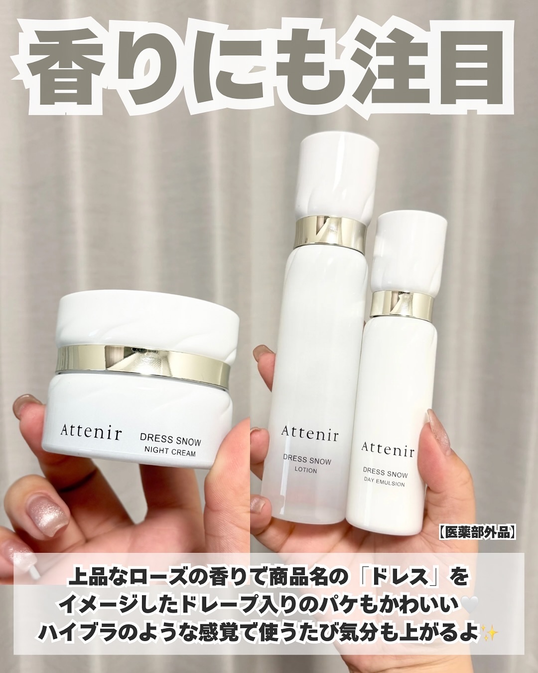シワもシミも気になる大人の肌に! アテニア ドレススノーシリーズを紹介🌟 美白&シワ改善の有効成分としてナイアシンアミドを配合✨ 角層への浸透にこだわった処方で効果が見えにくい大人の肌にしっかりアプローチ💪 現役の化粧品開発者が バズやPRに惑わされずにコスパ良く美肌になるためのスキンケア情報をお届けしています✨