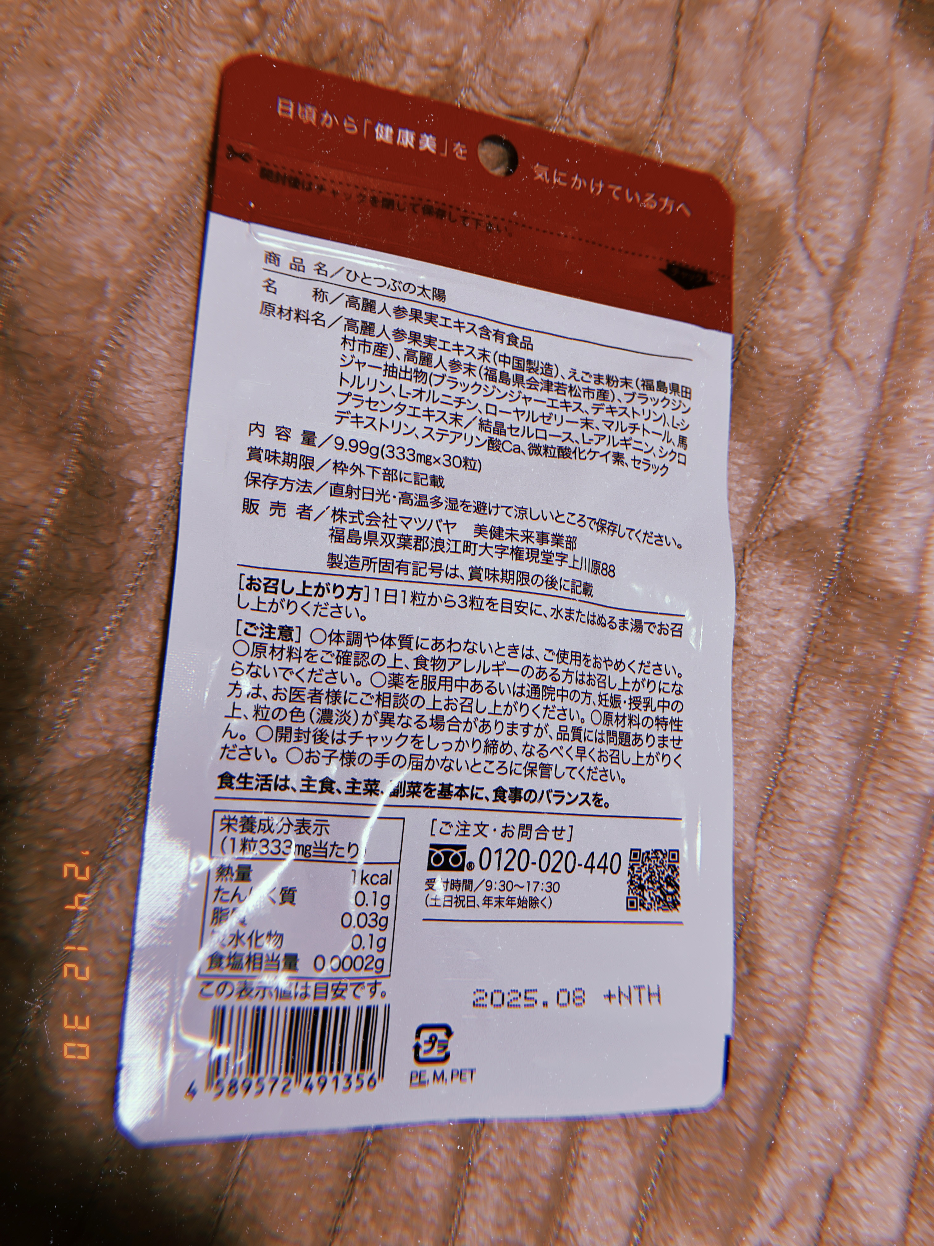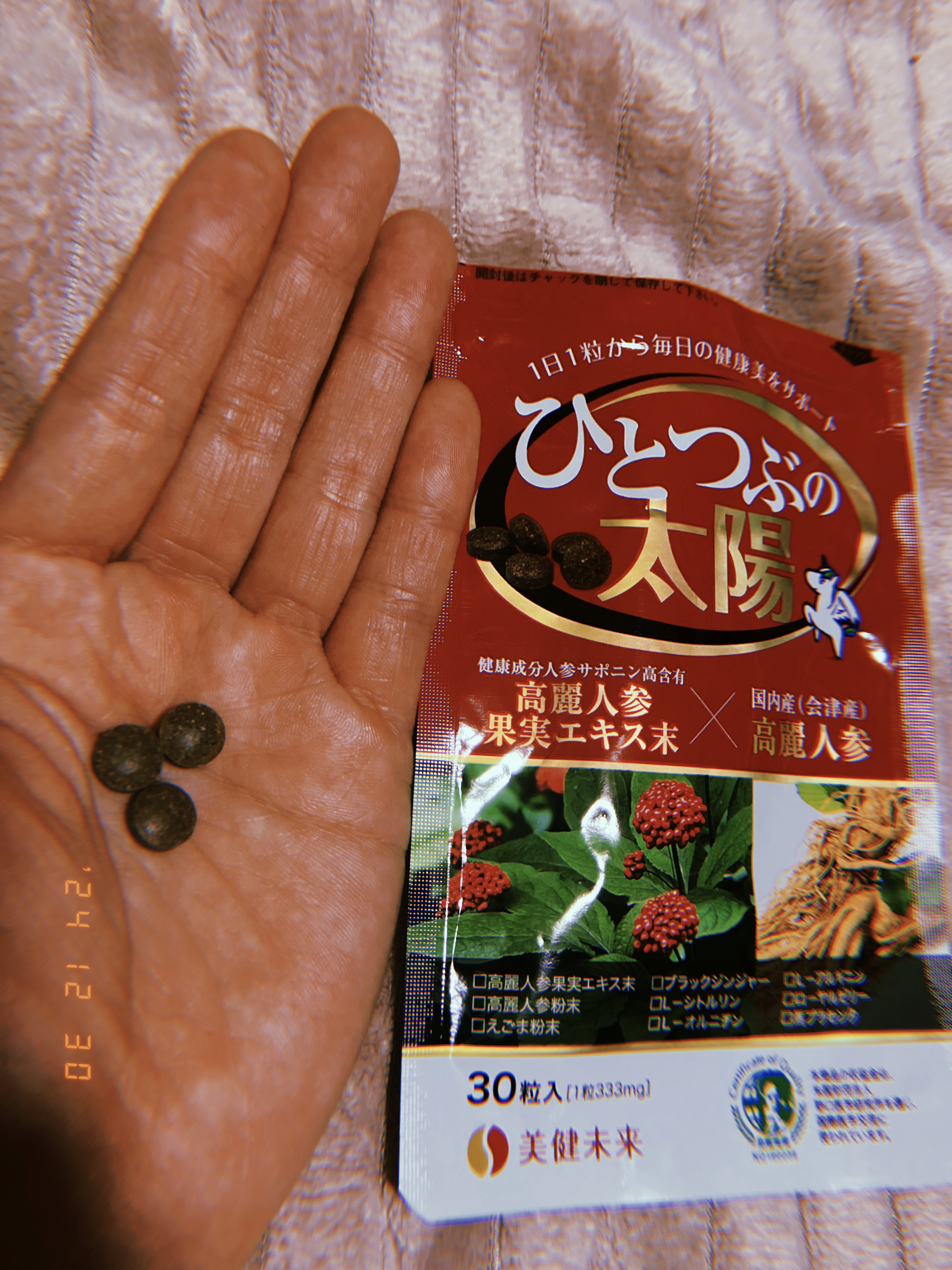 高麗人参を使用したサプリメントだよ。福島県会津の伝統野菜会津人参を配合しているの。会津で収穫した高麗人参だけを会津人参と呼ぶらしく、希少価値が高いことでも有名みたい。 人参サポニンという栄養素が含まれていて、この栄養素が良いみたいなの。それだけじゃなく、えごまや馬プラセンタ、ローヤルゼリーなんかも配合されているのが嬉しい。 小粒で飲みやすいサイズ感だから無理なく続けられそう。ちょっと独特な香りがするけど、慣れると気にならなくなったよ。