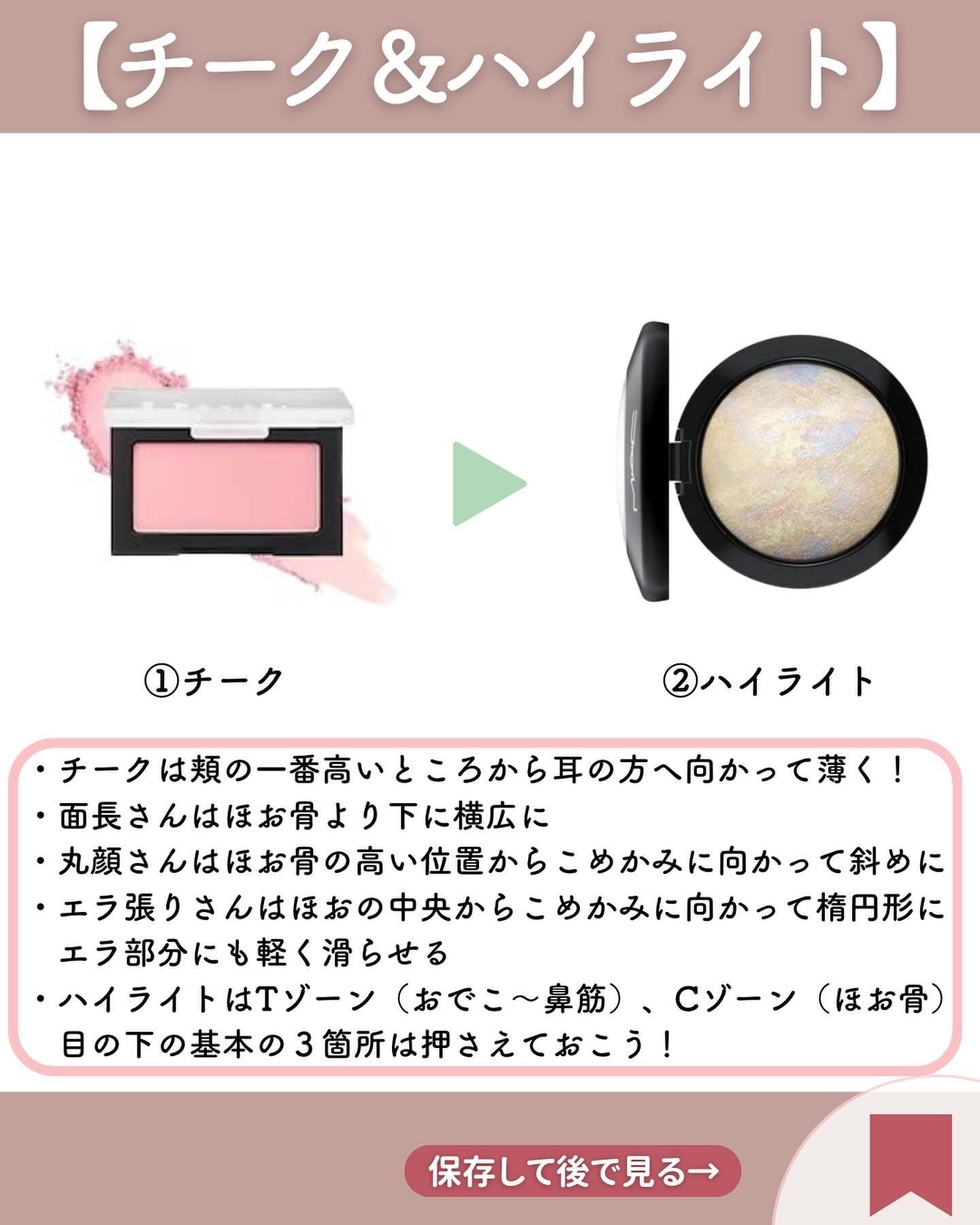 .気になる投稿は後から見返せるように【保存】してね𖤣𖥧𖥣𖡡𖥧𖤣【初心者さん必見!メイクの順番✨】これでバッチリ💡①ベースメイク②眉メイク③アイメイク④リップメイク⑤チーク&ハイライトメイクの順番とポイントをまとめてみたよ!載せてる商品はわたし...