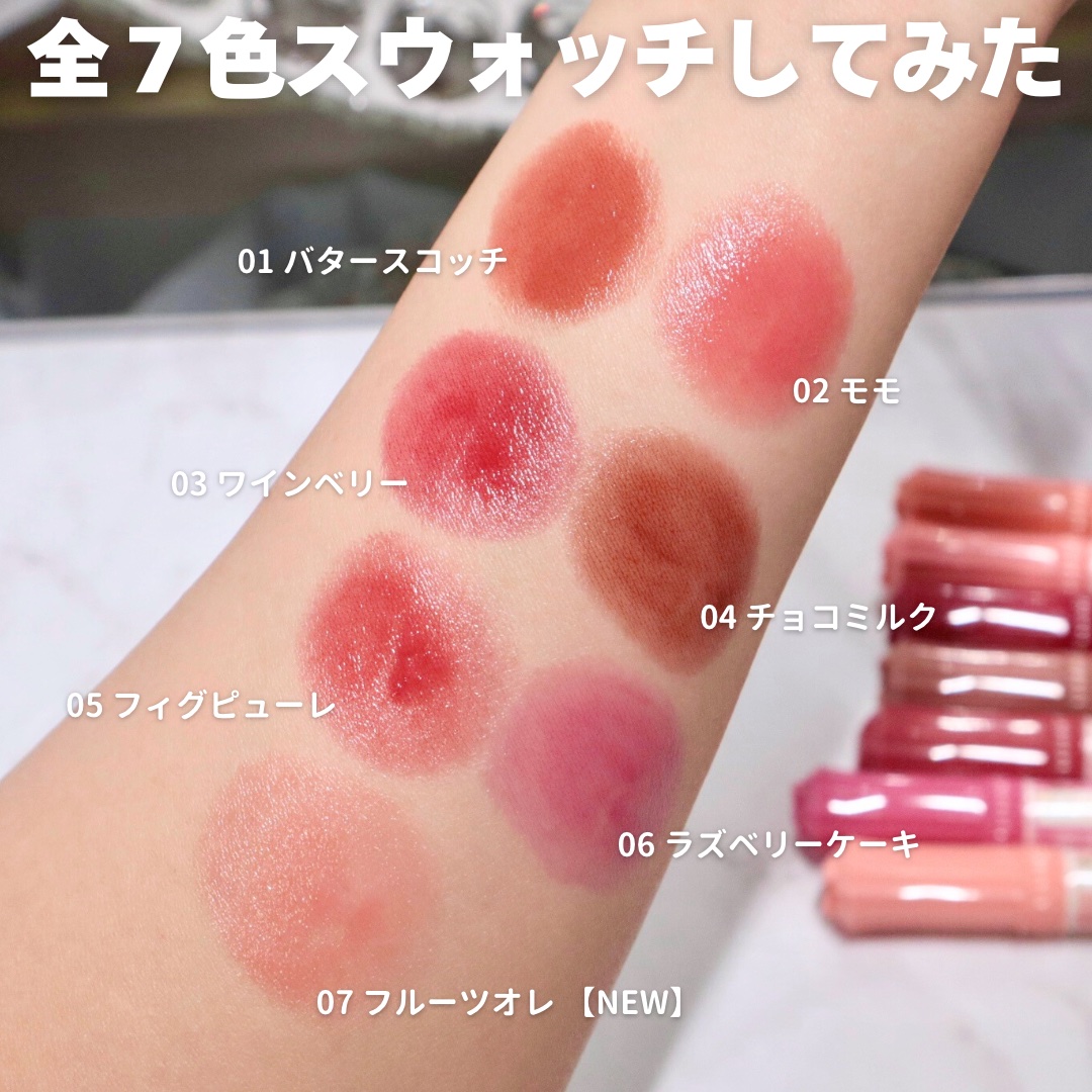 - <01 バタースコッチ> 水添ポリイソブテン、トリエチルヘキサノイン、ビスジグリセリルポリアシルアジペート-2、ヒドロキシステアリン酸エチルヘキシル、ワセリン、リンゴ酸ジイソステアリル、マイクロクリスタリンワックス、合成ワックス、シリカ、セスキイソステアリン酸ソルビタン、メントキシプロパンジオール、キャンデリラロウ、バニリルブチル、トコフェロール、クエン酸、クエン酸Na、ヒアルロン酸Na、アルガニアスピノサ核油、ハチミツ、シア脂、水、BG、加水分解コラーゲン、酸化鉄、酸化チタン、黄4、黄5、赤202、橙201、テトライソステアリン酸ポリグリセリル-2、青1、水酸化Al、赤223 <02 モモ> 水添ポリイソブテン、トリエチルヘキサノイン、ビスジグリセリルポリアシルアジペート-2、ヒドロキシステアリン酸エチルヘキシル、ワセリン、リンゴ酸ジイソステアリル、マイクロクリスタリンワックス、合成ワックス、シリカ、セスキイソステアリン酸ソルビタン、メントキシプロパンジオール、キャンデリラロウ、バニリルブチル、トコフェロール、クエン酸、クエン酸Na、ヒアルロン酸Na、アルガニアスピノサ核油、ハチミツ、シア脂、水、BG、加水分解コラーゲン、酸化チタン、黄4、黄5、赤202、酸化鉄、橙201、水酸化Al、テトライソステアリン酸ポリグリセリル-2 <03 ワインベリー> 水添ポリイソブテン、トリエチルヘキサノイン、ビスジグリセリルポリアシルアジペート-2、ヒドロキシステアリン酸エチルヘキシル、ワセリン、リンゴ酸ジイソステアリル、マイクロクリスタリンワックス、合成ワックス、シリカ、セスキイソステアリン酸ソルビタン、メントキシプロパンジオール、キャンデリラロウ、バニリルブチル、トコフェロール、クエン酸、クエン酸Na、ヒアルロン酸Na、アルガニアスピノサ核油、ハチミツ、シア脂、水、BG、加水分解コラーゲン、黄4、赤202、酸化チタン、酸化鉄、橙201、黄5、テトライソステアリン酸ポリグリセリル-2、赤223、水酸化Al、青1 <05 フィグピューレ> 水添ポリイソブテン、トリエチルヘキサノイン、ビスジグリセリルポリアシルアジペート-2、ヒドロキシステアリン酸エチルヘキシル、ワセリン、リンゴ酸ジイソステアリル、マイクロクリスタリンワックス、合成ワックス、シリカ、セスキイソステアリン酸ソルビタン、メントキシプロパンジオール、キャンデリラロウ、バニリルブチル、トコフェロール、クエン酸、クエン酸Na、ヒアルロン酸Na、アルガニアスピノサ核油、ハチミツ、シア脂、水、BG、加水分解コラーゲン、酸化チタン、黄4、赤202、黄5、酸化鉄、橙201、青1、水酸化Al、テトライソステアリン酸ポリグリセリル-2、赤223 <06 ラズベリーケーキ> 水添ポリイソブテン、トリエチルヘキサノイン、ビスジグリセリルポリアシルアジペート-2、ヒドロキシステアリン酸エチルヘキシル、リンゴ酸ジイソステアリル、ワセリン、マイクロクリスタリンワックス、合成ワックス、シリカ、セスキイソステアリン酸ソルビタン、メントキシプロパンジオール、キャンデリラロウ、バニリルブチル、トコフェロール、クエン酸、クエン酸Na、ヒアルロン酸Na、アルガニアスピノサ核油、ハチミツ、シア脂、水、BG、加水分解コラーゲン、酸化チタン、酸化鉄、赤202、橙201、水酸化Al、テトライソステアリン酸ポリグリセリル-2、青1、赤223、黄5 <07 フルーツオレ> 水添ポリイソブテン、トリエチルヘキサノイン、ビスジグリセリルポリアシルアジペート-2、ヒドロキシステアリン酸エチルヘキシル、ワセリン、リンゴ酸ジイソステアリル、マイクロクリスタリンワックス、合成ワックス、シリカ、セスキイソステアリン酸ソルビタン、メントキシプロパンジオール、キャンデリラロウ、バニリルブチル、トコフェロール、クエン酸、クエン酸Na、ヒアルロン酸Na、アルガニアスピノサ核油、ハチミツ、シア脂、水、BG、加水分解コラーゲン、酸化チタン、酸化鉄、黄4、水酸化Al、赤202、橙201、黄5、青1、テトライソステアリン酸ポリグリセリル-2 <04 チョコミルク> 水添ポリイソブテン、トリエチルヘキサノイン、ビスジグリセリルポリアシルアジペート-2、ヒドロキシステアリン酸エチルヘキシル、リンゴ酸ジイソステアリル、ワセリン、マイクロクリスタリンワックス、合成ワックス、シリカ、セスキイソステアリン酸ソルビタン、メントキシプロパンジオール、キャンデリラロウ、バニリルブチル、トコフェロール、クエン酸、クエン酸Na、ヒアルロン酸Na、アルガニアスピノサ核油、ハチミツ、シア脂、水、BG、加水分解コラーゲン、酸化鉄、青1、酸化チタン、橙201、赤202、テトライソステアリン酸ポリグリセリル-2、黄4、水酸化Al