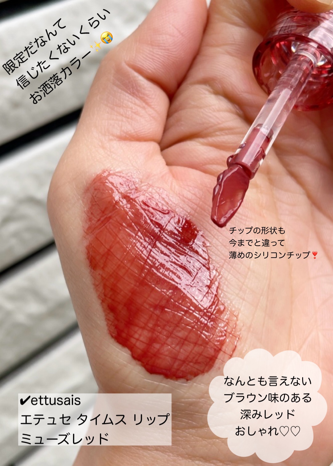 ウォータリーティントリップ03 ベージュブラウン660円 ずうううっと長く愛用中なのはダントツでこれ。 透け感のあるツヤ赤みブラウンでおしゃれに落ち着いた雰囲気になる。 秋のモードな雰囲気が出せるカラーで赤みのあるブラウンが好きな人は絶対好き。 こなれ感の出るオレンジブラウン系で秋冬のオレンジメイクにぴったり。
