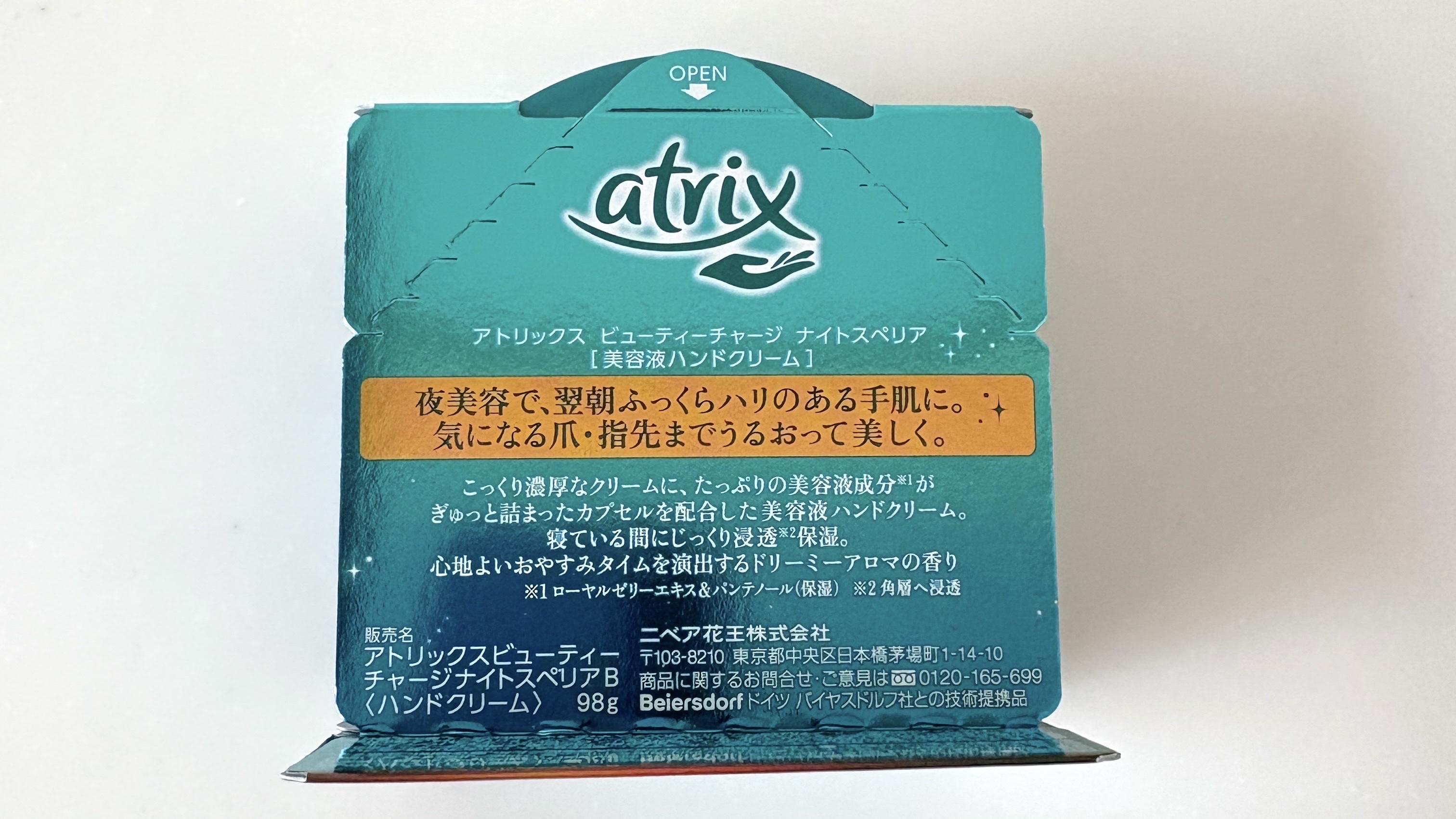 アトリックス ビューティーチャージナイトスペリア美容液ハンドクリーム夜美容で翌朝ふっくらハリのある手肌に気になる爪、指先まで潤って美しく。こっくり濃厚なクリームにたっぷりの美容液成分がぎゅっと詰まったカプセルを配合した美容液ハンドクリーム寝て...