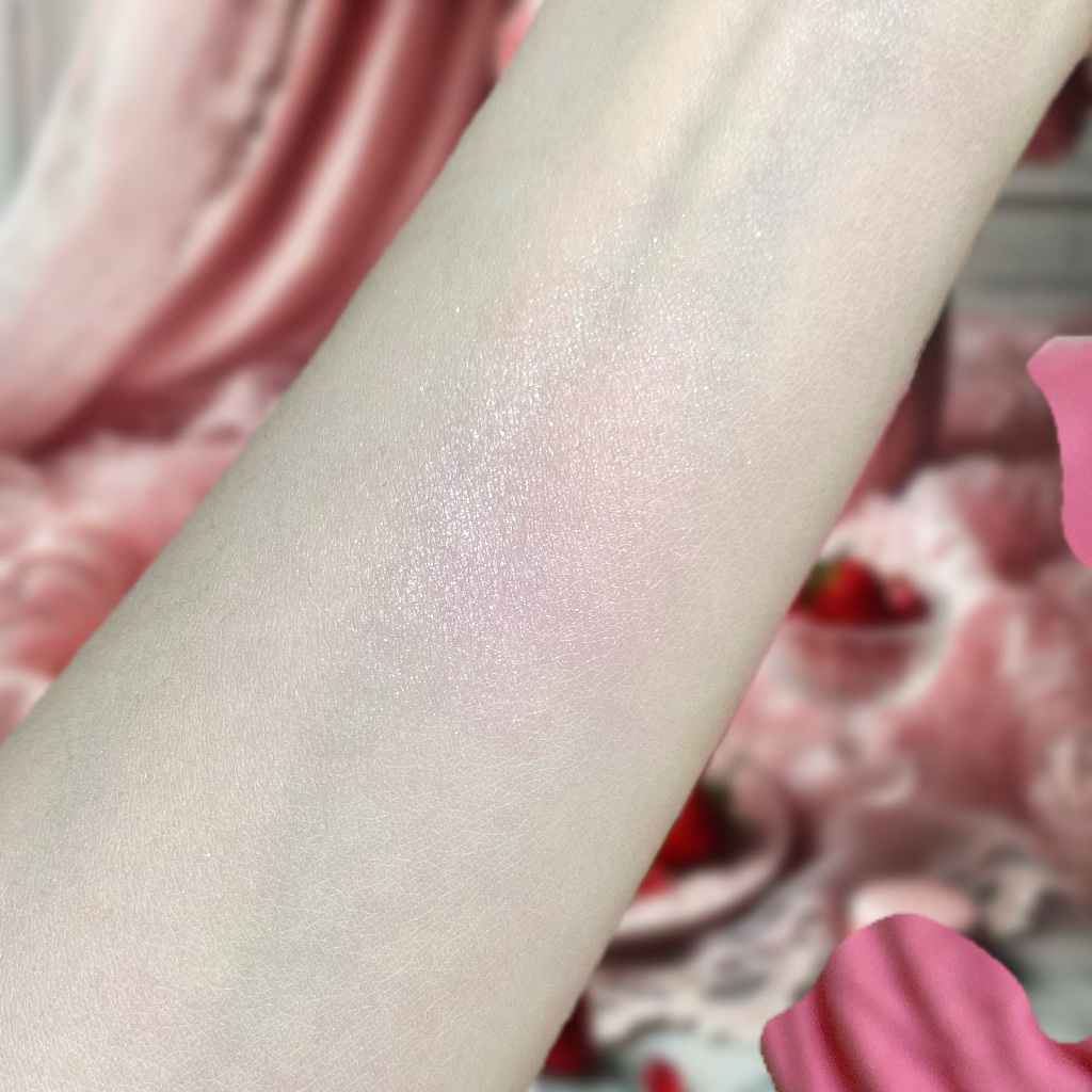 甘酸っぱく高糖度のいちごが連想される生き生きとした高彩度ビビットカラームード 青みピンク寄りなピンクです。ブラシで取る時に粉は飛びやすいかな…でも、1度でしっかり色が付いてくれるので発色がよかったです。 すごく細かいシルバーのラメが入っていてチラチラ光ってます。細かいのでラメと言うよりパールのツヤ感があって綺麗でした。