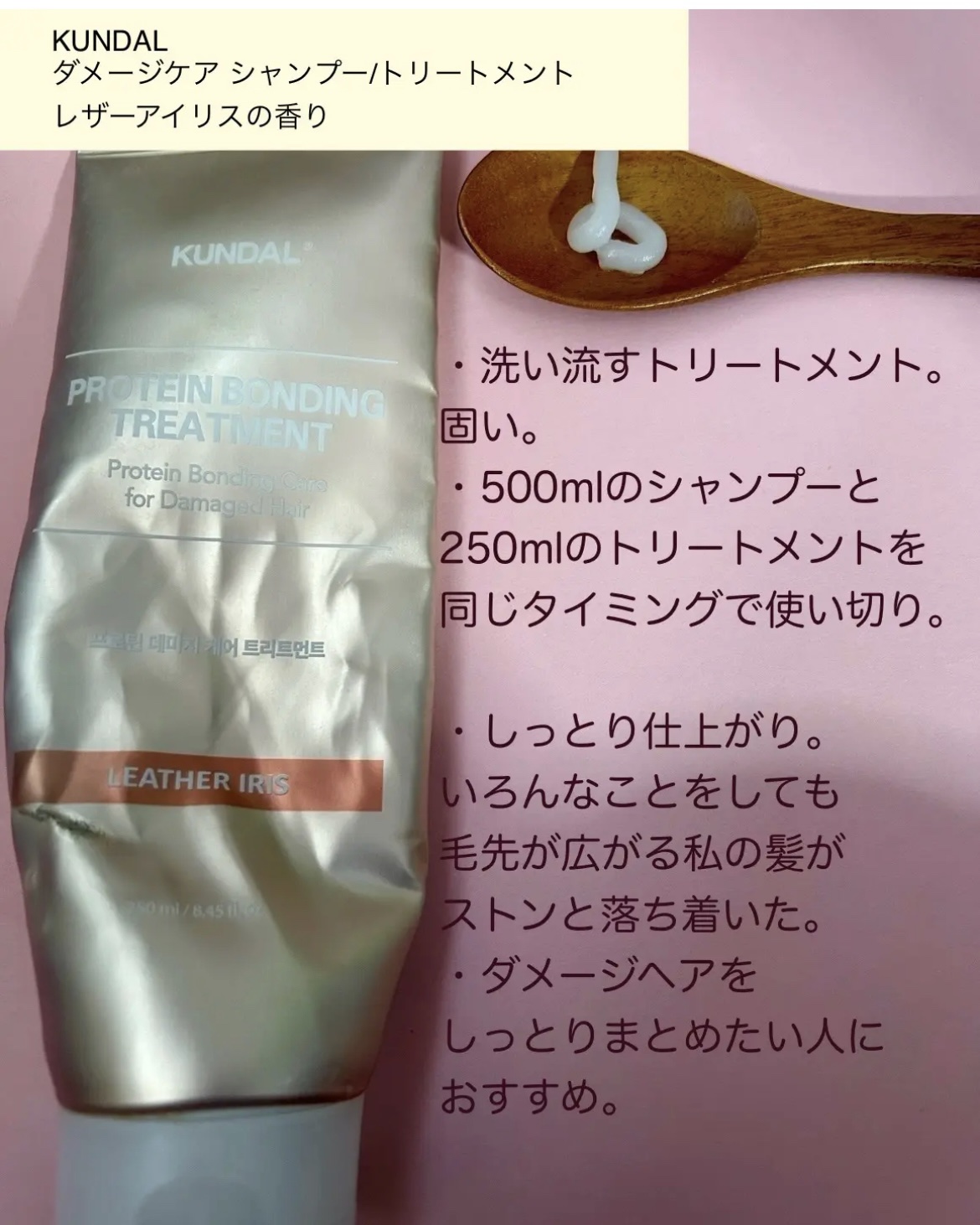 ダメージヘアが気になる方必見のKUNDALプロテインシリーズ✨ タンパク質結合力を高めて水分を補給しツヤのあるなめらかな髪に仕上げてくれるシャンプー✨ 高級感のある香水のような良い香りです☺️ 香りはそんなに強すぎなくてちょうど良い感じ!🙆♀️