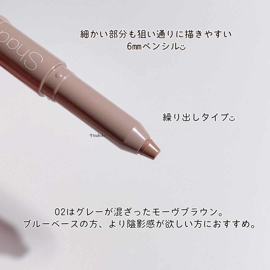 - 面も線も自在。骨格強調シェーディングペンシル。 細かい部分も狙い通りに描きやすい6㎜ペンシルのシェーディング。 リアルな影色を仕込んで骨格を強調。理想の鼻の形や、スッキリとしたフェイスラインを演出。 ヨレにくく、水・汗・皮脂に強いラスティング処方。