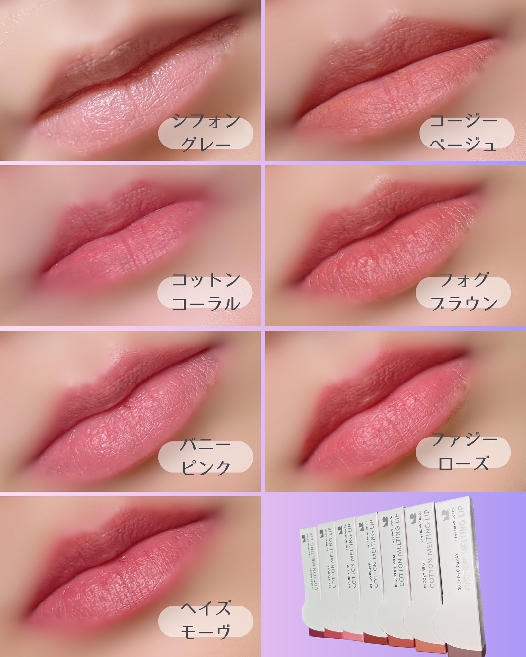 - ふんわりマシュマロ唇が作れちゃう「コットンメルティングリップ」が登場! シアバターと8種のヒアルロン酸配合で、マットリップなのに軽やかにうるおう新概念リップです。 イエベ・ブルべ問わず肌馴染みのいい7色展開で、いずれも落ち着いたミュートカラーが特徴。唇の質感をふんわりとぼかしながらマシュマロのような唇を演出します。 さらにチークやアイシャドウ、シェーディングにも使えるマルチユース。 1本ポーチに忍ばせればメイク直しも簡単です。