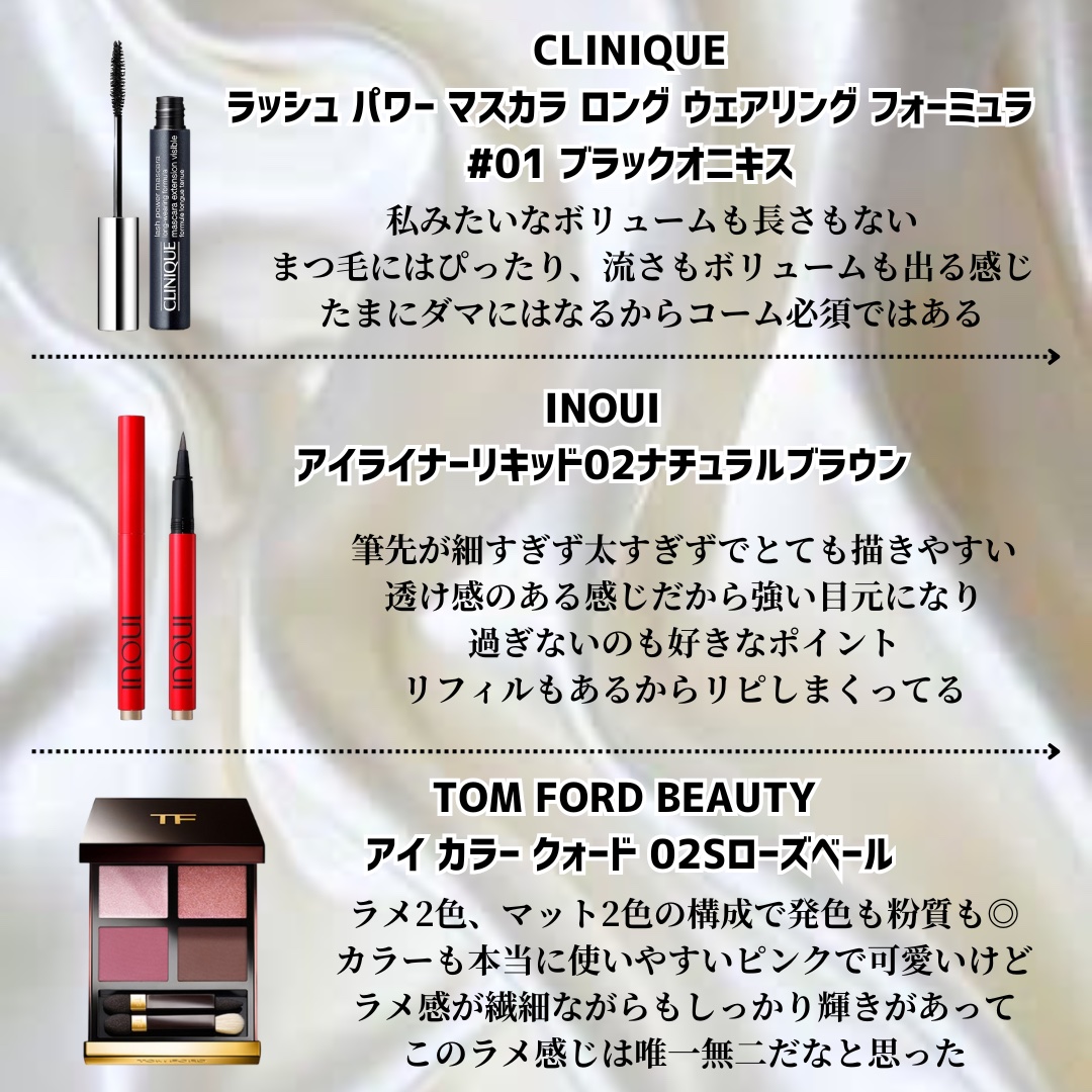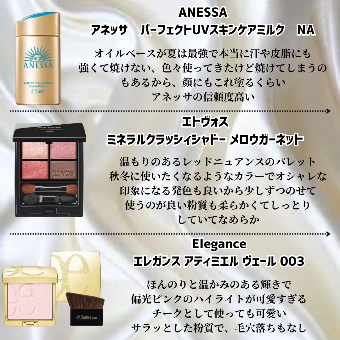 淡色は2024年に引き続き人気を保ってる。韓国コスメには出せない透明感が本当に2024年豊作だったよねーって思う エレガンス アティミエル ヴェールは、どこに塗ったかわからなくなるのにしっかりプリプリのピンク肌を演出してくれる。 Diorのバズチークはチークというよりハイライトとして使うのが好き。ライラッが肌をつやーんと光らせてくれて透明感ましましに。