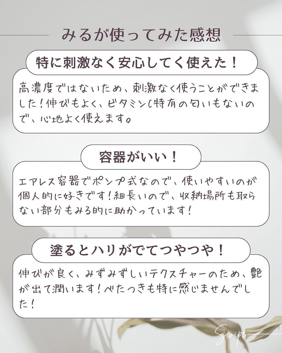 美白、シワ改善がしたい方におすすめ肌のハリやビタミンチャージ! ナイアシンアミド、ビタミンC誘導体配合。テクスチャーは少しとろみがあり べたつかず、馴染みやすい。香りなどもないから使いやすいよ。
