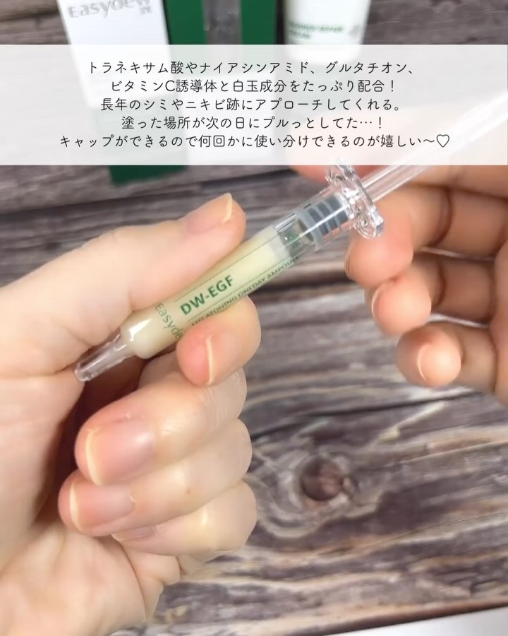 韓国トップクラスの大熊製薬会社発 ドクターズコスメ💚 特許を取得している人の細胞と99.9%同一の高純度のDW-EGFのみ使用😍‼︎ まるで白玉注射⁉︎のような注射器型美容液💉 シミ集中ケア♡ 1回の使い切りじゃなくてもOK🙆♀️ 新作のビタCトナー💛 メラニンの予防や肌キメを整え水分力UP✨
