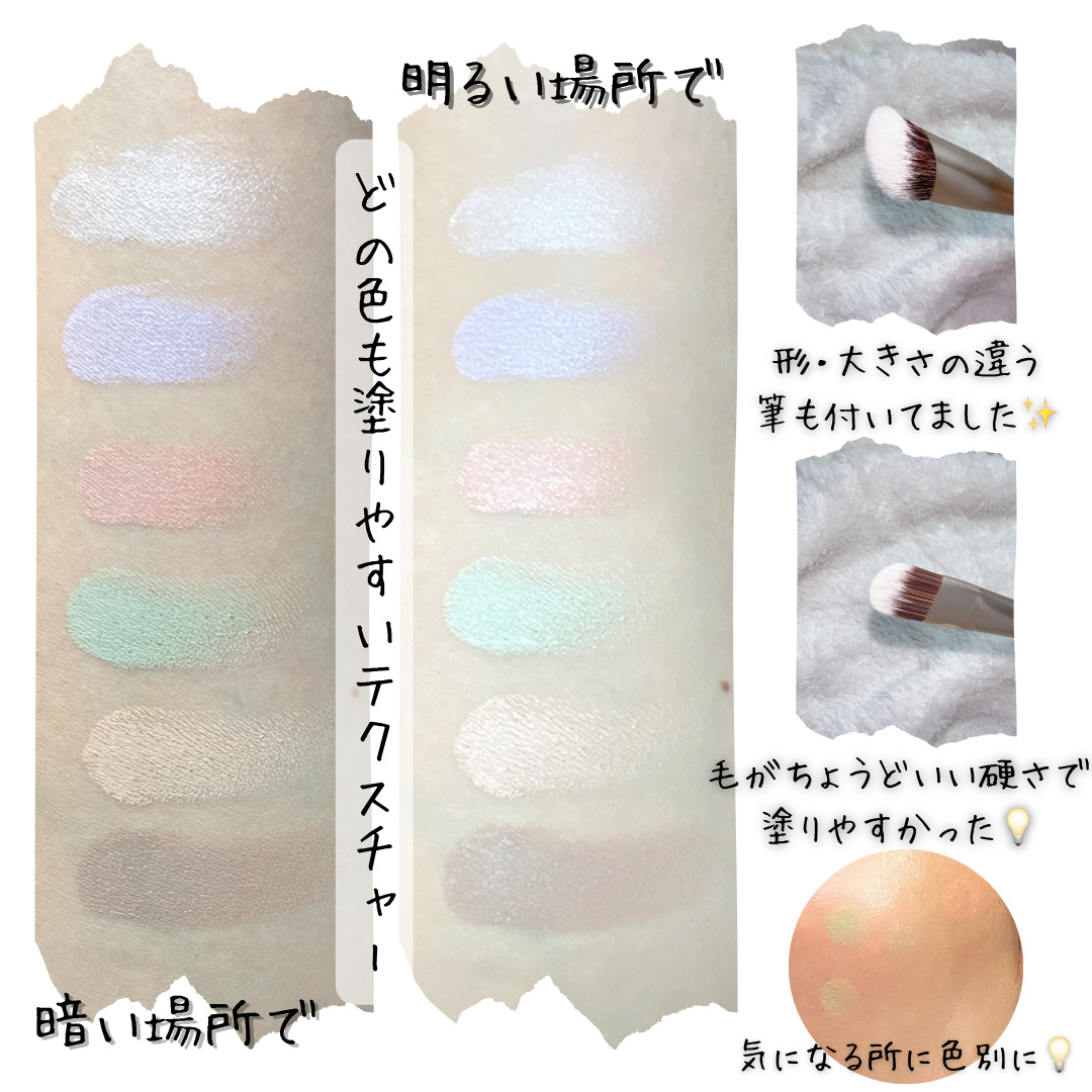 6色入りのコンシーラーパレットとコンシーラーブラシが優秀すぎて即愛用品の仲間入り🥰 ピーチはクマに、ミントは赤みに、ハイライトは目元に、ラベンダーはくすみに、アイボリーはシミや気になるところ全般に、シェーディングは輪郭に、とこれ1つ持っていればマルチに使えるのが素晴らしい✨ 21号と23号があるから自分に合う方を選べるよ❣️