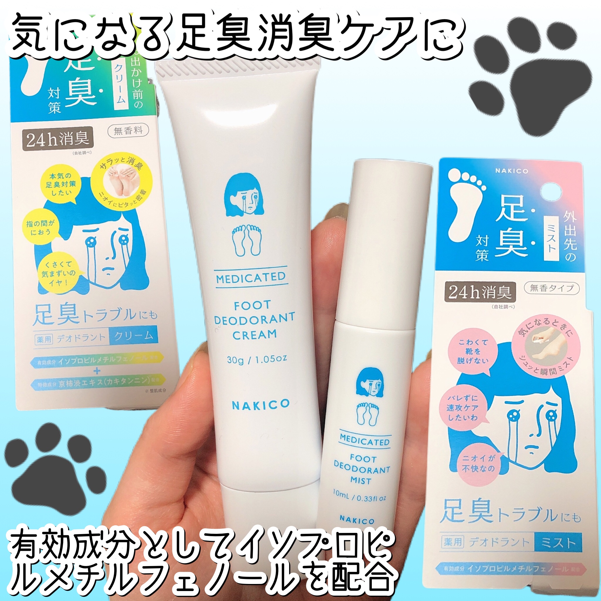 NAKICO冬の新作は24時間消臭!自社調べ 毎日使える足のニオイケアアイテム! 有効成分「イソプロピルメチルフェノール」でニオイの元を殺菌消臭。 家ではクリーム、外ではミストと使い分けできるのもいいですね。無香料なのも🙆