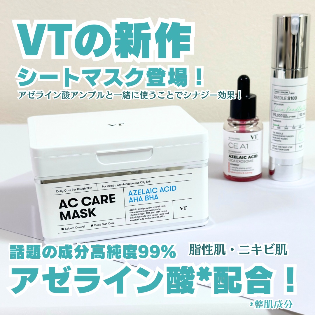 シートマスクと言えばのVTから、話題の人気成分のアゼライン酸のケアマスクが出たよ❤️ アゼライン酸配合のACケアマスクは30枚入っていて毎日使える超コスパアイテム✨ A1カーミングアンプルはアゼライン酸に加えてCICA配合なところも皮脂ケアやニキビケアのデイリーケアにぴったりで嬉しい🫶💞