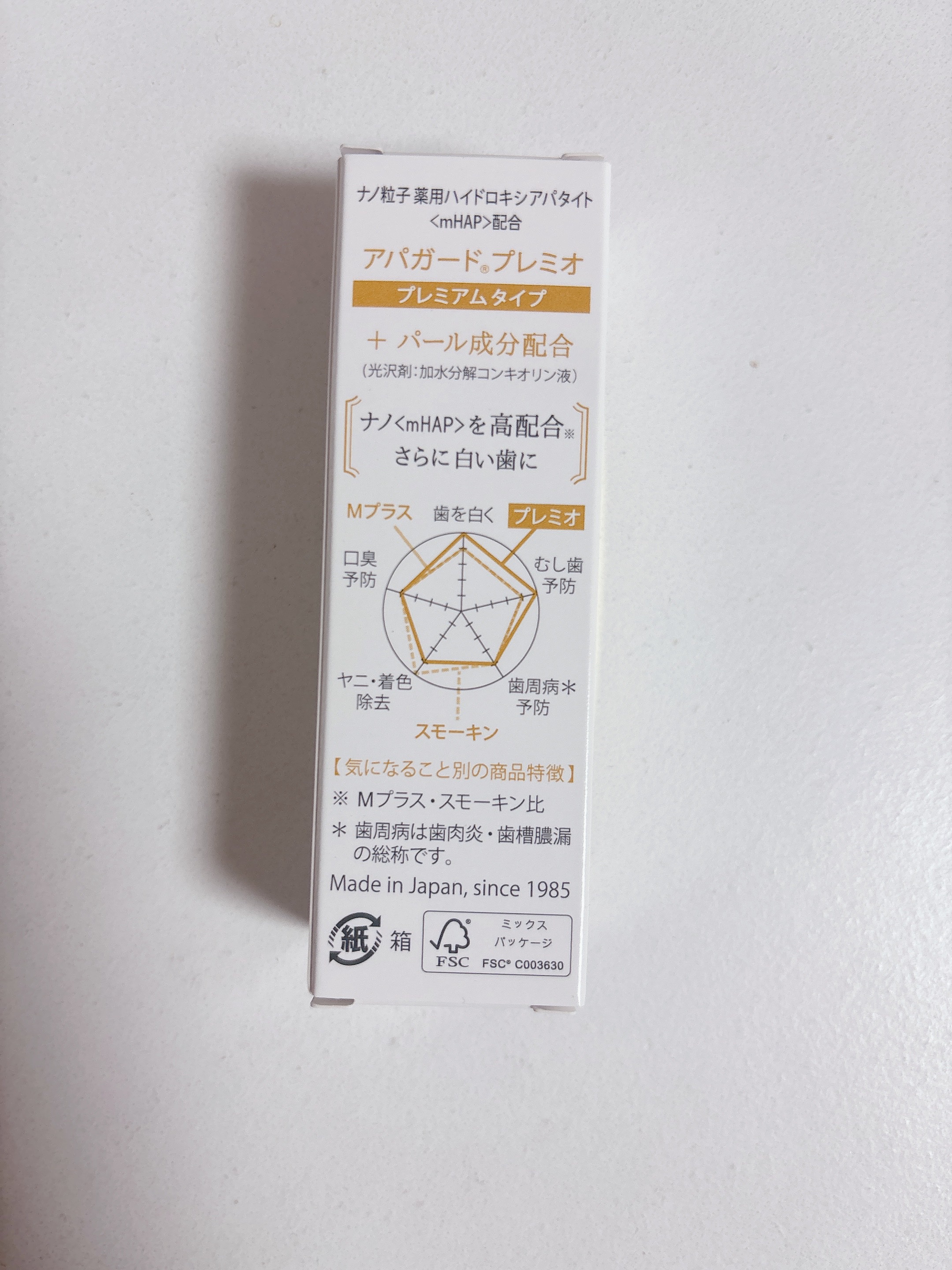 - 【医薬部外品】 独自成分「薬用ハイドロキシアパタイト」がエナメル質を整えてむし歯を予防。アパガードはエナメル質の健康を保つことで自然な白い歯に導く美白歯みがきブランド。アパガードプレミオは「薬用ハイドロキシアパタイト」を高配合(スタンダードタイプ比)。プレミアムケアでときめく白い歯に。 <ライトミント> ●サンギ独自の薬用成分ナノ粒子「薬用ハイドロキシアパタイト」を高配合したプレミアムタイプ。※Mプラス、スモーキン比 ●歯の再石灰化率、白色度もアップ。 ●歯垢を吸着除去し、歯のエナメル質の目に見えない傷を埋め、ミネラル欠損部(初期むし歯)を再石灰化するナノ<mHAP>の3つの働きで、むし歯を予防。 ●パール成分(加水分解コンキオリン液)配合。 <エクストラミント> ●強めのミントがお好みの方におススメ!ミント強めの「エクストラミント」フレーバー。 ●サンギ独自の薬用成分ナノ粒子「薬用ハイドロキシアパタイト」を高配合したプレミアムタイプ。※Mプラス、スモーキン比 ●歯垢を吸着除去、エナメル質表面の目に見えない傷を埋めてなめらかに、エナメル質から溶け出したミネラルを補給(再石灰化)する、という薬用ハイドロキシアパタイトの3つの作用でむし歯を予防。 ●パール成分(加水分解コンキオリン液)を追加したブライトニング処方