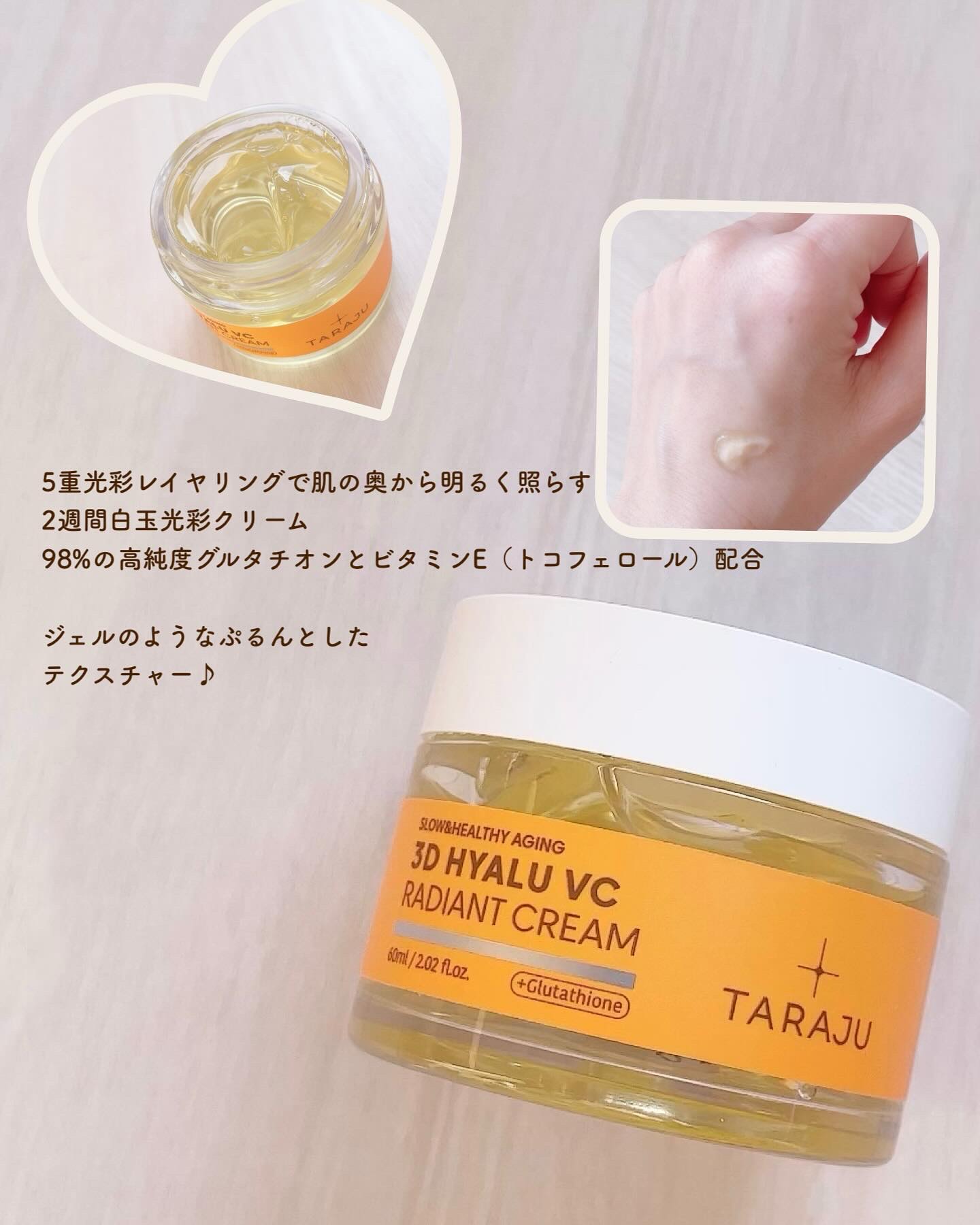 『タラジュ』は79年の歴史ある韓国の製薬会社 大熊(デウン)製薬が数年間研究して作ったスキンケアブランドだそうです✨✨ カプセルトナーはオレンジ色のつぶつぶカプセルの入っていて洗顔後すぐに使う商品 香りはなくとろみがあってまるで美容液のようなテクスチャー✨ レディアントクリームはまるでゼリーのようにぷるぷるのジェルのようなテクスチャー グルタチオン*とビタミンE*配合