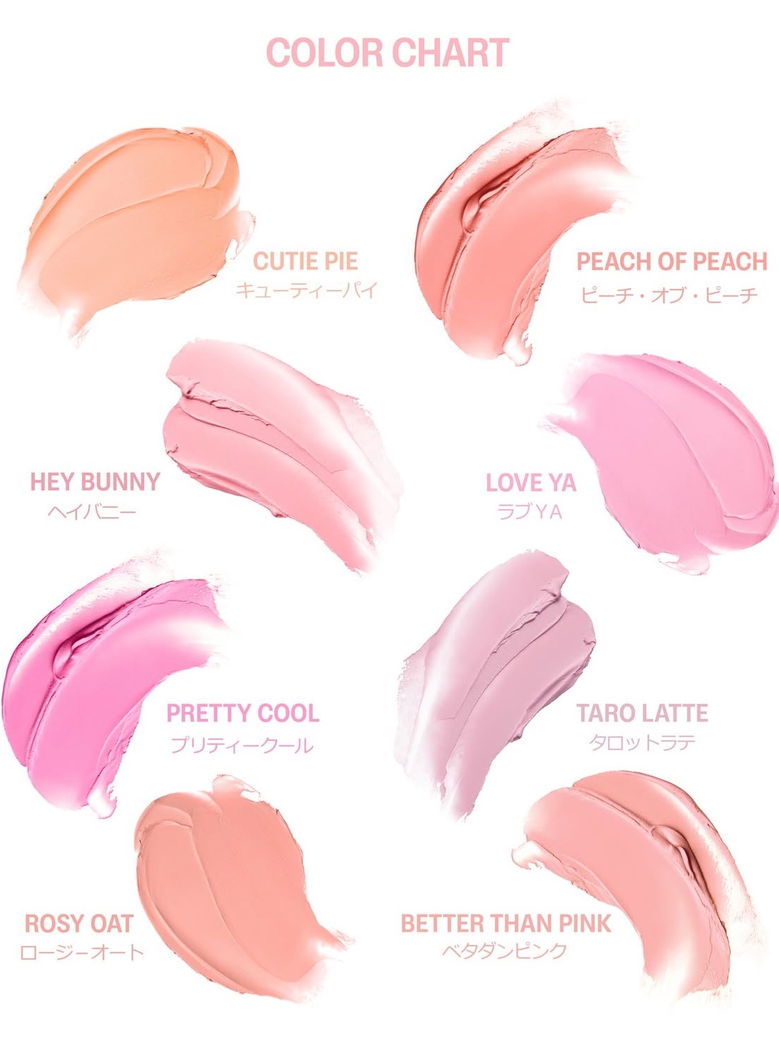 - <01 キューティーパイ(Cutie Pie)> カオリン、ジメチコン、ポリプロピルシルセスキオキサン、フェニルトリメチコン、トリイソステアリン酸ポリグリセリル-2、(ビニルジメチコン/メチコンシルセスキオキサン)クロスポリマー、(HDI/トリメチロールヘキシルラクトン)クロスポリマー、合成ワックス、(VP/ヘキサデセン)コポリマー、マイクロクリスタリンワックス、合成ミツロウ、リンゴ酸ジイソステアリル、ポリリシノレイン酸ポリグリセリル-6、ジメチコンクロスポリマー、メタクリル酸メチルクロスポリマー、ラウリルポリグリセリル-3ポリジメチルシロキシエチルジメチコン、1,2-ヘキサンジオール、(エチレン/プロピレン)コポリマー、酢酸トコフェロール、カプリリルグリコール、シリカ、エチルヘキシルグリセリン、トコフェロール、酸化チタン、酸化鉄、赤202、黄5 <02 ピーチオブピーチ(Peach of Peach)> カオリン、ジメチコン、ポリプロピルシルセスキオキサン、フェニルトリメチコン、(ビニルジメチコン/メチコンシルセスキオキサン)クロスポリマー、トリイソステアリン酸 ポリグリセリル-2、(HDI/トリメチロールヘキシルラクトン)クロスポリマー、合成ワッ クス、(VP/ヘキサデセン)コポリマー、マイクロクリスタリンワックス、合成ミツロウ、ポリリシノレイン酸ポリグリセリル-6、ジメチコンクロスポリマー、リンゴ酸ジイソステアリル、メタクリル酸メチルクロスポリマー、ラウリルポリグリセリル-3ポリジメチルシロキシエチルジメチコン、1,2-ヘキサンジオール、(エチレン/プロピレン)コポリマー、酢酸 トコフェロール、カプリリルグリコール、シリカ、エチルヘキシルグリセリン、トコフェロール、酸化チタン、酸化鉄、赤201、黄5、赤202 <03 ヘイバニー(Hey Bunny)> カオリン、ジメチコン、ポリプロピルシルセスキオキサン、フェニルトリメチコン、(ビニルジメチコン/メチコンシルセスキオキサン)クロスポリマー、トリイソステアリン酸ポリグリセリル-2、(HDI/トリメチロールヘキシルラクトン)クロスポリマー、合成ワックス、(VP/ヘキサデセン)コポリマー、マイクロクリスタリンワックス、合成ミツロウ、ポ リリシノレイン酸ポリグリセリル-6、ジメチコンクロスポリマー、リンゴ酸ジイソステアリル、メタクリル酸メチルクロスポリマー、ラウリルポリグリセリル-3ポリジメチルシロキシエチルジメチコン、1,2-ヘキサンジオール、(エチレン/プロピレン)コポリマー、酢酸トコフェロール、カプリリルグリコール、シリカ、エチルヘキシルグリセリン、トコフェロール、酸化チタン、酸化鉄、赤104(1)、黄4、青1 <04 ラブヤ(Love Ya)> カオリン、ジメチコン、ポリプロピルシルセスキオキサン、フェニルトリメチコン、(ビニルジメチコン/メチコンシルセスキオキサン)クロスポリマー、トリイソステアリン酸ポリグリセリル-2、(HDI/トリメチロールヘキシルラクトン)クロスポリマー、合成ワックス、(VP/ヘキサデセン)コポリマー、マイクロクリスタリンワックス、合成ミツロウ、ポリリシノレイン酸ポリグリセリル-6、リンゴ酸ジイソステアリル、ジメチコンクロスポリマー、メタクリル酸メチルクロスポリマー、ラウリルポリグリセリル-3ポリジメチルシロキシエチルジメチコン、1,2-ヘキサンジオール、(エチレン/プロピレン)コポリマー、酢酸トコフェロール、カプリリルグリコール、シリカ、エチルヘキシルグリセリン、トコフェロール、酸化チタン、赤104(1)、酸化鉄、青1 <05 プリティークール(Pretty Cool)> カオリン、ジメチコン、ポリプロピルシルセスキオキサン、フェニルトリメチコン、トリイソステアリン酸ポリグリセリル-2、(ビニルジメチコン/メチコンシルセスキオキサン)クロスポリマー、(HDI/トリメチロールヘキシルラクトン)クロスポリマー、合成ワックス、(VP/ヘキサデセン)コポリマー、マイクロクリスタリンワックス、リンゴ酸ジイソステアリル、合成ミツロウ、ポリリシノレイン酸ポリグリセリル-6、ジメチコンクロスポリマー、メタクリル酸メチルクロスポリマー、ラウリルポリグリセリル-3ポリジメチルシロキシエチルジメチコン、1,2-ヘキサンジオール、(エチレン/プロピレン)コポリマー、酢酸トコフェロール、カプリリルグリコール、シリカ、エチルヘキシルグリセリン、トコフェロール、酸化チタン、赤104(1)、黄4 <06 タロラテ(Taro Latte)> カオリン、ジメチコン、ポリプロピルシルセスキオキサン、フェニルトリメチコン、(ビニルジメチコン/メチコンシルセスキオキサン)クロスポリマー、トリイソステアリン酸ポリグリセリル-2、(HDI/トリメチロールヘキシルラクトン)クロスポリマー、合成ワックス、(VP/ヘキサデセン)コポリマー、マイクロクリスタリンワックス、合成ミツロウ、ポ リリシノレイン酸ポリグリセリル-6、ジメチコンクロスポリマー、リンゴ酸ジイソステアリ ル、メタクリル酸メチルクロスポリマー、ラウリルポリグリセリル-3ポリジメチルシロキシエチルジメチコン、1,2-ヘキサンジオール、(エ