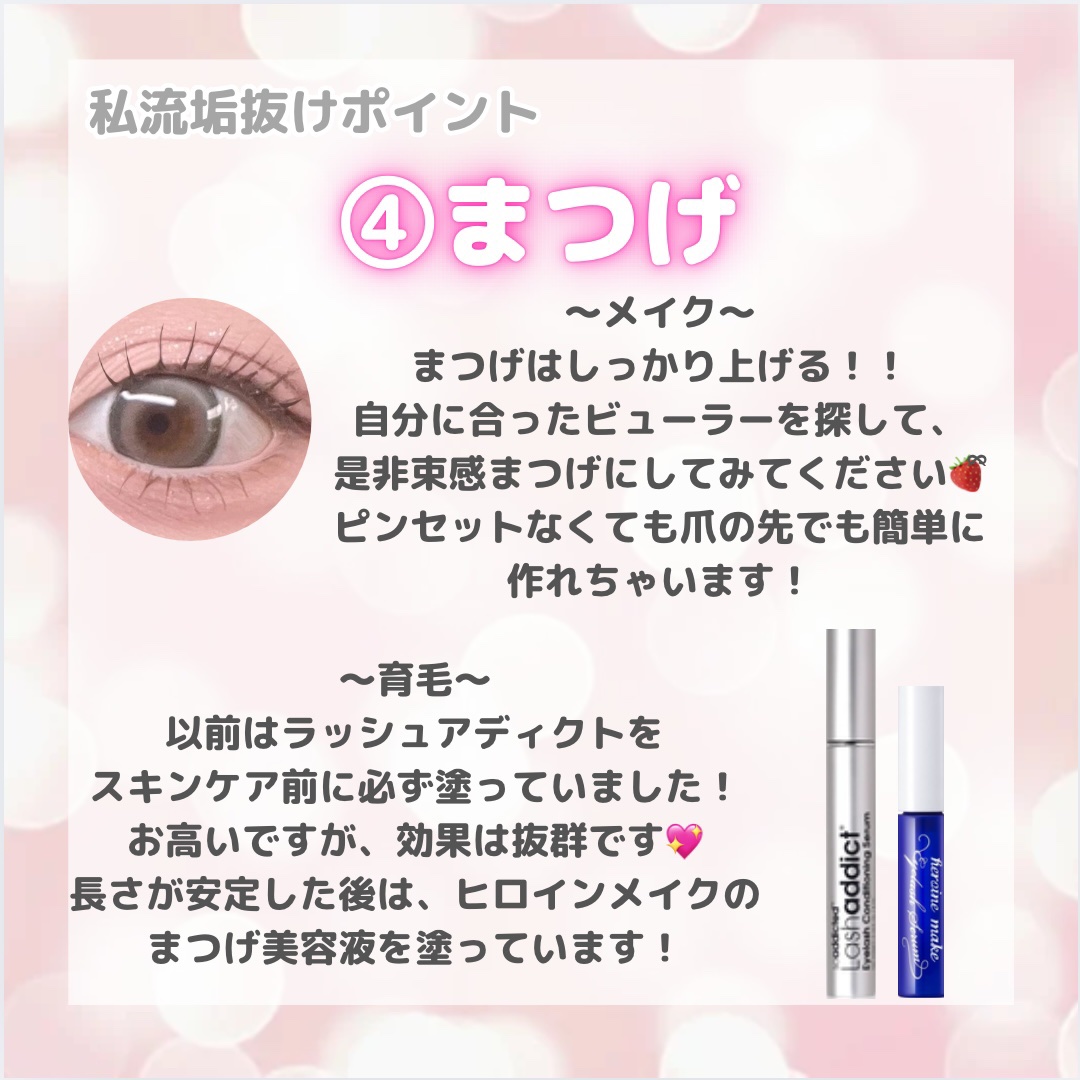 王道の前髪編! 私は前髪激重&横髪皆無芋女でした.....🥲 そんな私が韓国の美女たちの薄い前髪に憧れてずっと行っていた自己流の方法がコレです⬇️ 私は今現在カラコンなしでは生きていけなくなっています......😇 それくらい目が大きくクリっと見えるし、裸眼ではどうしても出せない透明感やドール感が出ます💖 まつげに関してはとにかくしっかり上げて強調することです🍓ྀི 長さをまつげ美容液でしっかり確保して、お気に入りのマスカラで可愛い束感まつ毛を作っちゃいましよ💞