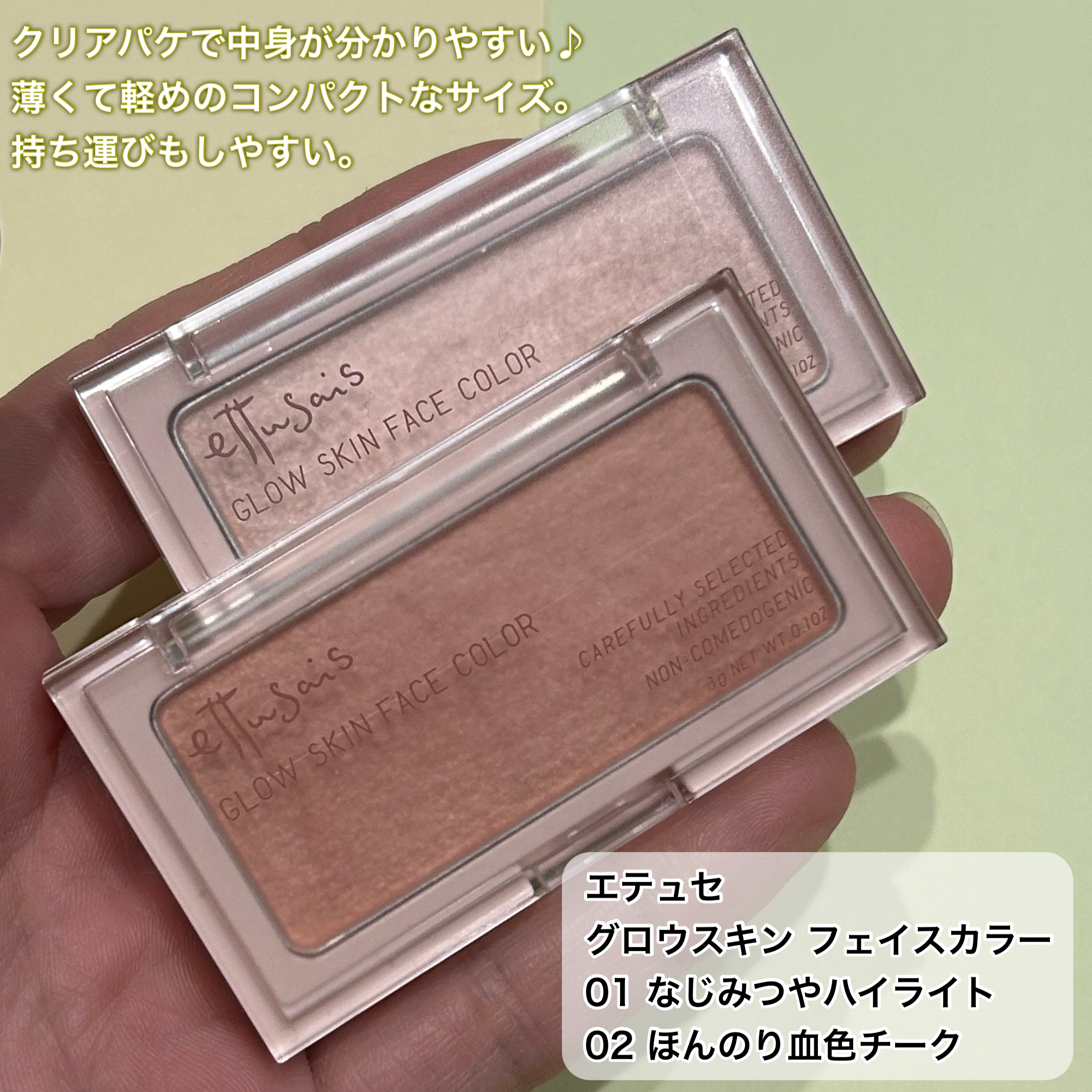 エテュセのフェイスカラー、待ってましたー!! もうね、ほんとうに使用感がよかった✨ うるおいが長時間続くスキンケア仕立てでテクスチャーだけでなく肌もしっとりが続く🫧 01 なじみつやハイライト 繊細な輝きでうるおったツヤ肌を演出 白浮しないピンクベージュ♡