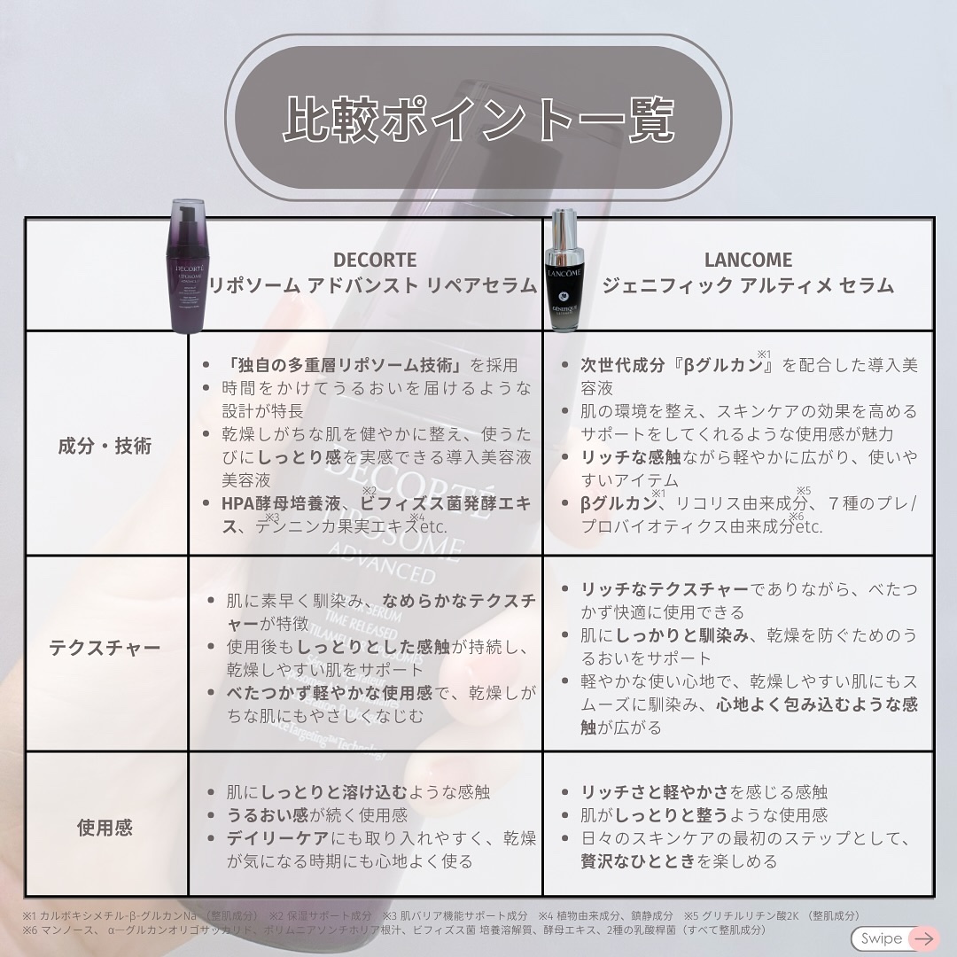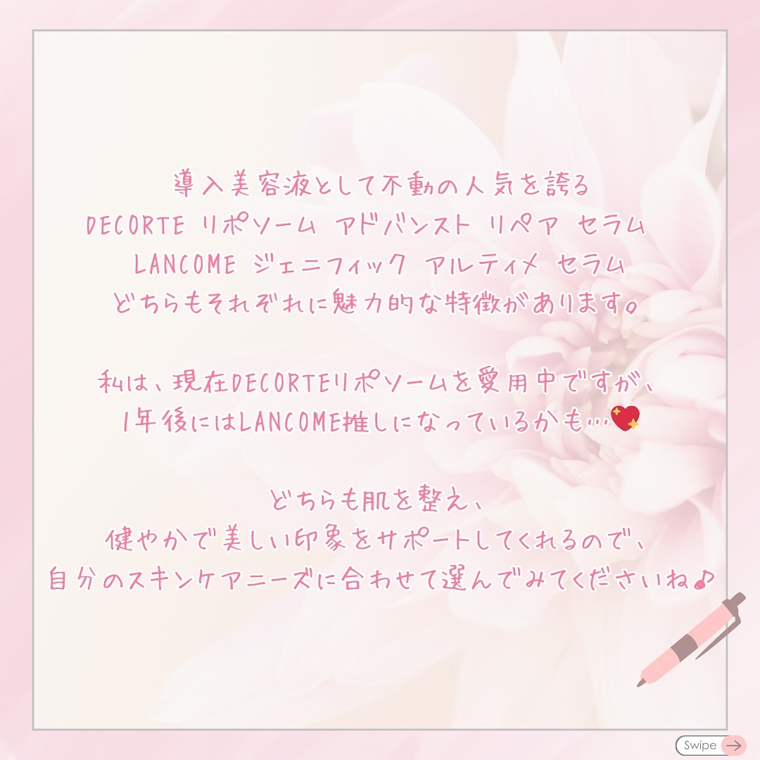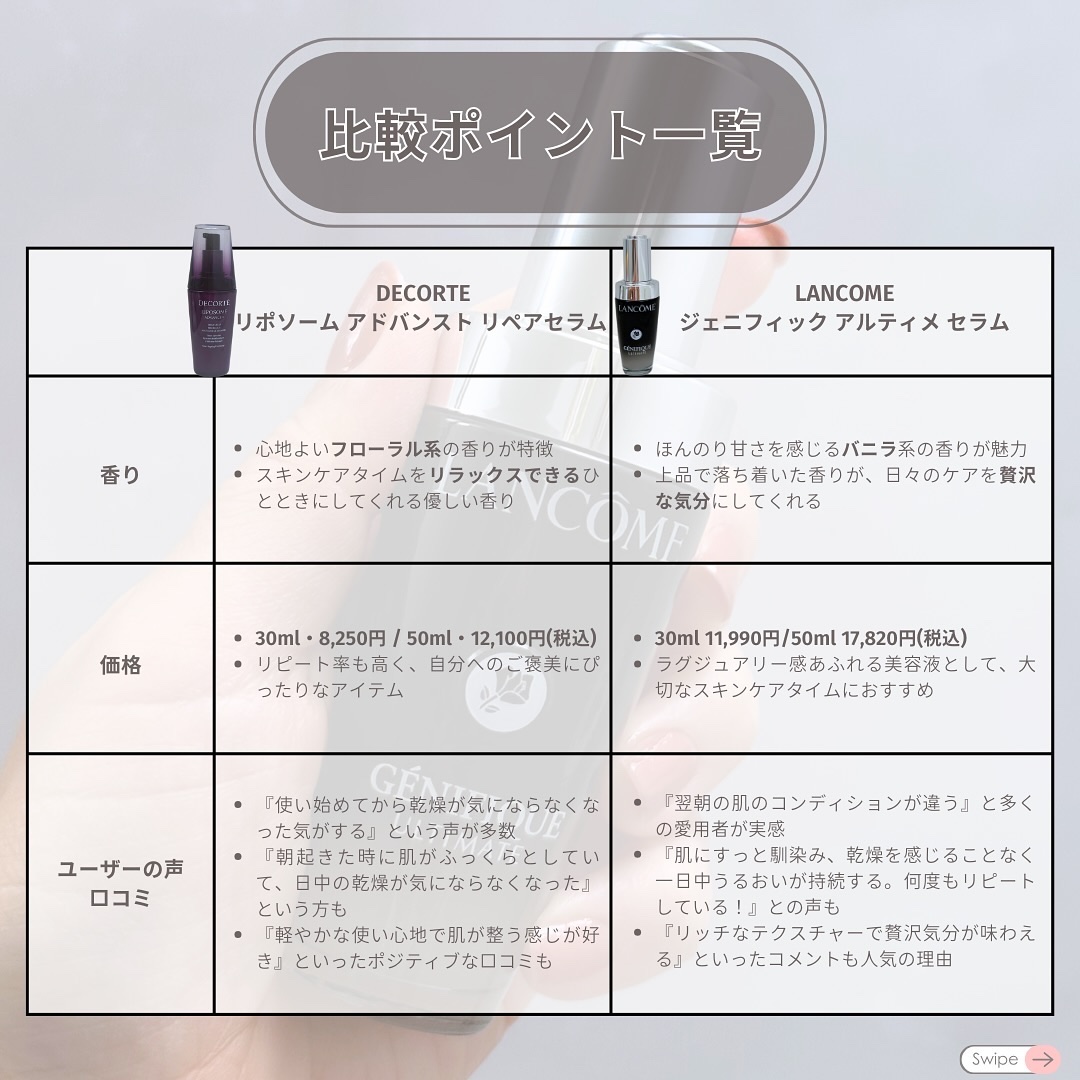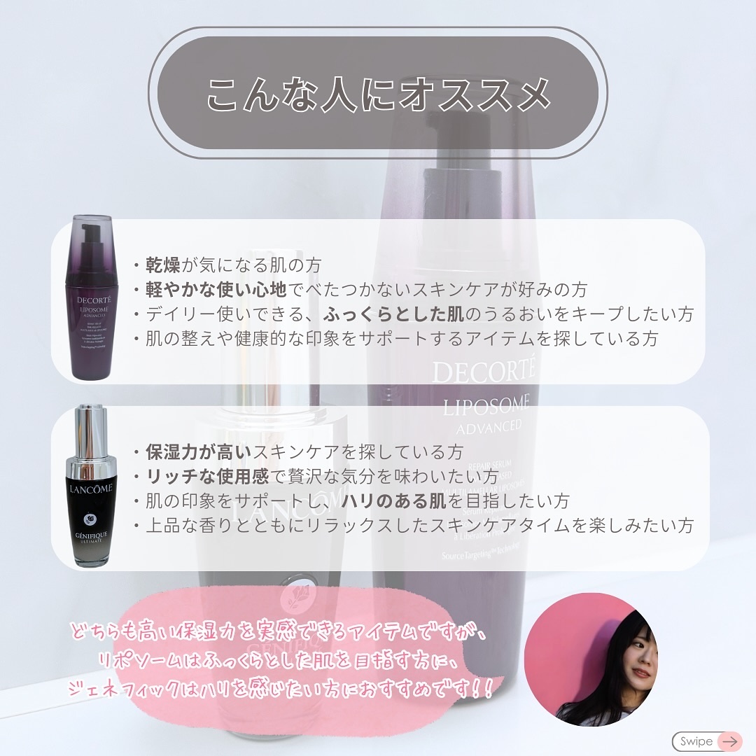 高い保湿力が魅力だけど、リポソームはふっくらうるおい肌を目指す方に、ジェネフィックはハリ感を求める方におすすめ💖 ✅気になる成分や使用感 ✅価格や香りの違い ✅リアルな口コミもチェック 自分のスキンケアニーズに合った1本を見つけてください🫶