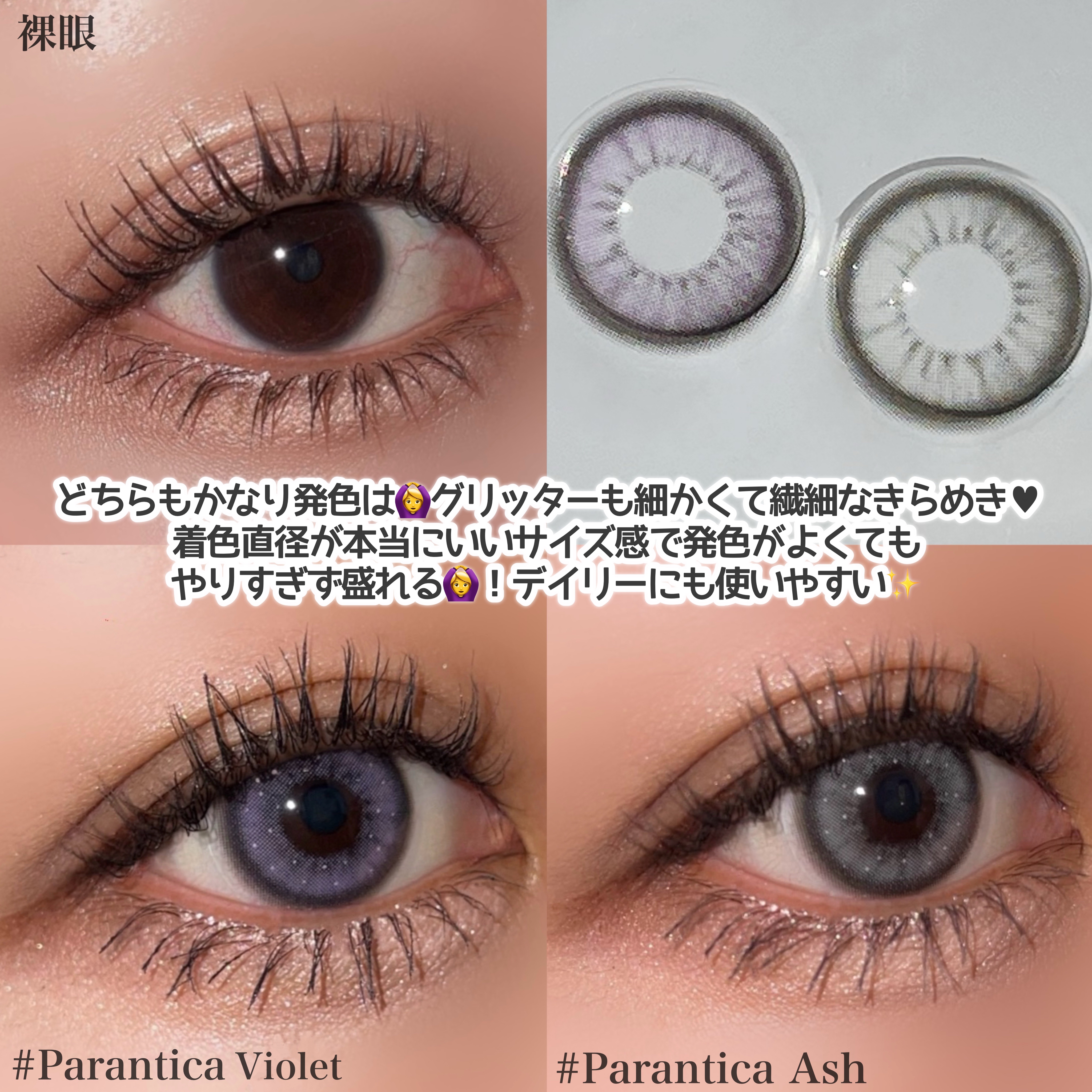 ANNASUI PARANTICAはグリッターが散らばめられたデザインが可愛いレンズ🦋 つけると一気に華やかでお洒落な雰囲気に! やりすぎ感のないお洒落なバイオレットなのでコスプレ感が出ず、ファッションのような感覚で紫を楽しめます! 透明感溢れるアッシュグレーとグリッターの組み合わせで可愛い雰囲気の目元に🩶 ̖́-