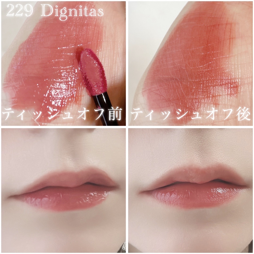 しっとりとした光沢感とべたつかないつけ心地、塗った直後にティッシュオフしても残る色味、絶妙なカラー展開が魅力のDintoティント♡ 221 Temet Nosce アッシュなモーヴピンク。青みと白みのバランスがかっわいいお気に入りカラー 229 Dignitas ダスティーローズ。そんなに深みはなくてちゃんと血色感の出るカラー。