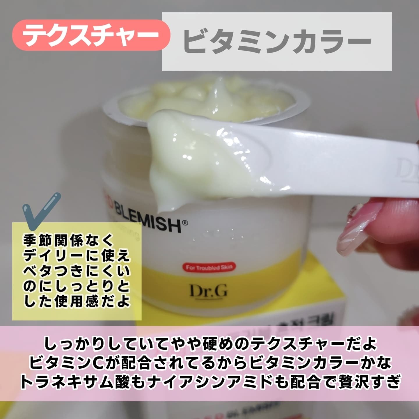 韓国コスメの大人気ブランド【 Dr.G ドクタージー】 今回はレッドブレミッシュシリーズの「レッドブレミッシュリペアスージングクリーム」を使ってみました♪ シカ&パントテン酸でニキビやトラブルを鎮静させてトラネキサム酸がその後をケア。 見ためよりもなめらかでしっとりとしたテクスチャー。肌なじみもよく保湿力もあって乾燥しやすい今の季節にも使いやすいです。