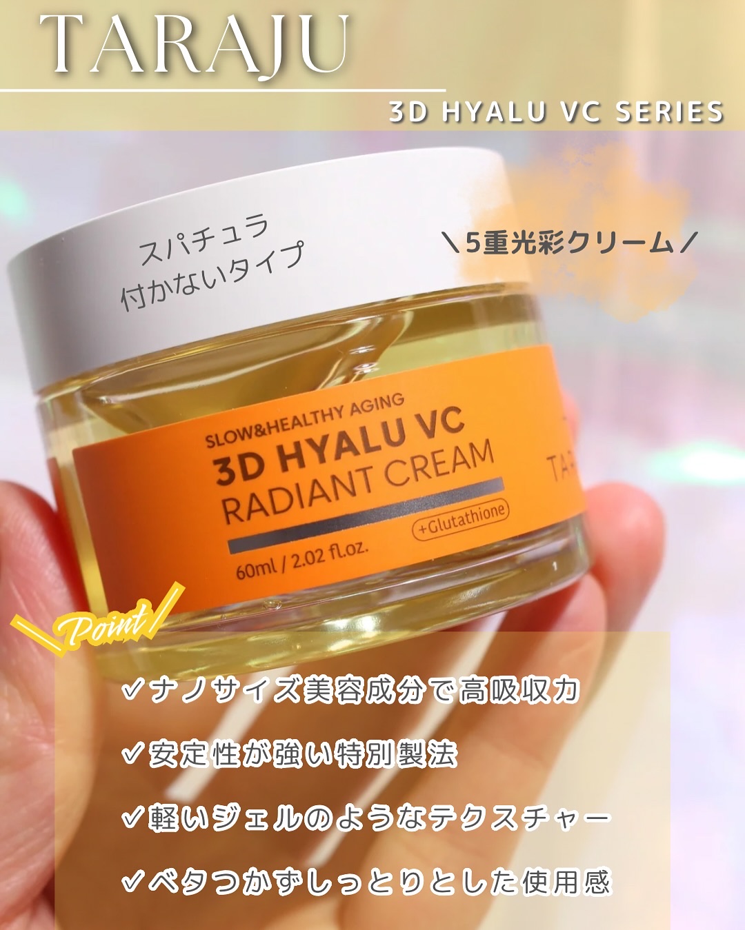 大熊製薬ブランドTARAJUの新商品! 3DヒアルVCシリーズ✨ 第3世代ビタミンC*のタラジュ3DナノビタミンC*配合のラインナップ。.。:+*° カプセルが入っていたり、ジェル状だったりと爽やかさのある見た目とは裏腹に全体的にしっとりとした肌触りになるシリーズでした🫧