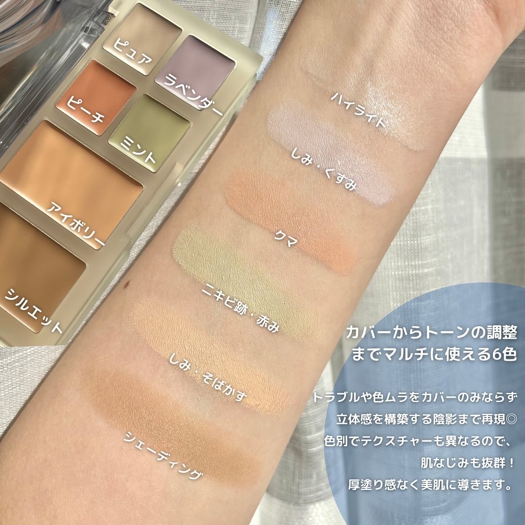 - 6色のカラーが入った、コンシーラーパレットで、コンシーラーとしてだけでなく、シェーディング、ハイライト、トーン調整が可能です。 ピーチ: クマカバーにおすすめ。保湿力が高く、ナチュラルなツヤ感です。 グリーン:ニキビや赤みのカバーにおすすめ。滑らかなテクスチャーで、カバー力が高いです。 パープル: くすみカバーにおすすめ。保湿力が高く、ナチュラルなツヤ感です。 ハイライト: 光の屈折を利用し、自然で柔らかい輝きを与えます。 シェーディング: 自然に影を演出し、しっかりと密着します。 コンシーラー: 滑らかなテクスチャーで、カバー力が高いです。