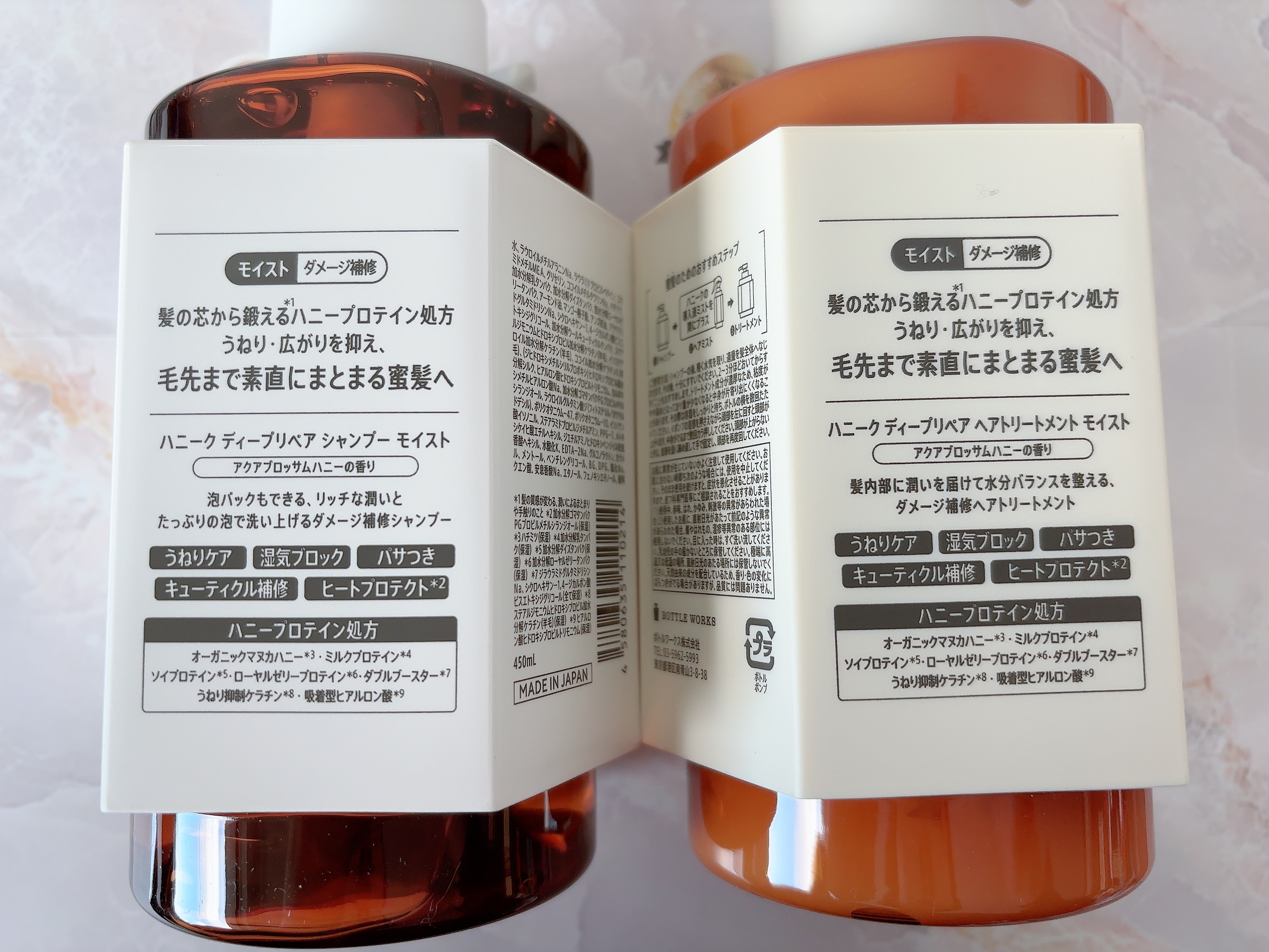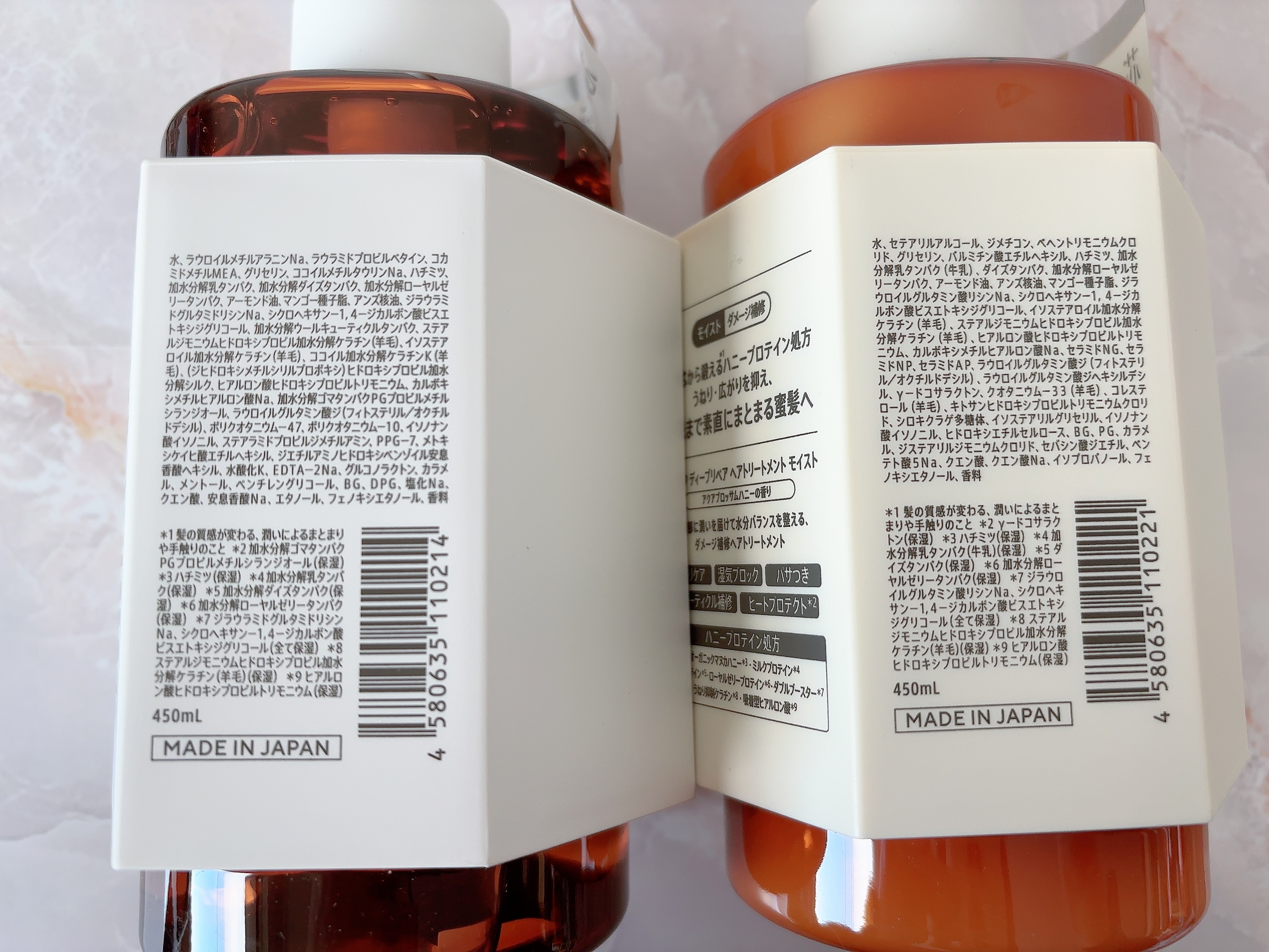 - <シャンプー本体 450ml> 水、ラウロイルメチルアラニンNa、ラウラミドプロピルベタイン、コカミドメチルMEA、グリセリン、ココイルメチルタウリンNa、ハチミツ、加水分解乳タンパク、加水分解ダイズタンパク、加水分解ローヤルゼリータンパク、アーモンド油、マンゴー種子脂、アンズ核油、ジラウラミドグルタミドリシンNa、シクロヘキサン-1,4-ジカルボン酸ビスエトキシジグリコール、加水分解ウールキューティクルタンパク、ステアルジモニウムヒドロキシプロピル加水分解ケラチン(羊毛)、イソステアロイル加水分解ケラチン(羊毛)、ココイル加水分解ケラチンK(羊毛)、(ジヒドロキシメチルシリルプロポキシ)ヒドロキシプロピル加水分解シルク、ヒアルロン酸ヒドロキシプロピルトリモニウム、カルボキシメチルヒアルロン酸Na、加水分解ゴマタンパクPGプロピルメチルシランジオール、ラウロイルグルタミン酸ジ(フィトステリル/オクチルドデシル)、ポリクオタニウム-47、ポリクオタニウム-10、イソノナン酸イソノニル、ステアラミドプロピルジメチルアミン、PPG-7、メトキシケイヒ酸エチルヘキシル、ジエチルアミノヒドロキシベンゾイル安息香酸ヘキシル、水酸化K、EDTA-2Na、グルコノラクトン、カラメル、メントール、ペンチレングリコール、BG、DPG、塩化Na、クエン酸、安息香酸Na、エタノール、フェノキシエタノール、香料 <トリートメント本体 450ml> 水、セテアリルアルコール、ジメチコン、ベヘントリモニウムクロリド、グリセリン、パルミチン酸エチルヘキシル、ハチミツ、加水分解乳タンパク(牛乳)、ダイズタンパク、加水分解ローヤルゼリータンパク、アーモンド油、アンズ核油、マンゴー種子脂、ジラウロイルグルタミン酸リシンNa、シクロヘキサン-1,4-ジカルボン酸ビスエトキシジグリコール、イソステアロイル加水分解ケラチン(羊毛)、ステアルジモニウムヒドロキシプロピル加水分解ケラチン(羊毛)、ヒアルロン酸ヒドロキシプロピルトリモニウム、カルボキシメチルヒアルロン酸Na、セラミドNG、セラミドNP、セラミドAP、ラウロイルグルタミン酸ジ(フィトステリル/オクチルドデシル)、ラウロイルグルタミン酸ジヘキシルデシル、γ-ドコサラクトン、クオタニウム-33(羊毛)、コレステロール(羊毛)、キトサンヒドロキシプロピルトリモニウムクロリド、シロキクラゲ多糖体、イソステアリルグリセリル、イソノナン酸イソノニル、ヒドロキシエチルセルロース、BG、PG、カラメル、ジステアリルジモニウムクロリド、セバシン酸ジエチル、ペンテト酸5Na、クエン酸、クエン酸Na、イソプロパノール、フェノキシエタノール、香料 <シャンプー詰替用 400ml> 水、ラウロイルメチルアラニンNa、ラウラミドプロピルベタイン、コカミドメチルMEA、グリセリン、ココイルメチルタウリンNa、ハチミツ、加水分解乳タンパク、加水分解ダイズタンパク、加水分解ローヤルゼリータンパク、アーモンド油、マンゴー種子脂、アンズ核油、ジラウラミドグルタミドリシンNa、シクロヘキサン-1,4-ジカルボン酸ビスエトキシジグリコール、加水分解ウールキューティクルタンパク、ステアルジモニウムヒドロキシプロピル加水分解ケラチン(羊毛)、イソステアロイル加水分解ケラチン(羊毛)、ココイル加水分解ケラチンK(羊毛)、(ジヒドロキシメチルシリルプロポキシ)ヒドロキシプロピル加水分解シルク、ヒアルロン酸ヒドロキシプロピルトリモニウム、カルボキシメチルヒアルロン酸Na、加水分解ゴマタンパクPGプロピルメチルシランジオール、ラウロイルグルタミン酸ジ(フィトステリル/オクチルドデシル)、ポリクオタニウム-47、ポリクオタニウム-10、イソノナン酸イソノニル、ステアラミドプロピルジメチルアミン、PPG-7、メトキシケイヒ酸エチルヘキシル、ジエチルアミノヒドロキシベンゾイル安息香酸ヘキシル、水酸化K、EDTA-2Na、グルコノラクトン、カラメル、メントール、ペンチレングリコール、BG、DPG、塩化Na、クエン酸、安息香酸Na、エタノール、フェノキシエタノール、香料 <トリートメント詰替用 400ml> 水、セテアリルアルコール、ジメチコン、ベヘントリモニウムクロリド、グリセリン、パルミチン酸エチルヘキシル、ハチミツ、加水分解乳タンパク(牛乳)、ダイズタンパク、加水分解ローヤルゼリータンパク、アーモンド油、アンズ核油、マンゴー種子脂、ジラウロイルグルタミン酸リシンNa、シクロヘキサン-1,4-ジカルボン酸ビスエトキシジグリコール、イソステアロイル加水分解ケラチン(羊毛)、ステアルジモニウムヒドロキシプロピル加水分解ケラチン(羊毛)、ヒアルロン酸ヒドロキシプロピルトリモニウム、カルボキシメチルヒアルロン酸Na、セラミドNG、セラミドNP、セラミドAP、ラウロイルグルタミン酸ジ(フィトステリル/オクチルドデシル)、ラウロイルグルタミン酸ジヘキシルデシル、γ-ドコサラクトン、クオタニウム-33(羊毛)、コレステロール(羊毛)、キトサンヒドロキシプロピルトリモニウムクロリド、シ