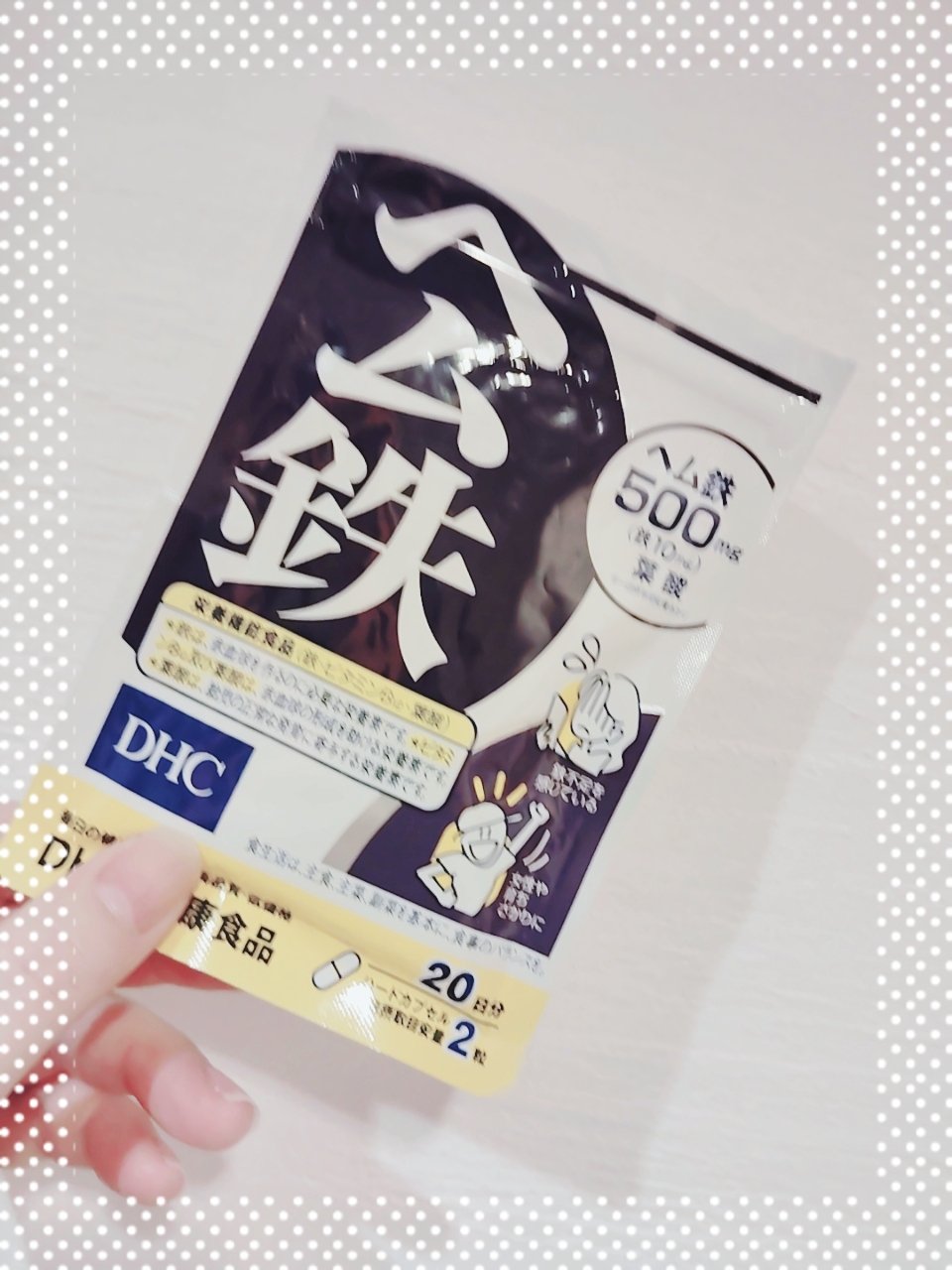 - 「ヘム鉄」は、とりわけ女性に不足しがちな鉄分を効率よく補えるサプリメントです。鉄分は身体への吸収率が悪く、カルシウムと並び積極的に補給したいミネラルの1つです。 さらに、ビタミンB12、葉酸をプラス。鉄不足が気になる方や、育ちざかりの方におすすめです。 栄養機能表示 ●鉄は、赤血球を作るのに必要な栄養素です。 ●ビタミンB12及び葉酸は、赤血球の形成を助ける栄養素です。 ●葉酸は、胎児の正常な発育に寄与する栄養素です。 ※本品は、多量摂取により疾病が治癒したり、より健康が増進するものではありません。一日の摂取目安量を守ってください。 ※葉酸は、胎児の正常な発育に寄与する栄養素ですが、多量摂取により胎児の発育が良くなるものではありません。 ※本品は、特定保健用食品と異なり、消費者庁長官による個別審査を受けたものではありません。 ※水またはぬるま湯でお召し上がりください。 【名称】 ヘム鉄加工食品 【原材料名】 ヘム鉄、ゼラチン、グリセリン脂肪酸エステル、セルロース、着色料(カラメル、酸化チタン)、微粒二酸化ケイ素、葉酸、ビタミンB12 【栄養成分表示[2粒692mgあたり]】 熱量2.8kcal、たんぱく質0.48g、脂質0.07g、炭水化物0.06g、食塩相当量0.025g、鉄10.0mg(147)、葉酸75μg(31)、ビタミンB12 1.0μg(42) *鉄はヘム鉄として500mg配合しています。 上記( )内の値は、栄養素等表示基準値(18歳以上、基準熱量2200kcal)に占める割合[%]です。 【飲み方】 一日の摂取目安量2粒 アレルギー物質 ゼラチン ※一日の目安量を守って、お召し上がりください。 ※お身体に異常を感じた場合は、摂取を中止してください。 ※特定原材料及びそれに準ずるアレルギー物質を対象範囲として表示しています。原材料をご確認の上、食物アレルギーのある方はお召し上がりにならないでください。 ※薬を服用中あるいは通院中の方、妊娠中の方は、お医者様にご相談の上お召し上がりください。 ●直射日光、高温多湿な場所をさけて保存してください。 ●お子様の手の届かないところで保管してください。 ●開封後はしっかり開封口を閉め、なるべく早くお召し上がりください。 食生活は、主食、主菜、副菜を基本に、食事のバランスを。
