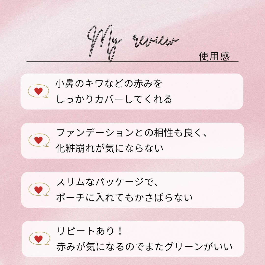 - <クリア> 有効成分 ナイアシンアミド その他の成分 グリチルリチン酸ジカリウム、テトラ2-ヘキシルデカン酸アスコルビル、天然ビタミンE、ヒドロキシアパタイト、酸化亜鉛、エイジツエキス、アーティチョークエキス、エクトイン、N-ステアロイルフィトスフィンゴシン、ヒアルロン酸ナトリウム(2)、異性化糖、1,2-ペンタンジオール、1,3-ブチレングリコール、精製水、ポリアクリル酸アルキル、ステアリン酸、トリ2-エチルヘキサン酸グリセリル、イソステアリン酸、イソノナン酸イソノニル、合成金雲母、パラメトキシケイ皮酸2-エチルヘキシル、2,4-ビス-[{4-(2-エチルヘキシルオキシ)-2-ヒドロキシ}-フェニル]-6-(4-メトキシフェニル)-1,3,5-トリアジン、アクリル酸・メタクリル酸アルキル共重合体、キサンタンガム、水酸化カリウム、フェノキシエタノール、酸化チタン、雲母チタン、n-オクチルシリル化酸化チタン、黄酸化鉄、ベンガラ、無水ケイ酸、マイカ <ピンク> 有効成分 ナイアシンアミド その他の成分 グリチルリチン酸ジカリウム、テトラ2-ヘキシルデカン酸アスコルビル、天然ビタミンE、ヒドロキシアパタイト、酸化亜鉛、エイジツエキス、アーティチョークエキス、エクトイン、N-ステアロイルフィトスフィンゴシン、ヒアルロン酸ナトリウム(2)、異性化糖、1,2-ペンタンジオール、1,3-ブチレングリコール、精製水、ポリアクリル酸アルキル、ステアリン酸、トリ2-エチルヘキサン酸グリセリル、イソステアリン酸、イソノナン酸イソノニル、合成金雲母、パラメトキシケイ皮酸2-エチルヘキシル、2,4-ビス-[{4-(2-エチルヘキシルオキシ)-2-ヒドロキシ}-フェニル]-6-(4-メトキシフェニル)-1,3,5-トリアジン、アクリル酸・メタクリル酸アルキル共重合体、キサンタンガム、水酸化カリウム、フェノキシエタノール、酸化チタン、雲母チタン、n-オクチルシリル化酸化チタン、n-オクチルシリル化ベンガラ、グンジョウ、無水ケイ酸、カオリン、マイカ <グリーン> 有効成分 ナイアシンアミド その他の成分 グリチルリチン酸ジカリウム、テトラ2-ヘキシルデカン酸アスコルビル、天然ビタミンE、ヒドロキシアパタイト、酸化亜鉛、エイジツエキス、アーティチョークエキス、エクトイン、N-ステアロイルフィトスフィンゴシン、ヒアルロン酸ナトリウム(2)、異性化糖、1,2-ペンタンジオール、1,3-ブチレングリコール、ジプロピレングリコール、精製水、ポリアクリル酸アルキル、ステアリン酸、トリ2-エチルヘキサン酸グリセリル、イソステアリン酸、イソノナン酸イソノニル、合成金雲母、パラメトキシケイ皮酸2-エチルヘキシル、2,4-ビス-[{4-(2-エチルヘキシルオキシ)-2-ヒドロキシ}-フェニル]-6-(4-メトキシフェニル)-1,3,5-トリアジン、アクリル酸・メタクリル酸アルキル共重合体、キサンタンガム、ポリオキシエチレンベヘニルエーテル、ポリオキシエチレンラウリルエーテルリン酸ナトリウム、水酸化カリウム、フェノキシエタノール、酸化チタン、雲母チタン、n-オクチルシリル化酸化チタン、酸化クロム、無水ケイ酸、マイカ <クリア(サンリオクロミデザイン)> 有効成分 ナイアシンアミド その他の成分 グリチルリチン酸ジカリウム、テトラ2-ヘキシルデカン酸アスコルビル、天然ビタミンE、ヒドロキシアパタイト、酸化亜鉛、エイジツエキス、アーティチョークエキス、エクトイン、N-ステアロイルフィトスフィンゴシン、ヒアルロン酸ナトリウム(2)、異性化糖、1,2-ペンタンジオール、1,3-ブチレングリコール、精製水、ポリアクリル酸アルキル、ステアリン酸、トリ2-エチルヘキサン酸グリセリル、イソステアリン酸、イソノナン酸イソノニル、合成金雲母、パラメトキシケイ皮酸2-エチルヘキシル、2,4-ビス-[{4-(2-エチルヘキシルオキシ)-2-ヒドロキシ}-フェニル]-6-(4-メトキシフェニル)-1,3,5-トリアジン、アクリル酸・メタクリル酸アルキル共重合体、キサンタンガム、水酸化カリウム、フェノキシエタノール、酸化チタン、雲母チタン、n-オクチルシリル化酸化チタン、黄酸化鉄、ベンガラ、無水ケイ酸、マイカ <ピンク(サンリオクロミデザイン)> 有効成分 ナイアシンアミド その他の成分 グリチルリチン酸ジカリウム、テトラ2-ヘキシルデカン酸アスコルビル、天然ビタミンE、ヒドロキシアパタイト、酸化亜鉛、エイジツエキス、アーティチョークエキス、エクトイン、N-ステアロイルフィトスフィンゴシン、ヒアルロン酸ナトリウム(2)、異性化糖、1,2-ペンタンジオール、1,3-ブチレングリコール、精製水、ポリアクリル酸アルキル、ステアリン酸、トリ2-エチルヘキサン酸グリセリル、イソステアリン酸、イソノナン酸イソノニル、合成金雲母、パラメトキシケイ皮酸2-エチルヘキシル、2,4-ビス-[{4-(2-エチルヘキシルオキシ)-2-ヒドロキシ}-フェニル]-6-(4-メトキシフェニル)-1,3,5-トリアジン、アクリル酸・メタクリル酸アルキル共重合体、キサンタンガム、水酸化カリウム、フェノキシエタノール、酸化チタン、雲母チタン、n-オクチ