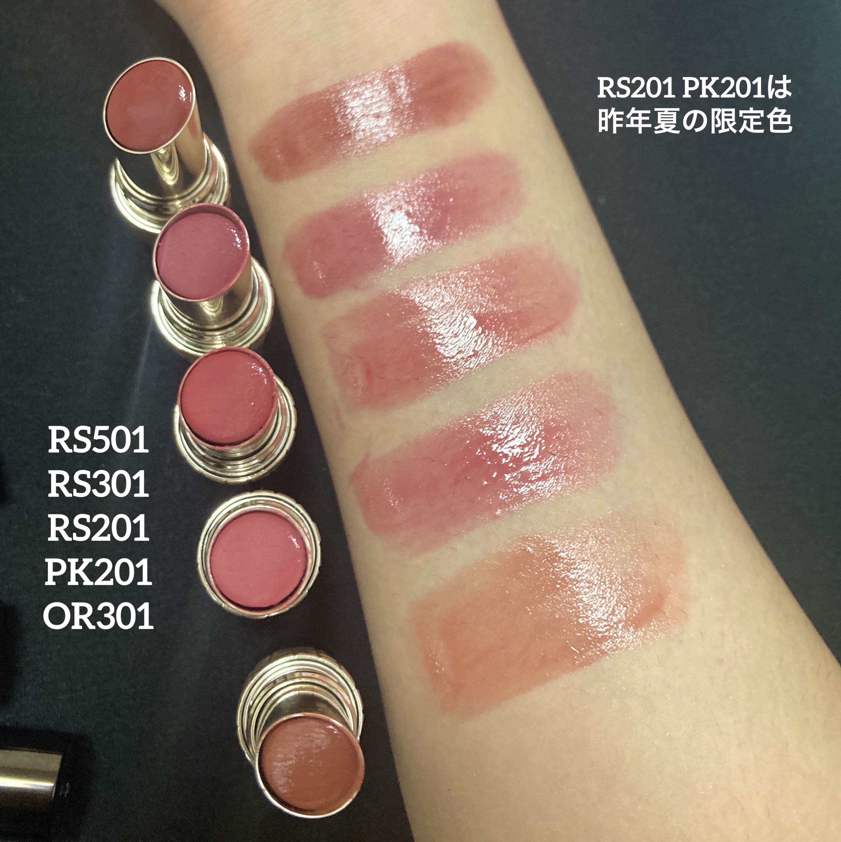 やや硬さが有りながらも、とろりと滑らかに 塗布しやすいリップ とろり塗りはスティックと近い発色となり 素の唇ながら、しっかりと色も感じる仕上がり どちらの塗り方でもシアー感が有り素の唇から 離れ過ぎず浮かない仕上がり
