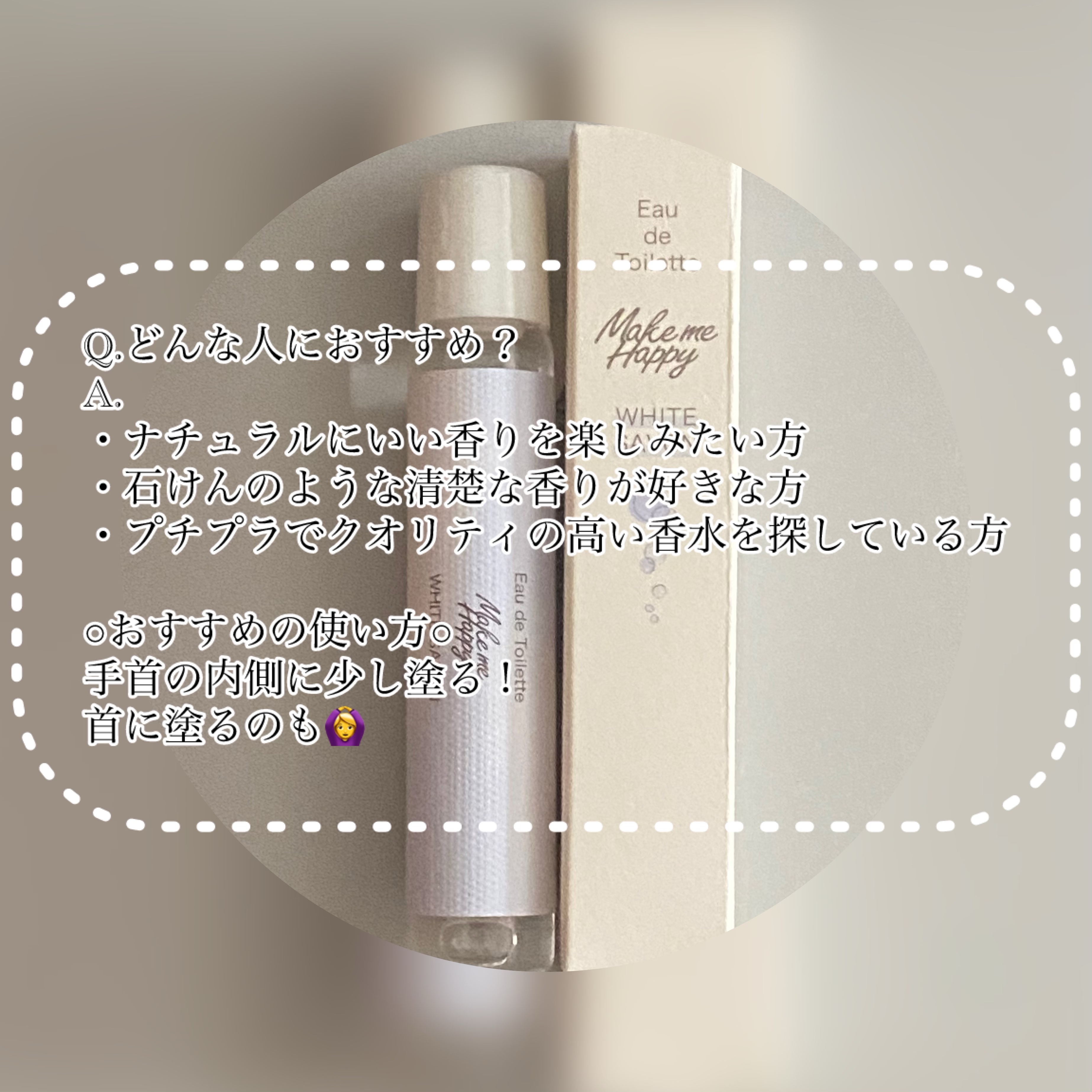つける量を調整しやすい、ロールオンタイプのオードトワレです。 持ち運びにも便利なサイズ! 正直、「これはちょっと…」っと思うような、きつすぎる香りはなく(個人の意見です笑)、ふわっと香る良い香りがたくさんありました。 メイクミーハッピー オードトワレ WHITE ~白い花束をイメージした柔らかい香り~ 💬柔らかいフローラルの香りで、上品です