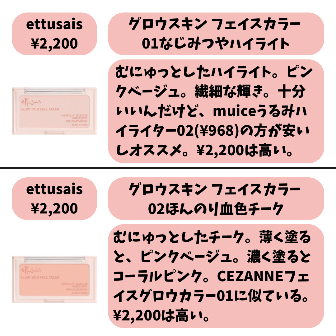 エテュセのフェイスカラー、待ってましたー!! もうね、ほんとうに使用感がよかった✨ うるおいが長時間続くスキンケア仕立てでテクスチャーだけでなく肌もしっとりが続く🫧 01 なじみつやハイライト 繊細な輝きでうるおったツヤ肌を演出 白浮しないピンクベージュ♡