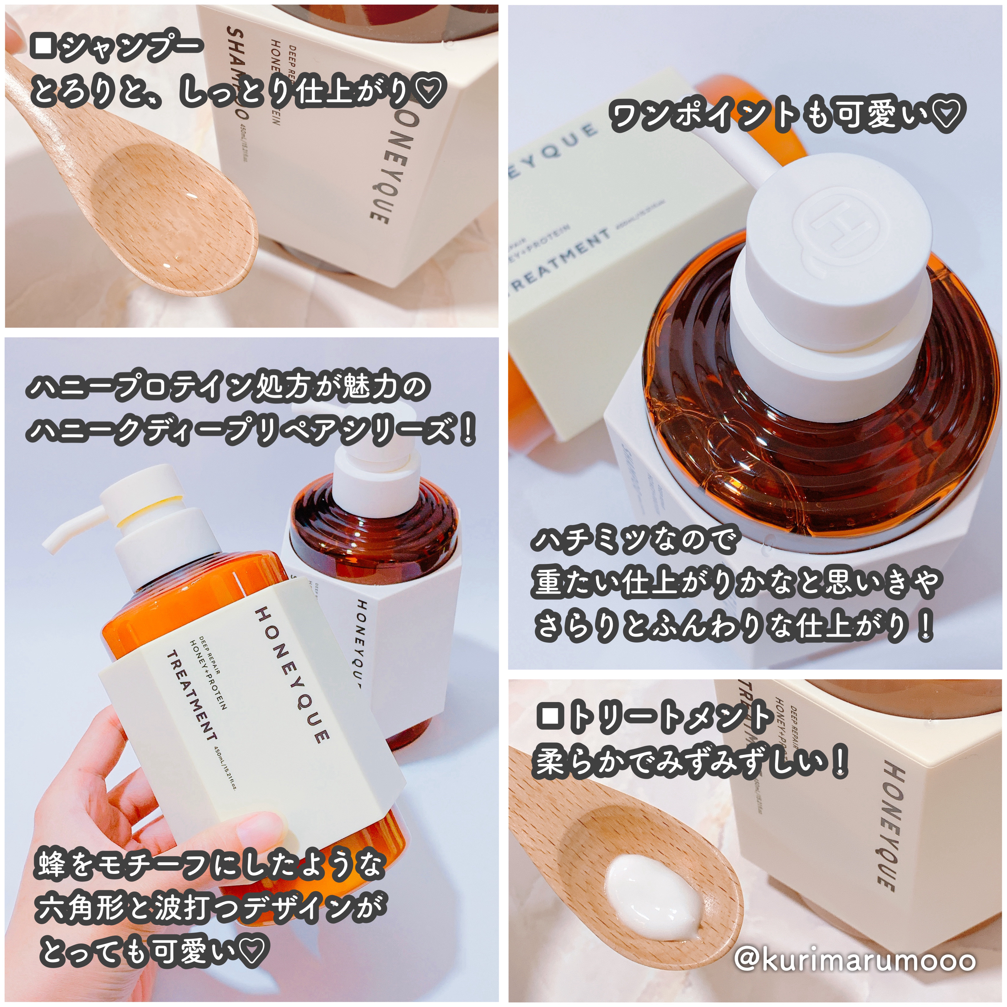 髪内部の水分量を保持して芯から集中補修する ハニープロテイン処方でうねり・広がりを抑え毛先まで素直にまとまる髪へ導きます。 ふわっふわの泡がたつシャンプー。 しっとり感があるのに仕上がりはさらりと軽めに仕上がるトリートメント。 あま〜い蜂蜜の香りふんわりと浴室に広がります🍯 ̟ ꒷꒦