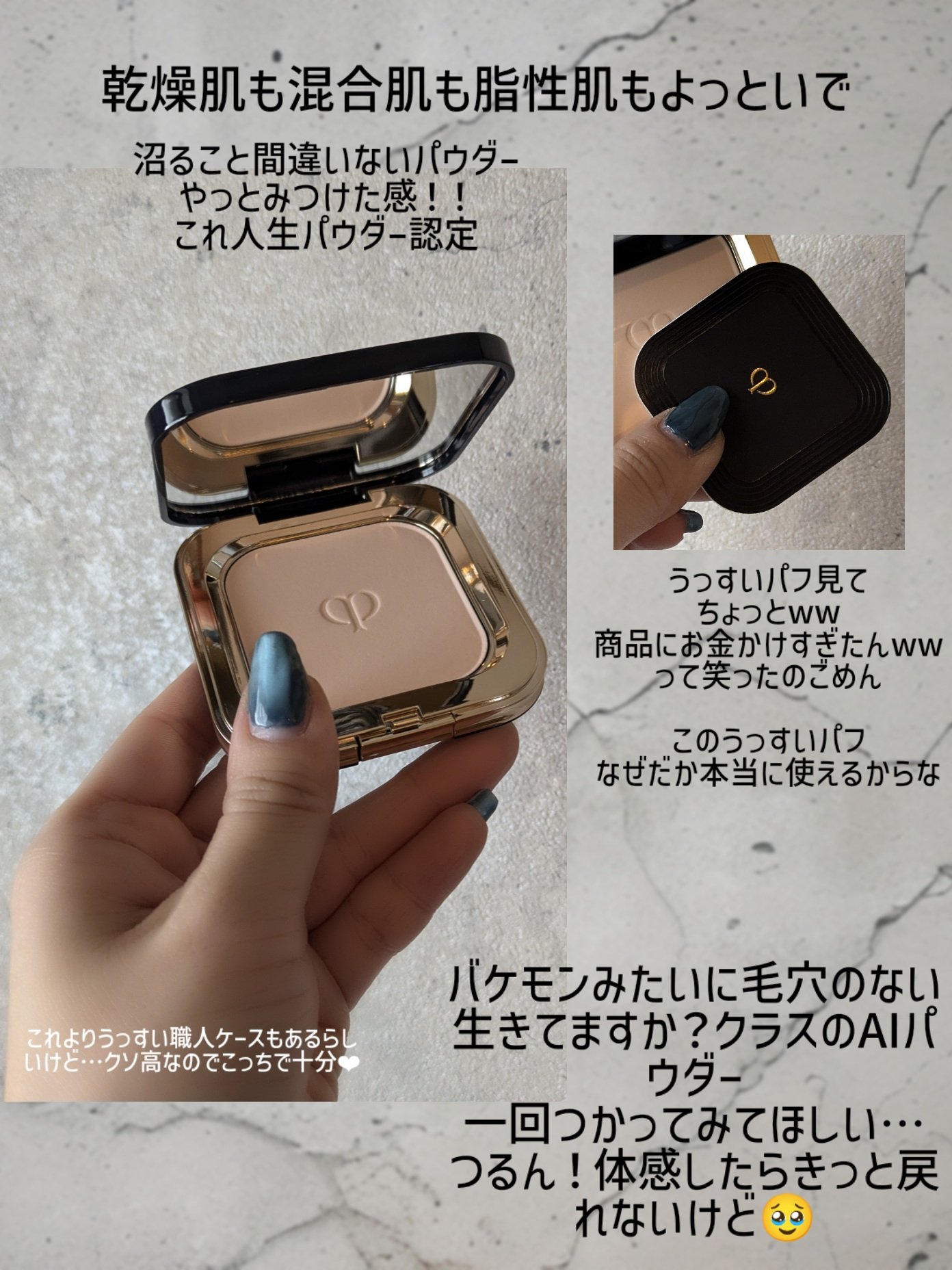 高級なケースで購入してしまった すごいパウダー👍 職人さんが1つ1つ手作りで作ってるケースで一生モノになりそうなぐらい高級感✨ ほんとにAI搭載してるかのようにその時の肌の状態に合わせてパウダーが変わる!!