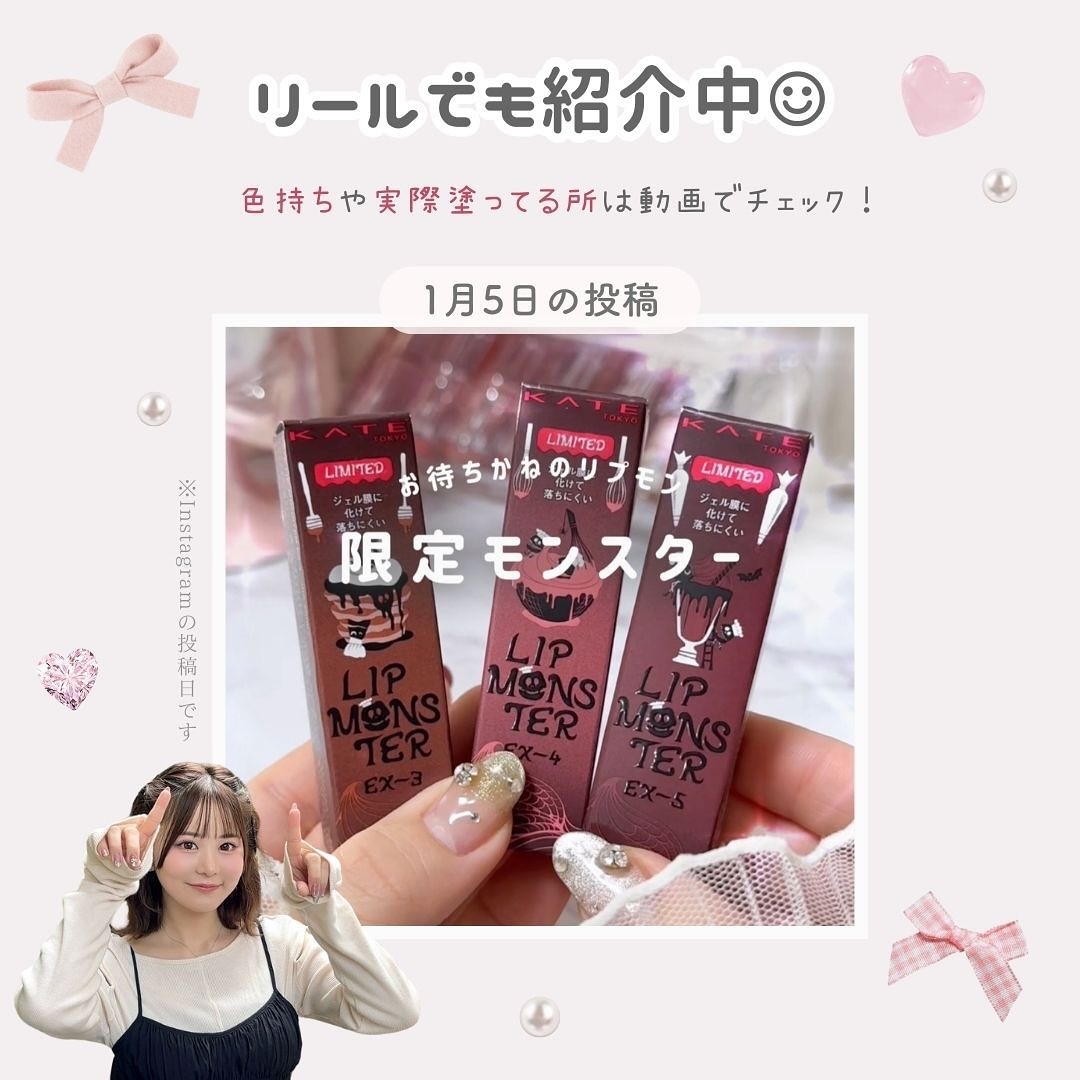 - 落ちにくさも美発色もよくばりたい、つけたての色が長時間持続する人気の口紅リップモンスター。 唇から蒸発する水分を活用して密着ジェル膜に変化する独自技術※で、つけたての色が長時間持続。 高発色&保湿。 ※当社独自の色持ち技術 ■花火のようにまぶしくきらめく 繊細なラメが際立つ限定色 EX-6 ピンクカラー×青ラメ【ロケット花火流星群】 EX-7 オレンジカラー×黄&緑ラメ【100万発の線香花火】 EX-8 レッドカラー×緑ラメ【打ち上げ花火ブランコ】 ■深みレッド系カラーの限定色 EX-9 戦慄の喜笑 (限定色) EX-10 狂気の怒号 (限定色) 【2025クリスマスコフレ】 落ちにくいリップモンスターから、唇の血色感を底上げする ホリデーシーズン限定の熱感ニュアンスベージュ系カラー登場。 EX-11 紅煙宿る贈り物(限定色):ボルドーベージュ系 EX-12 盗まれた1224mの星光(限定色):キャメルベージュ系