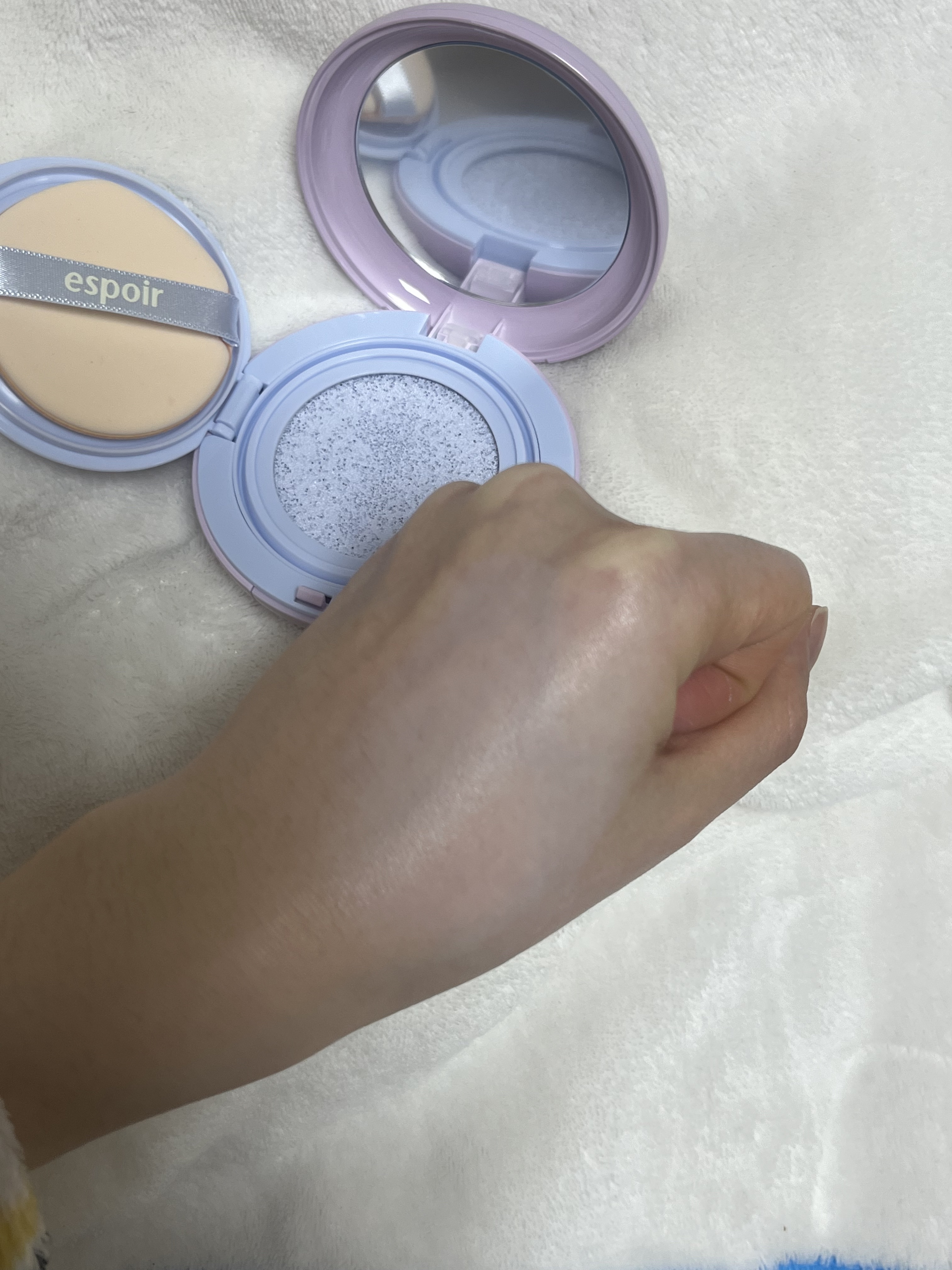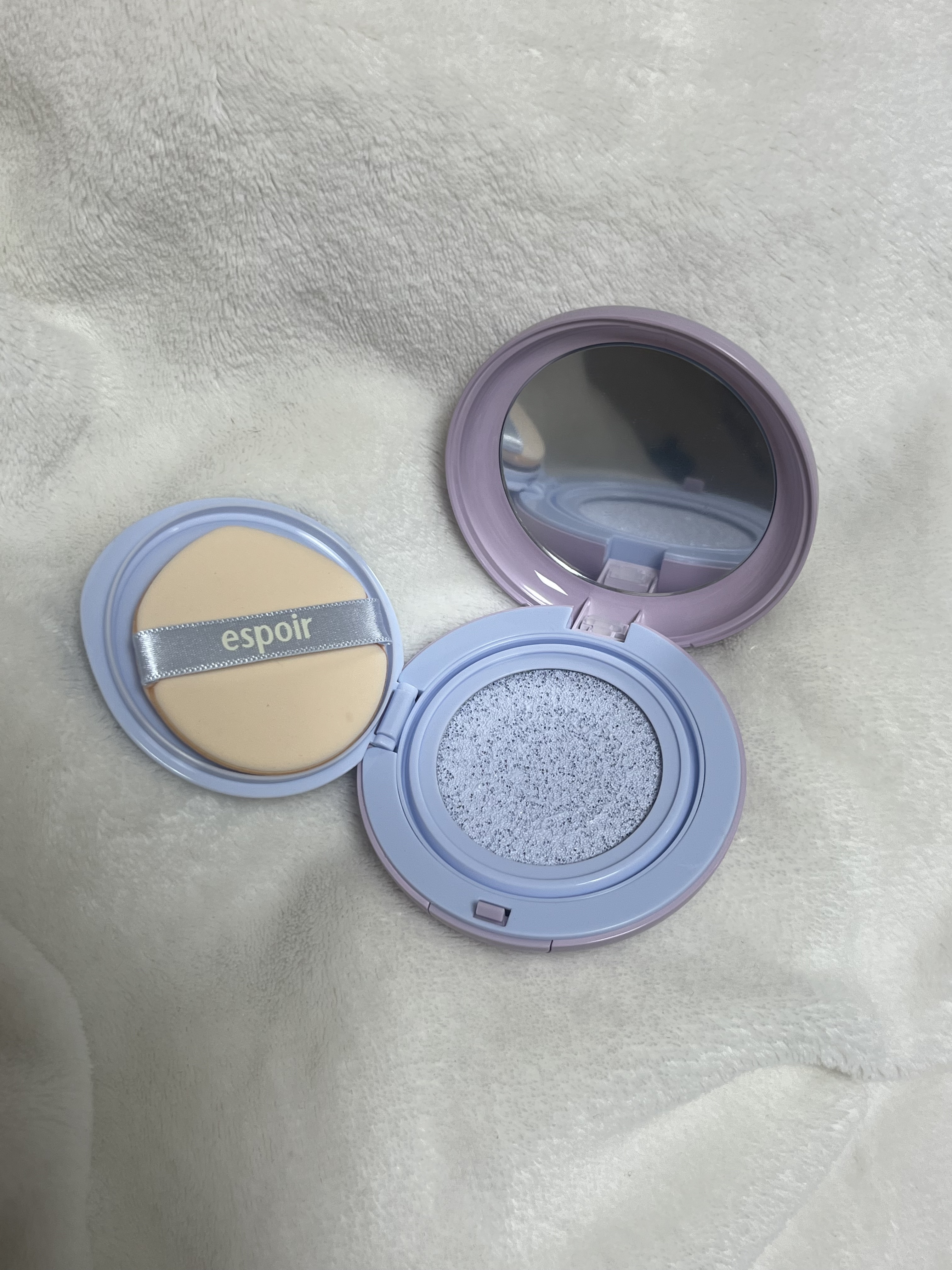 エスプアのクッションファンデのパフはいつもこんなにふわふわで大好き💕 塗った感じは水色が濃いかなと思ったのですが、馴染ませて肌に馴染んで肌が白く見える😚❤️ わたしがブルベ夏なので、くすんだ肌がトーンアップして見えてさらに透明感がでます✨👍 高保湿ヒアルロン酸が含まれているからか冬でもしっとりとした肌でいられます🥰