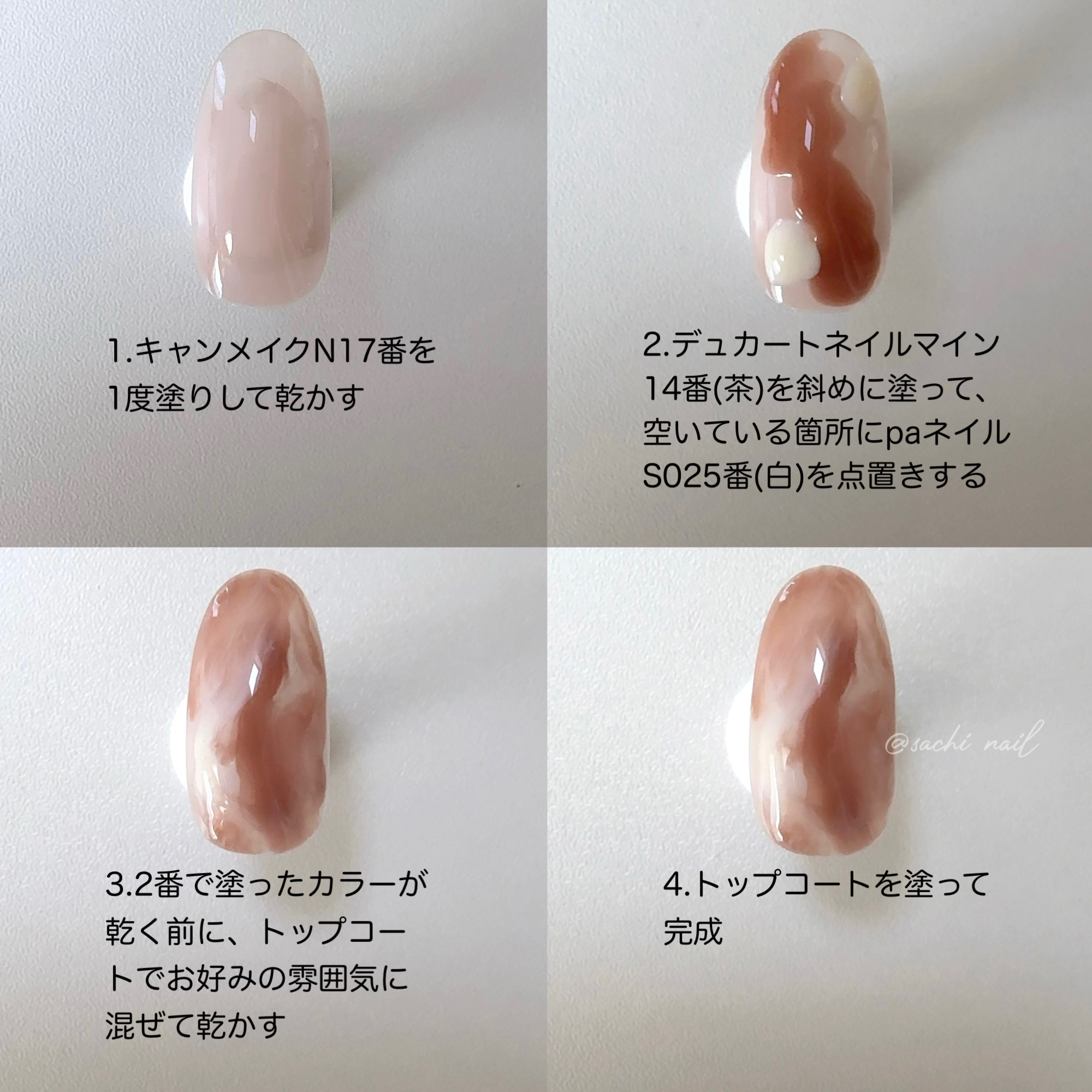 ワンカラーでも指ごとに色を変えるだけでオシャレに見えます💕 画像のようにゴールドラインとストーンを少し足すだけで華やかさがアップ🥰 何度かご紹介したことのあるスポンジで作るグラデーションです✨ スポンジを使うことで境目が綺麗に馴染んでくれます💕 アルミホイルの上でブラウンとトップコートを1:1くらいで混ぜたものを、トップコートのハケに取って3箇所に塗るだけ👌 事前に混ぜたものを塗ることで、爪の上でぼかすより簡単に出来ます💕 ベースカラーが乾く前に点置きしてぼかすことで綺麗にぼかせます✨ スピードが大事なので、使うポリッシュのキャップは全て開けておきましょう😊 天然石のラインはガタガタの方がより天然石っぽく見えるので、ラインを描くのが苦手な方でも大丈夫🙆♀️ 難しそうに見えて、やってみると意外と簡単に出来ます♡