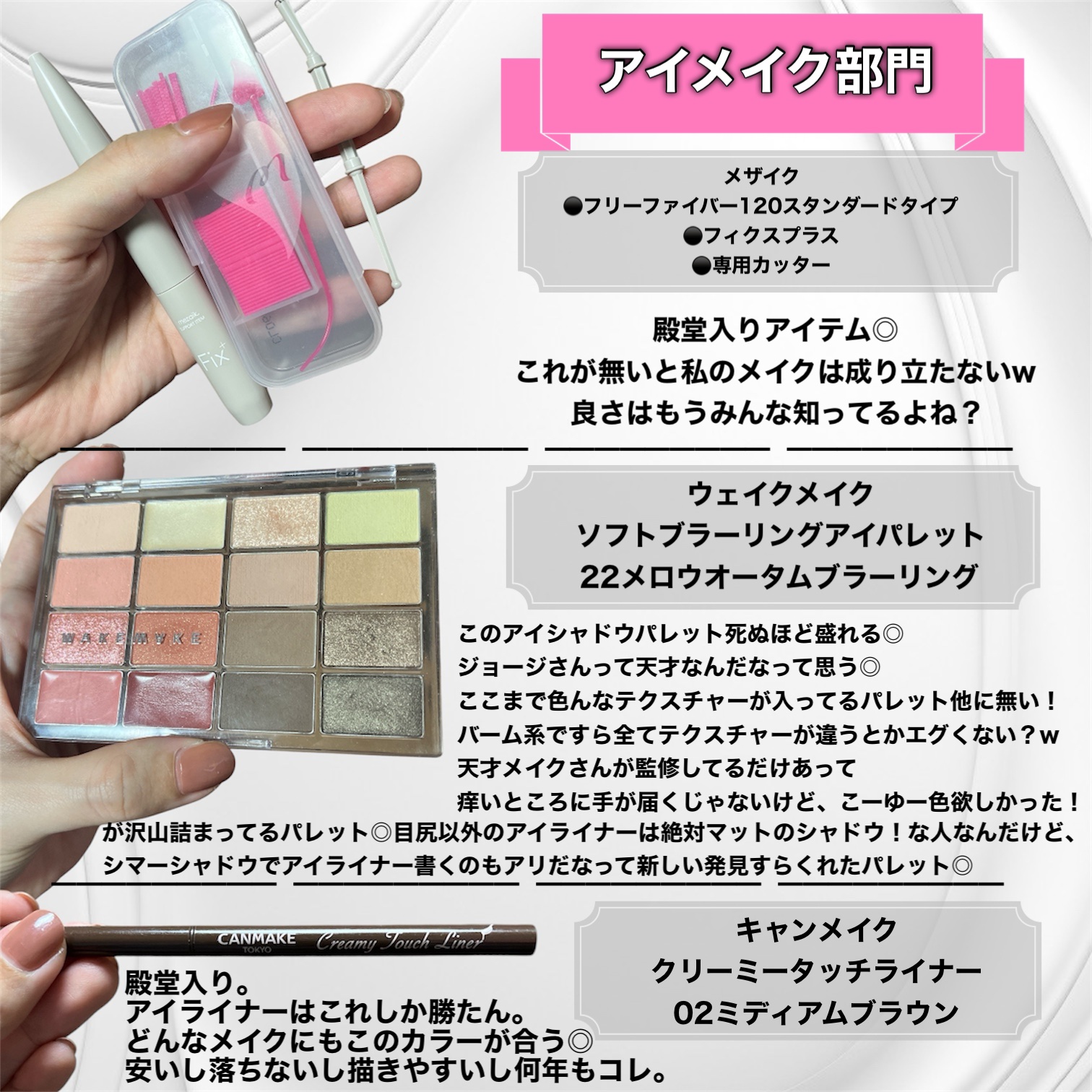 暖かみのあるオレンジやブラウンがなつめぐにとって1番盛れる◎ テクスチャーはシマーを使うとシワシワに見えて事故る事が多いのでマットのアイテムが好き◎ これはまぢで私にとって画期的だった◎ 眉尻の毛が無くて、夏に汗とかで消える事が悩みだったんだけどこれはガチで消えない◎ このアイシャドウパレット死ぬほど盛れる◎ ジョージさんって天才なんだなって思う◎