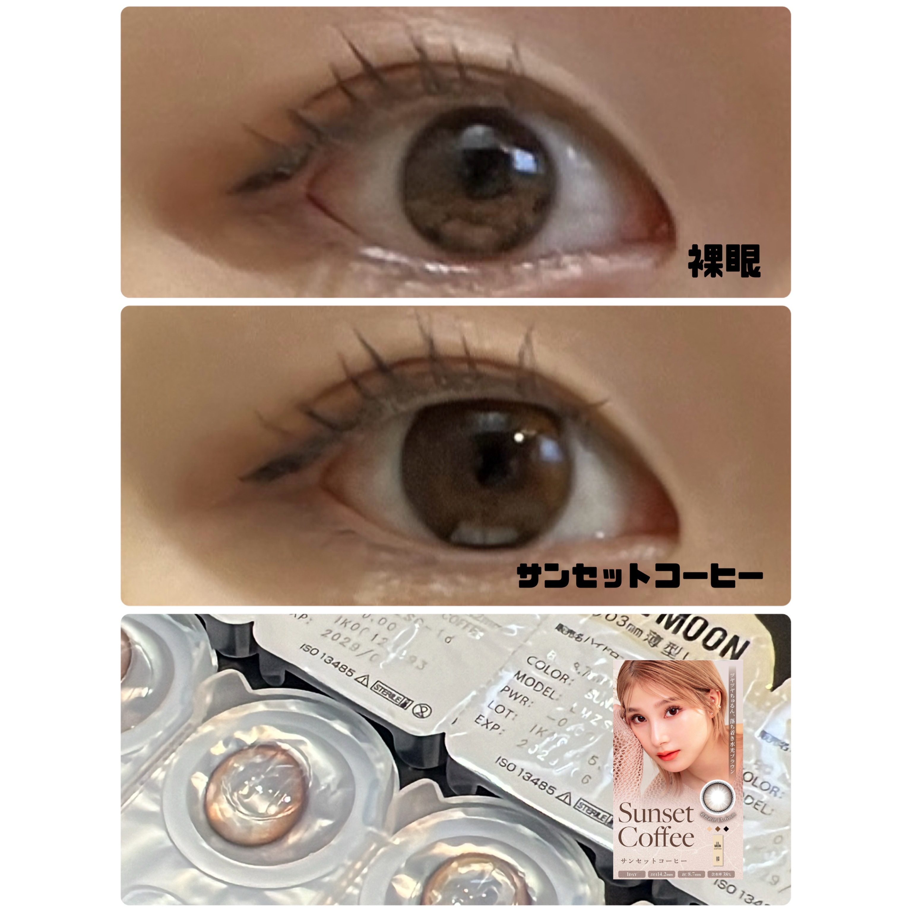 - "ZERO”感つけ心地、きらめきUP! (1)全度数0.03mm極薄*1*2 LILMOON(リルムーン)「0.03シリーズ」は、全度数レンズの中心厚が0.03㎜で、レンズが薄く厚みが少ない分、まるで裸眼のような快適な付け心地で異物感を感じにくいです。 (2) 全度数酸素透過率DK/t:45 『LIL MOON(リルムーン)』0.03シリーズは全度数レンズの酸素透過率DK/t:45、従来の含水率38%通常厚レンズと比べ2倍以上*2の酸素透過率を実現し、酸素不足による充血を軽減。高い保水力を持つMPCポリマーを保存液に配合し、乾燥や目のゴロゴロ感を軽減。 (3)気分で選べるクリアレンズとカラーレンズ 多彩な瞳も、自然な瞳も,カラコンとクリアレンズ、どちらも揃う。カラコンお試しサイズ2枚入りを用意、気軽にお試しできちゃう。幅広いラインナップで、瞳に自信と輝きをプラス、毎日のスタイルを自由に楽しめる! <クラッシュグレー> センス◎!やりすぎないアクセントで、馴染みのいいアッシュグレーアイ <サンセットコーヒー> ちゅるんと透明感UP演出! 落ち着いた水光ブラウンアイ <ジェントルピンク> クリっと瞳を際立たせるふんわり太フチと、 優しいほんのりピンクアイ <ゼロインク> ダークウッドをイメージしたブラックレンズ、透明感あふれるクリっとした瞳 <ゼロヘーゼル> 大人っぽいブラウンに差し込む ヘーゼルカラー、オシャレなブラウンアイ <ゼロチャコール> 落ち着いたダークグレーにブルー でアクセント、クールな大人アイ <レイクブルー> ほどよいフチ感で立体感見え重視、深みのあるダークブルーアイ *1:使用感には個人差があります *2:当社製品比較 カラーコンタクトレンズの不適正使用による眼障害の危険性等などがあります。 ●コンタクトレンズは高度管理医療機器です。不十分な洗浄・消毒など不適切なケアや、長時間・交換期間を超えた装用により、アレルギー性結膜炎、角膜感染症、角膜潰瘍等の重篤な眼障害が発生する危険性があります ●ご使用前に取扱説明書を確認してください 使用上の留意事項 ●眼科医院等を受診してからお求めください ●眼に異常を感じたら直ちにレンズ使用を中止し、お近くの眼科等で診察を受けてください ●医師の指示にしたがってご使用ください ●コンタクトレンズを装用する場合、自覚症状がなくても、眼科医院等での定期検査を受けてください ●レンズに不具合がある場合は使用しないでください