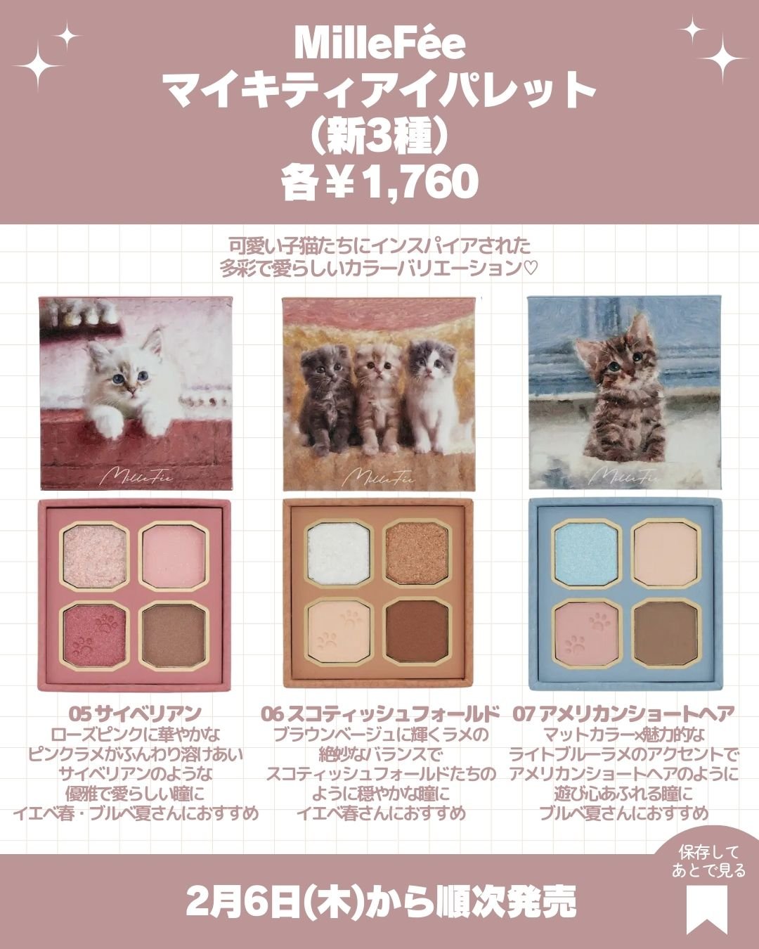 マイキティアイパレット(新色全3色)¥1,760円 発売日 02月06日 05 サイベリアン ローズピンクに華やかなピンクラメがふんわり溶けあい 優雅で愛らしい瞳に 06 スコティッシュフォールド ブラウンベージュに輝くラメの絶妙なバランスで 穏やかな瞳に
