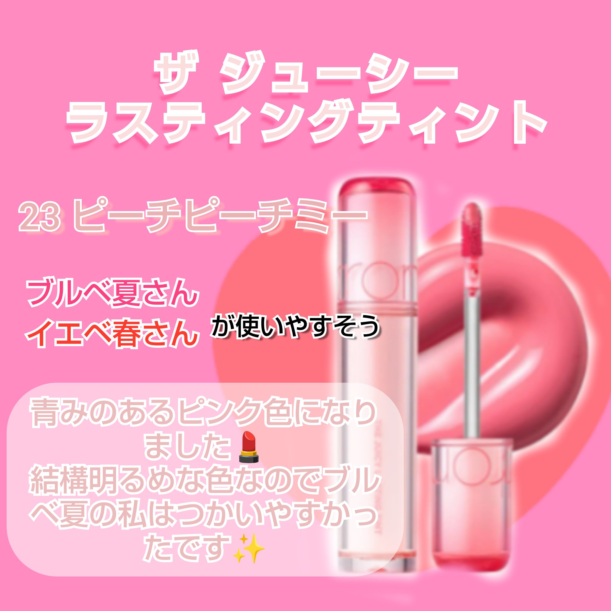 | リップティントランキング第3位 | 重ねて塗っても、ちゅるんと透け感が残って明るめカラーがとっても映える…💕色残りも◎ | 詳細を見る | ||