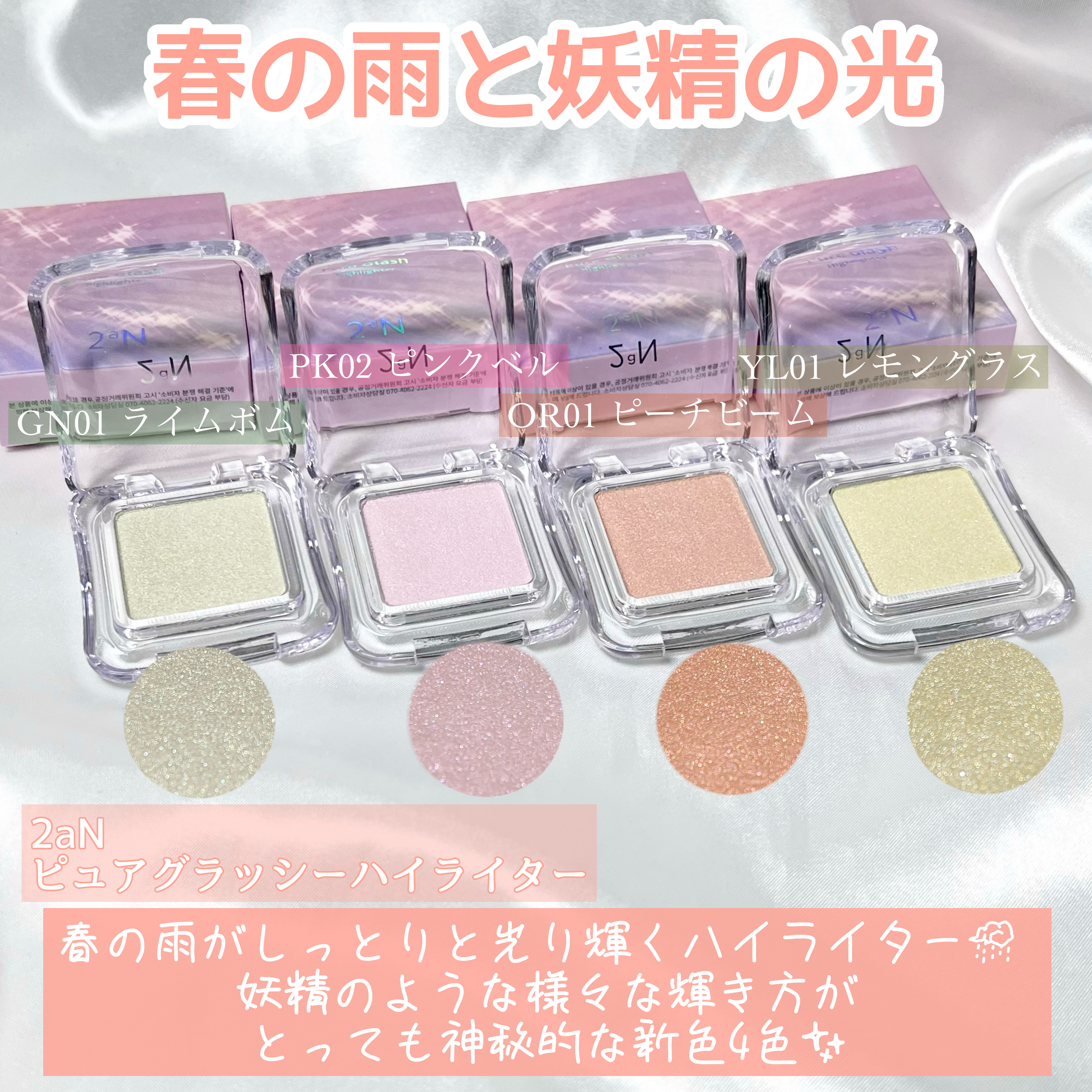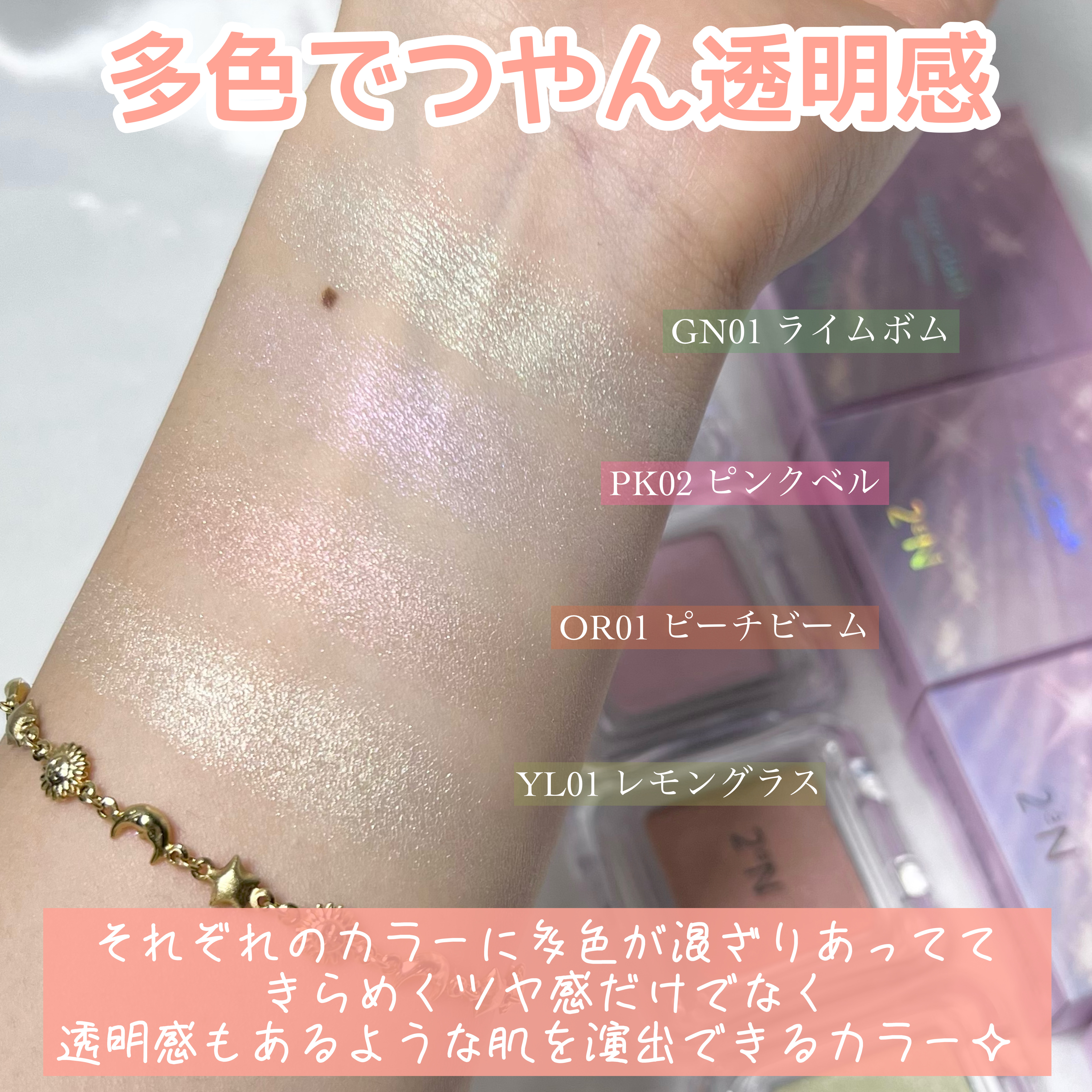 ふんわりした発色でめちゃくちゃ使いやすい! 11 ドリーミングが可愛すぎるぅぅぅ🌈*゜ とくに、ピーチビームが刺さった…🥴❤️🔥 4つの中ではライムとレモンはペカーんと光ります。 すべてが多幸感コスメだった🤤🌱