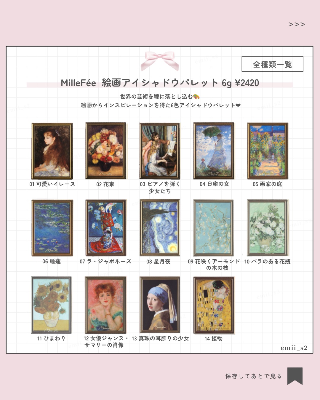 - <01 可愛いイレーヌ> タルク、マイカ、ジメチコン、テトライソステアリン酸ペンタエリスリチル、合成フルオロフロゴパイト、シリカ、酸化チタン、酸化鉄、窒化ホウ素、ステアリン酸Mg、カオリン、トリエトキシカプリリルシラン、ホウケイ酸(Ca/Na)、1,2-ヘキサンジオール、グンジョウ、PG、ヒドロキシアセトフェノン、ペンチレングリコール、黄5、赤201、酸化スズ、水酸化Al <02 花束> タルク、マイカ、ジメチコン、酸化鉄、シリカ、テトライソステアリン酸ペンタエリスリチル、酸化チタン、ステアリン酸Mg、合成フルオロフロゴパイト、水添ポリイソブテン、パルミチン酸エチルヘキシル、窒化ホウ素、トリエトキシカプリリルシラン、カオリン、ポリエチレン、ホウケイ酸(Ca/Na)、PET、1,2-ヘキサンジオール、PG、ポリイソブテン、ヒドロキシアセトフェノン、ペンチレングリコール、黄5、水酸化Al、赤201、黄4、酸化スズ、アクリレーツコポリマー <03 ピアノを弾く少女たち> タルク、マイカ、ジメチコン、テトライソステアリン酸ペンタエリスリチル、シリカ、酸化チタン、酸化鉄、カオリン、フェニルトリメチコン、合成フルオロフロゴパイト、窒化ホウ素、ステアリン酸Mg、トリエトキシカプリリルシラン、(ジメチコン/ビニルジメチコン)クロスポリマー、ポリエチレン、1,2-ヘキサンジオール、PG、ヒドロキシアセトフェノン、ペンチレングリコール、黄5、赤201、黄4、水酸化Al、酸化スズ <04 日傘の女> タルク、マイカ、ジメチコン、合成フルオロフロゴパイト、シリカ、テトライソステアリン酸ペンタエリスリチル、酸化チタン、窒化ホウ素、酸化鉄、トリエトキシカプリリルシラン、ステアリン酸Mg、カオリン、1,2-ヘキサンジオール、PG、リンゴ酸ジイソステアリル、ビスジグリセリルポリアシルアジペート-2、ヒドロキシアセトフェノン、ペンチレングリコール、黄5、グンジョウ、赤201、水酸化Al、酸化スズ <05 画家の庭> タルク、マイカ、酸化チタン、シリカ、ジメチコン、水添ポリイソブテン、酸化鉄、テトライソステアリン酸ペンタエリスリチル、合成フルオロフロゴパイト、カオリン、ステアリン酸Mg、ポリエチレン、トリエトキシカプリリルシラン、1,2-ヘキサンジオール、PG、ホウケイ酸(Ca/Al)、ヒドロキシアセトフェノン、黄4、黄5、水酸化Al、ペンチレングリコール、赤202、酸化スズ <06 睡蓮> タルク、合成フルオロフロゴパイト、酸化チタン、シリカ、マイカ、酸化鉄、ジメチコン、窒化ホウ素、ポリエチレン、テトライソステアリン酸ペンタエリスリチル、カオリン、ステアリン酸Mg、グンジョウ、トリエトキシカプリリルシラン、ラウロイルリシン、1,2-ヘキサンジオール、PG、ホウケイ酸(Ca/Al)、ヒドロキシアセトフェノン、水酸化Al、黄5、ペンチレングリコール、赤202、酸化スズ <07 ラ・ジャポネーズ> タルク、合成フルオロフロゴパイト、マイカ、酸化鉄、シリカ、酸化チタン、水添ポリイソブテン、ジメチコン、窒化ホウ素、テトライソステアリン酸ペンタエリスリチル、カオリン、ステアリン酸Mg、トリエトキシカプリリルシラン、1,2-ヘキサンジオール、ラウロイルリシン、PG、ホウケイ酸(Ca/Al)、コンジョウ、ヒドロキシアセトフェノン、黄5、酸化スズ、赤226、ペンチレングリコール、水酸化Al <08 星月夜> マイカ、ジメチコン、合成フルオロフロゴパイト、ホウケイ酸(Ca/Al)、トリ(カプリル酸/カプリン酸)グリセリル、酸化鉄、合成ワックス、酸化チタン、ミリスチン酸Mg、トリメチルシロキシケイ酸、パルミチン酸エチルヘキシル、シリカ、タルク、ホウケイ酸(Ca/Na)、フェノキシエタノール、コンジョウ、カプリリルグリコール、リンゴ酸ジイソステアリル、水酸化Al、赤226、酢酸トコフェロール、カーボンブラック、(ジメチコン/ビニルジメチコン)クロスポリマー、エチルヘキシルグリセリン、青1、酸化スズ、トリエトキシカプリリルシラン、黄4 <09 花咲くアーモンドの木の枝> タルク、マイカ、ジメチコン、酸化チタン、合成フルオロフロゴパイト、合成ワックス、ホウケイ酸(Ca/Al)、トリ(カプリル酸/カプリン酸)グリセリル、ホウケイ酸(Ca/Na)、シリカ、ミリスチン酸Mg、パルミチン酸エチルヘキシル、酸化鉄、ホウケイ酸(Ca/チタン)、トリメチルシロキシケイ酸、フェノキシエタノール、トリエトキシカプリリルシラン、リンゴ酸ジイソステアリル、マンガンバイオレット、窒化ホウ素、カプリリルグリコール、ステアリルジメチコン、ポリイソブテン、(ジメチコン/ビニルジメチコン)クロスポリマー、水酸化Al、赤226、酢酸トコフェロール、酸化スズ、エチルヘキシルグリセリン、グンジョウ、マイクロクリスタリンワックス、水添野菜油、カオリン、ミツロウ、ステアリン酸ステアリル、水添パーム油脂肪酸、コンジョウ <10 バラのある花瓶> タルク、マイカ、ジメチコン、酸化チタン、ホウケイ酸(Ca/Al)、酸化鉄、トリ(カプリル酸/カプリン酸)グリセリル、合成ワックス、合成フルオロフロゴパイト、
