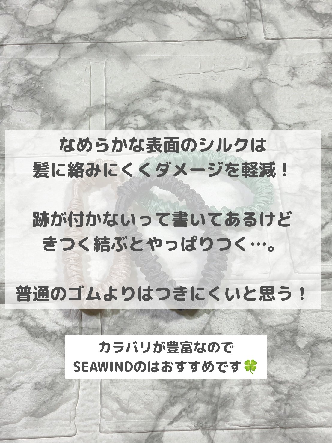髪が絡まりにくくていいですよ。 腕につけておいても変じゃないし、家事する時やご飯食べる時にくくってます☺️ カラバリも多くて可愛いです🙂↕️ ヘアケアしてる方におすすめ! SEAWIND シルクヘアゴム。